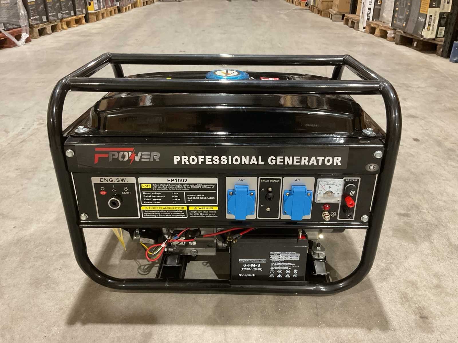 Voorzien van Vermogen: 3,5 KW; 4-takt Benzine motor; Luchtgekoeld; Accu; Elektrische start; 2x 230V stopcontacten; zekering; Geluidsniveau: ca. 68–72 dB(A) @ 7 m; Stalen buisframe; Trillingsdempers; ongebruikt in doos Merk: Fpower Type: FP1002 met accu 3,5kW Luchtgekoeld: true