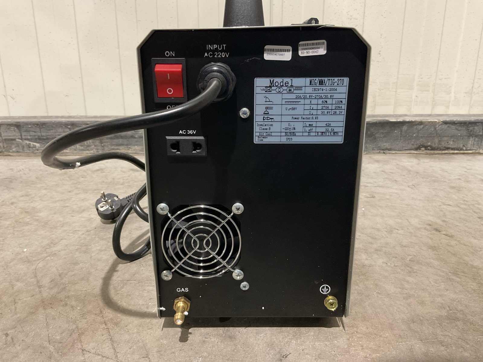 Voorzien van Stroomspanning 220V: Enkelfase; Frequentie (HZ): 50/60; Nominale spanning (V): 21-30; Uitgangsstroom (A): 20-270; Invoercapaciteit: 4.5; Dienstcyclus (%): 60; Draadtoevoersnelheid: 0-10; Efficiëntie (%): 85; Vermogensfactor: 0,93; Isolatiegraad: F; Behuizingsgraad/beschermingsgraad: Ip21; G.W/N.W (KG): 11/8.07; Afmetingen (MM): 515x245x350; ongebruikt in doos Merk: Kraft pro+ Type: MIG/MMA/TIG-270 Bouwjaar: 2025 Mig type: true Tig type: true Draagbaar: true Inschakelduur: 85% Aansluiting: 220V Machinegewicht: 11.7kg Afmeting l: 510mm Afmeting b: 250mm Afmeting h: 345mm