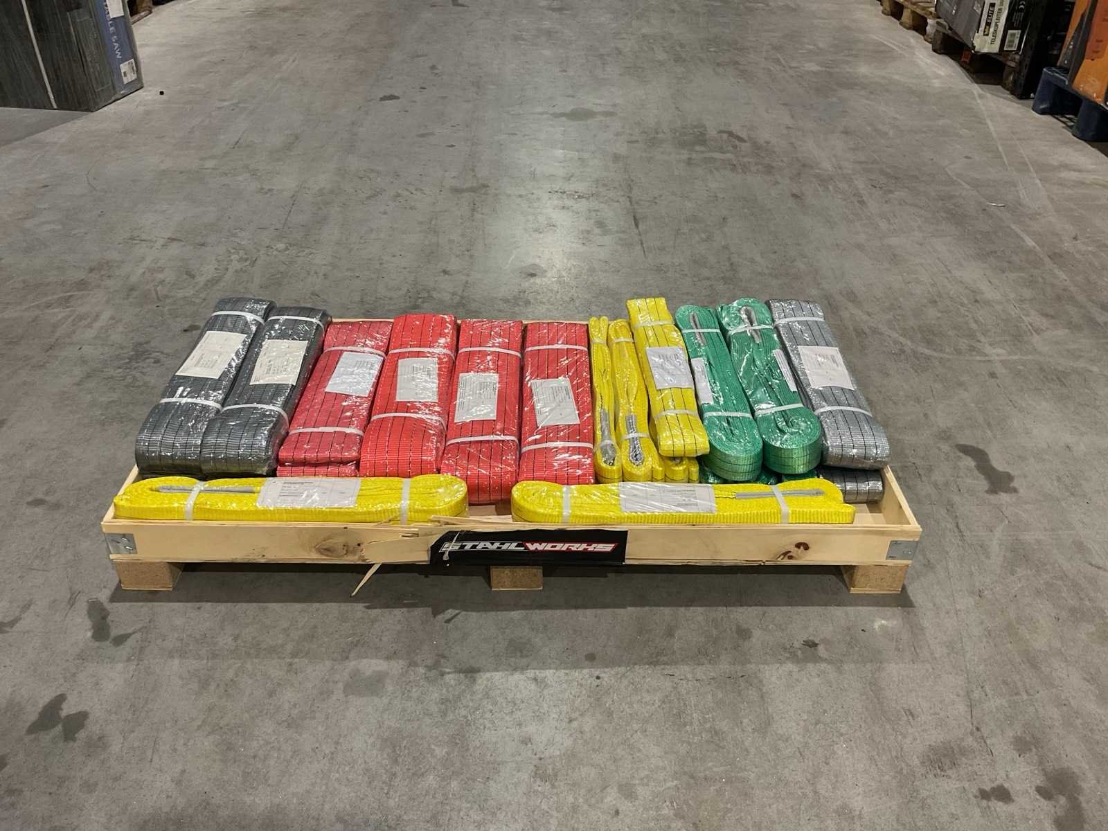 2x grijs swl4000kg 2meter sf 6 times mbs 24T - 2x grijs swl4000kg 4meter sf 6 times mbs 24T - 2x grijs swl4000kg 6meter sf 6 times mbs 24t - 2x groen swl2000kg 2meter sf 6 times mbs12T - 2x groen swl2000kg 4meter sf 6 times mbs12T -2x groen swl2000kg 6 meter sf 6 times mbs 12T - 2x geel swl3000kg 2 meter sf 6 times mbs 18T - 2x geel swl3000kg 4 meter sf 6 times mbs 18T - 2x geel swl3000kg 6 meter sf 6 times mbs 18T - 2x rood swl5000kg 4 meter sf 6 times mbs 30T - 2x rood swl5000kg 6 meter sf 6 times mbs 30T Merk: STAHLWORKS Type: Hijsbanden Bouwjaar: 2025 Afmeting l: 1225mm Afmeting b: 650mm Afmeting h: 200mm