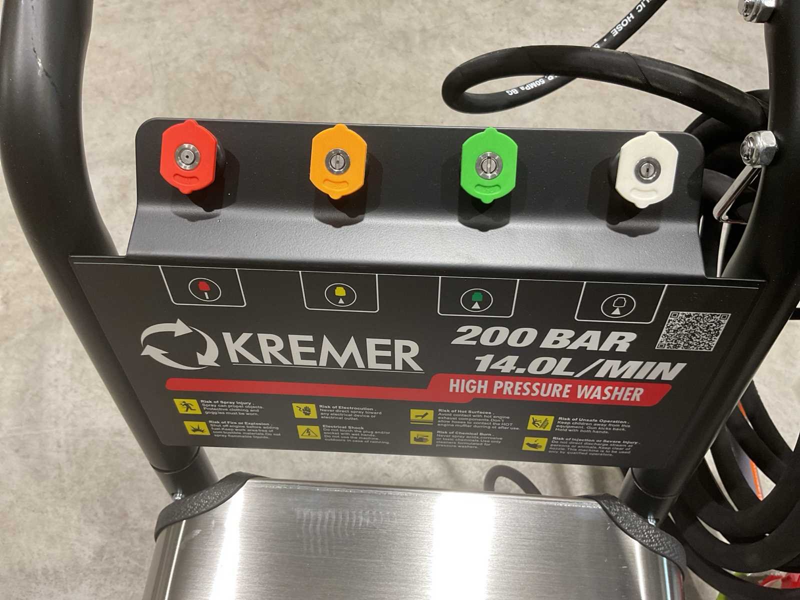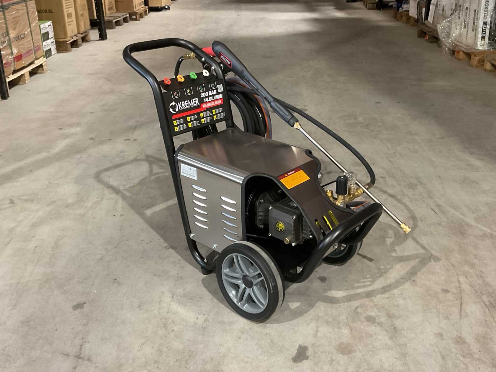 Voorzien van 10M hogedrukslang, staal gevlochten; Roestvrij stalen deksel; koperen triplex zuigerpomp; Stroomsnelheid water: 3.7GPM 14.0L/MIN; 200 bar; Snelheid: 1450 rpm; 4.0kw; 380V; Gewicht( KGS): 68; Afmetingen L*B*H(MM): 730*545*620; Ongebruikt in doos (Afmeting transport verpakking 730x545x620 mm lxbxh, gewicht 68 kg) Merk: Kremer Type: KR-2900-4.0T4 Bouwjaar: 2025 Maximale werkdruk: 200bar Temperatuurbereik min.: 0°c Temperatuurbereik max.: 60°c Capaciteit.: 840l/hr Mobiel: true Vermogen: 4kW Aansluiting: 380V Eigen gewicht: 68kg Totale afmeting L: 730mm Totale afmeting Breedte: 545mm Totale afmeting Hoogte: 620mm