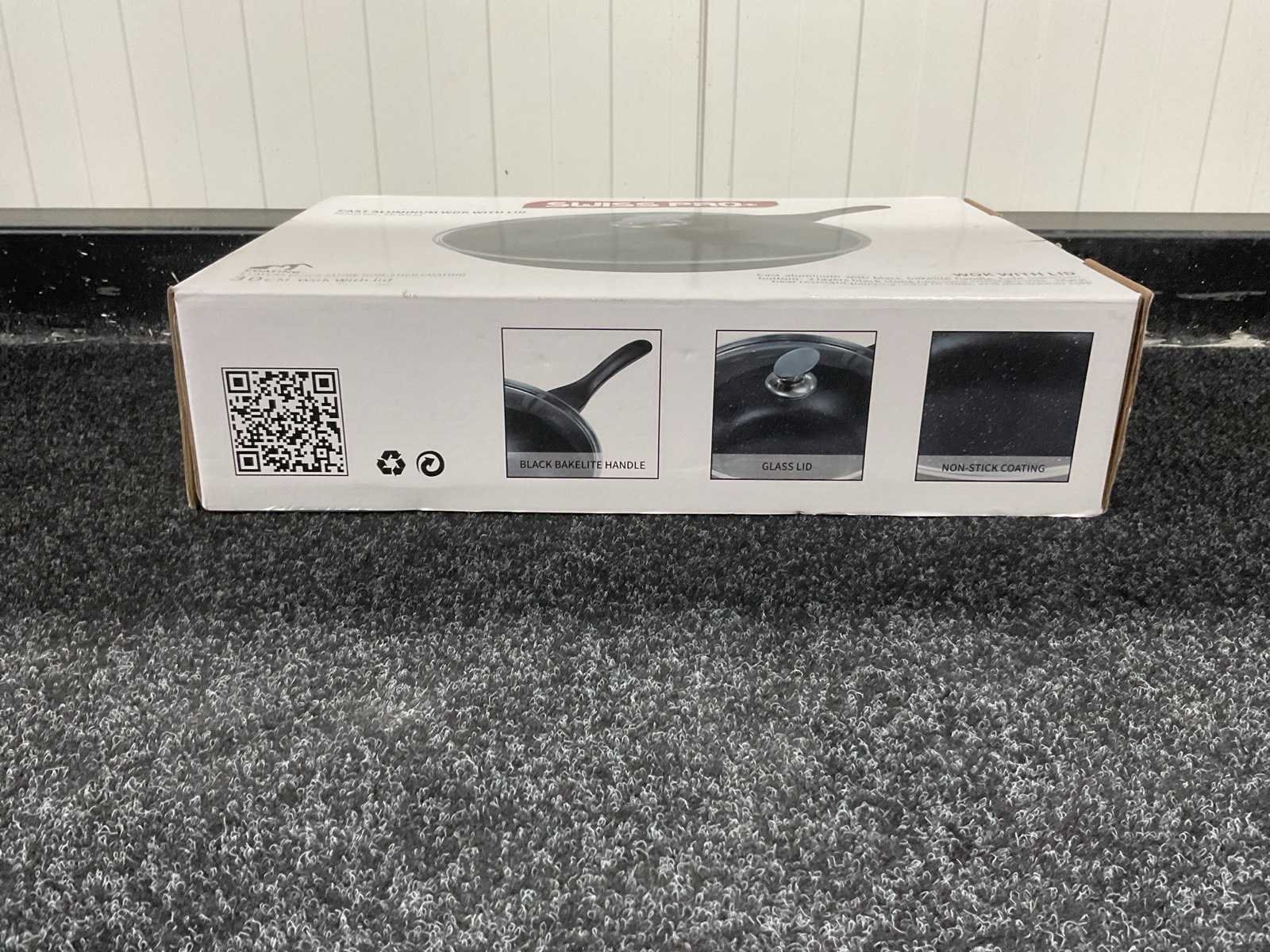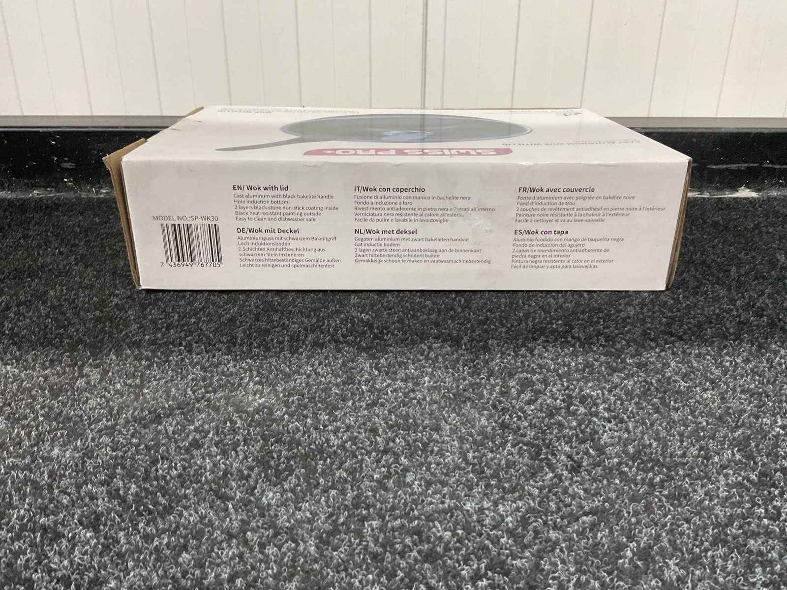 Voorzien van gegoten aluminium; cool touch handgreep; inductie bodem; anti-baklaag; glazen deksel met stoomontluchting; ongebruikt in doos Merk: Swiss Pro + Model: SP-WK30 Product type: Wok Kleur: Zwart Gewicht: 2300g Lengte: 50cm Breedte: 31.5cm Hoogte: 12.5cm