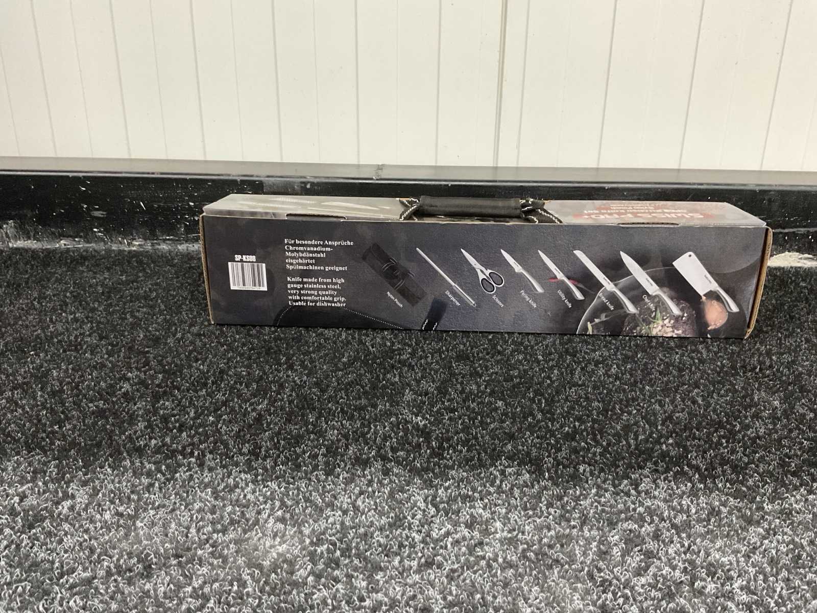 Voorzein van roestvrij staal; kunstof ergonomisch anti slip handgreep; hakmes; koksmes; broodmes; universeel mes; schil mes; dunschiller; messenslijper; messenstandaard; ongebruikt in doos Merk: Swiss Pro+ Type: SP-KS08 Totale afmeting L: 475mm Totale afmeting Breedte: 90mm Totale afmeting Hoogte: 10mm Materiaal: Stainless steel Eigen gewicht: 1.4kg