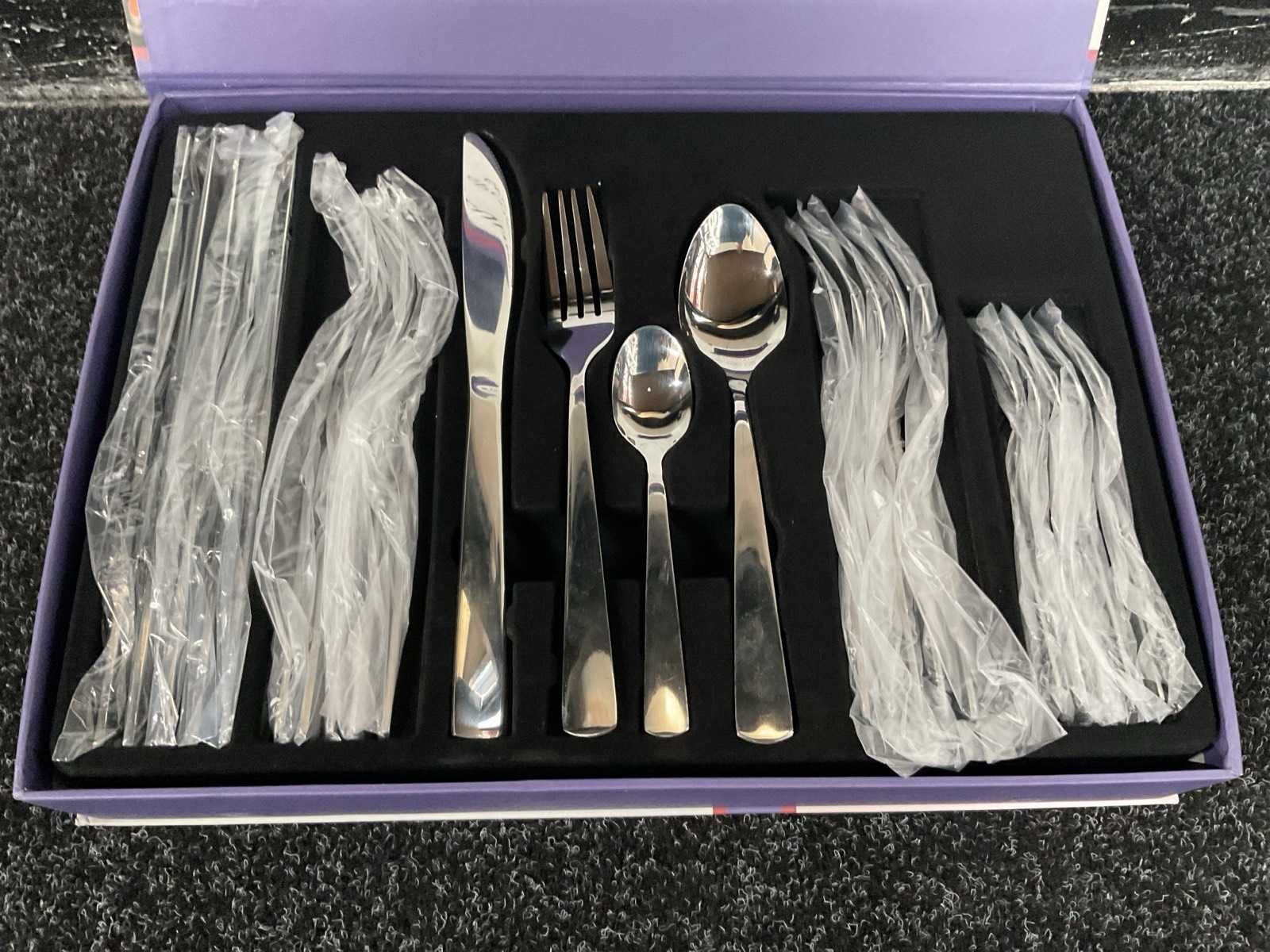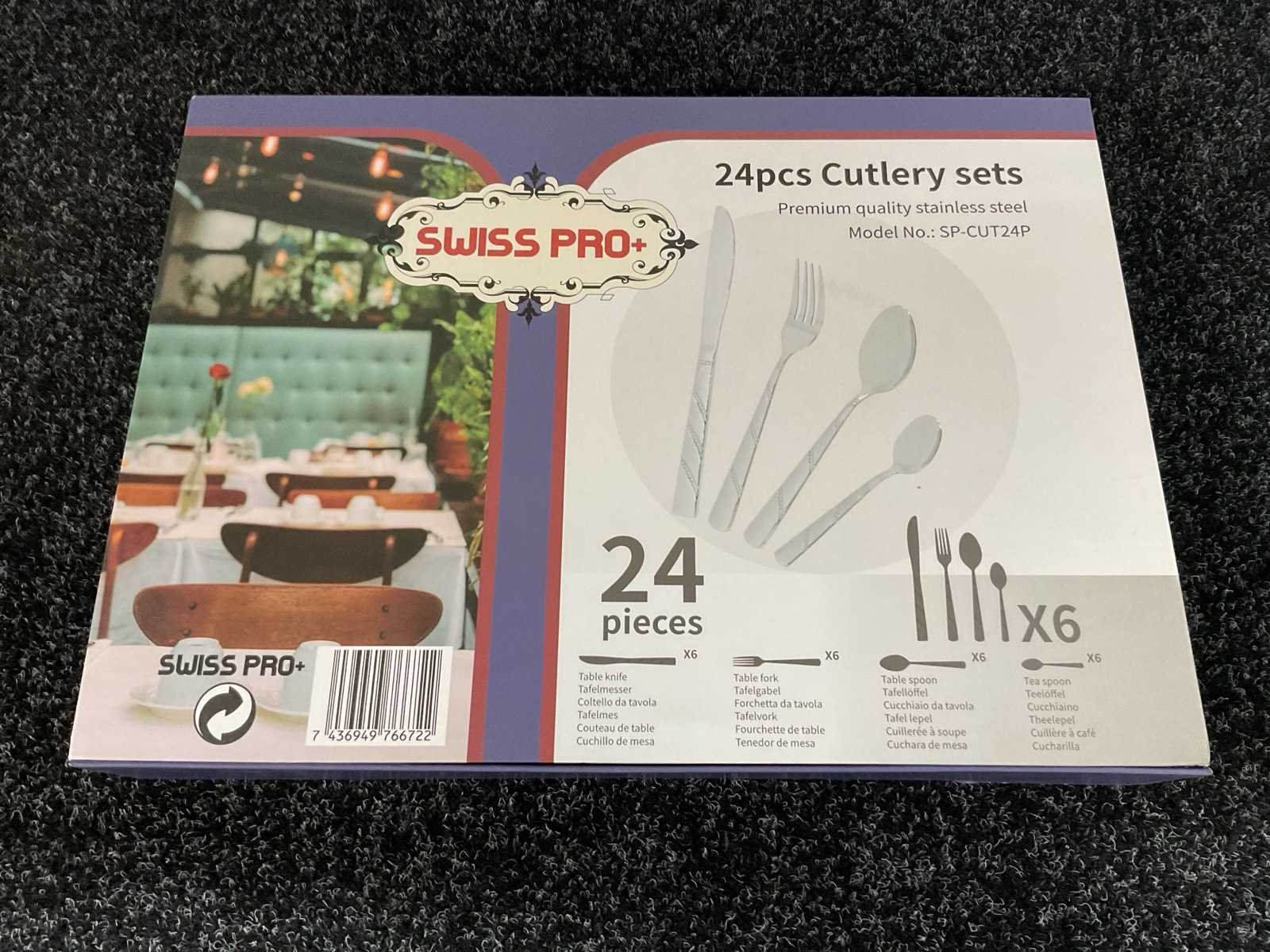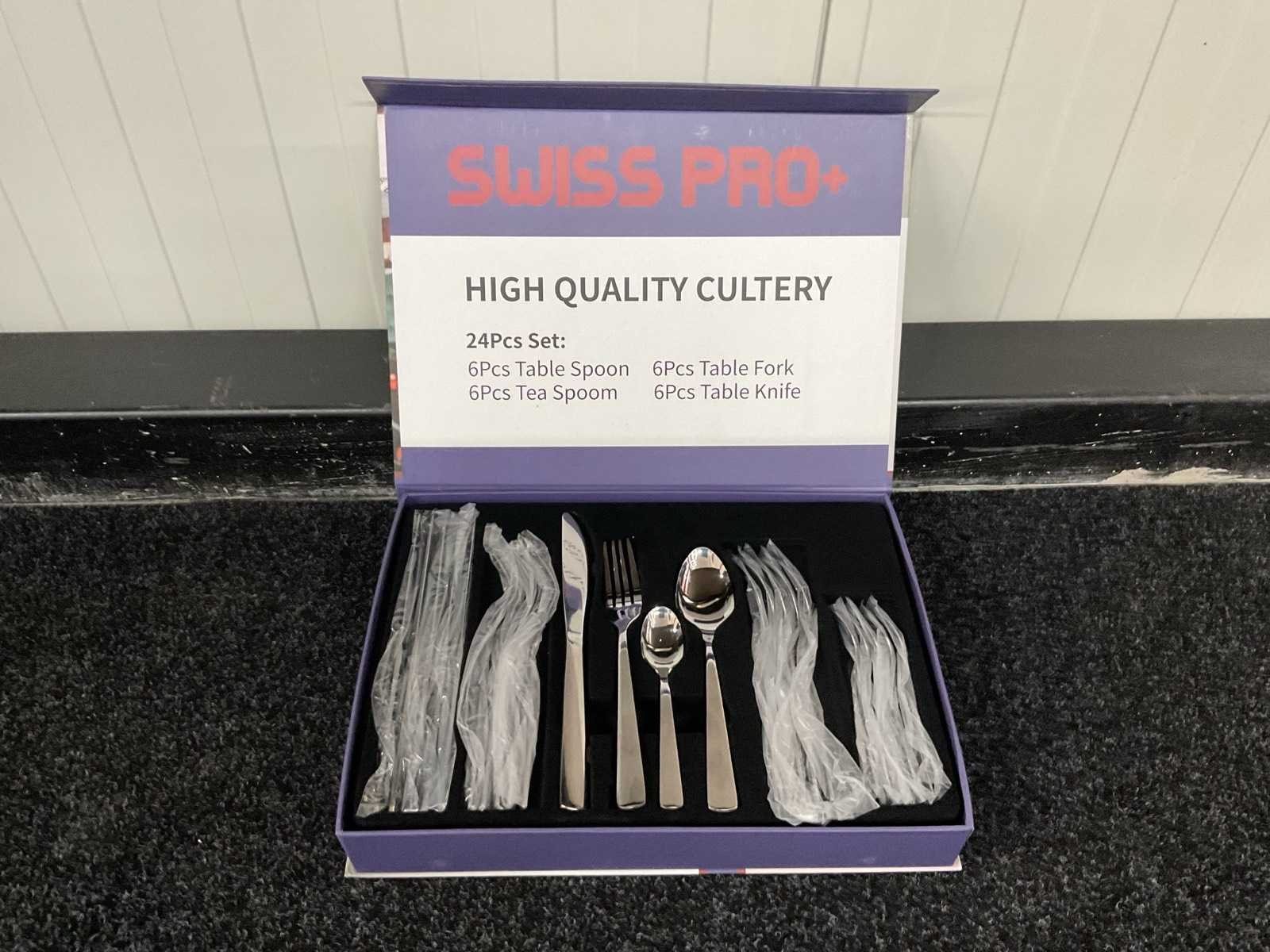 Voorzien van roestvrij staal; 6x tafelmes; 6x tafelvork; 6x tafellepel; 6x theelepel; nieuw in doos Merk: Swiss Pro+ Type: SP-CUT24 Totale afmeting L: 370mm Totale afmeting Breedte: 270mm Totale afmeting Hoogte: 55mm Eigen gewicht: 1.8kg