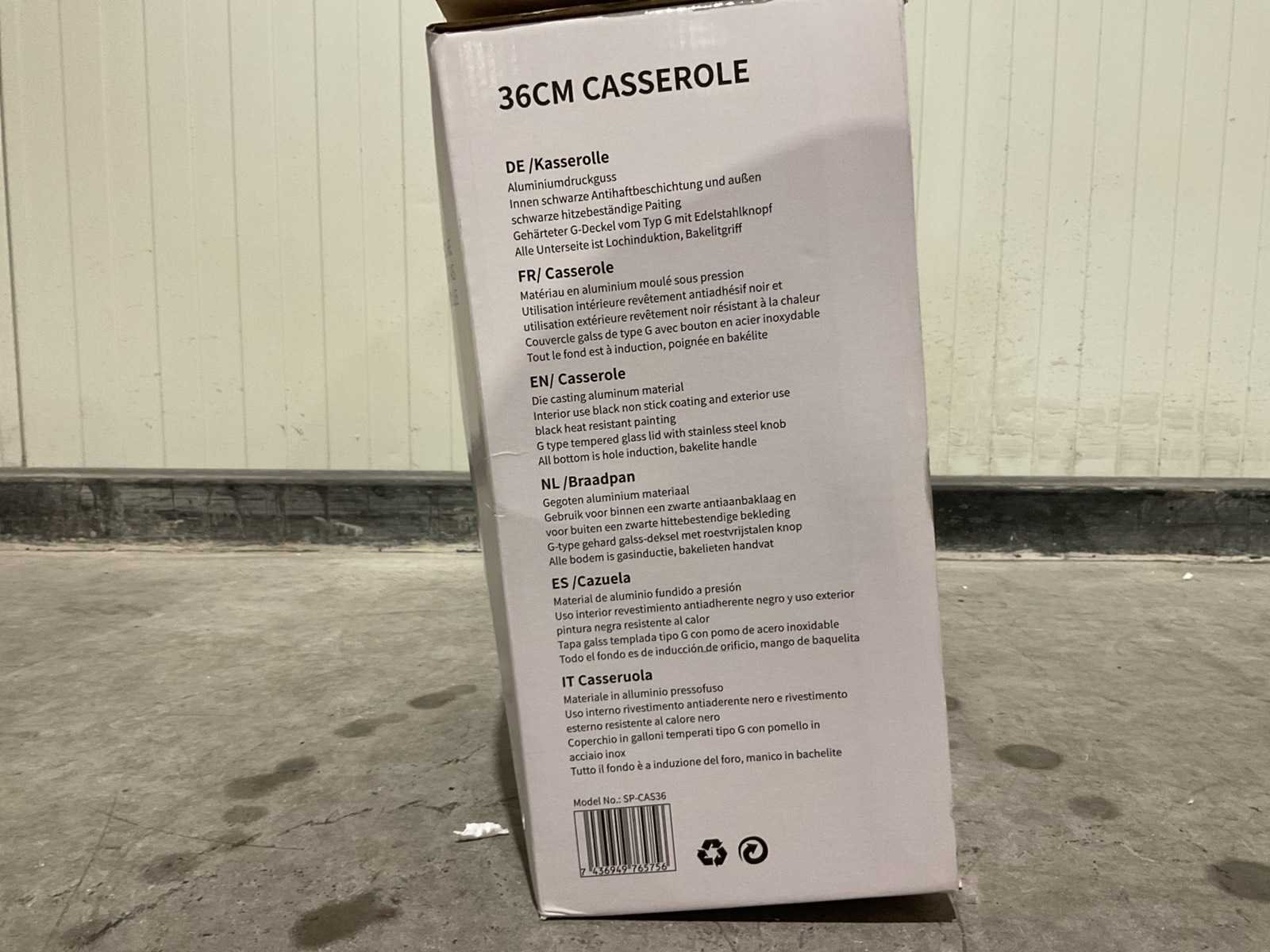3,4kg 36*36*16 2PCS gegoten aluminium g-type glas deksel met roestvrijstalen knop bakelieten handvaten kleur: zwart ongebruikt in doos Merk: Swiss Pro+ Model: 36cm Casserole