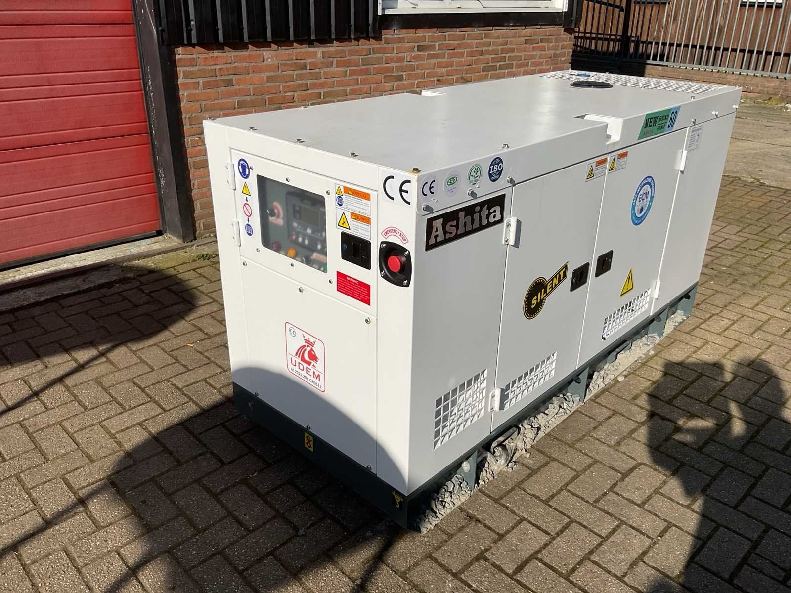 Voorzien van Nominaal vermogen: 50 kVA (±40 kW) Motorvermogen: ±30–32 kW Spanning: 230 / 400 V (1-fase en 3-fase) Frequentie: 50 Hz 2 × 230 V, 1 × 400 V Motor type: ZH4100D dieselmotor Aantal cilinders: 4 cilinders Motortype: 4-takt, watergekoeld Toerental: 1500 rpm Brandstoftank: ±60 liter Brandstof: Diesel Afmetingen (L × B × H): ±2,05 × 0,86 × 1,12 m Gewicht: 900 kg SmartGen digitaal controlepaneel Elektrische start Geluidsdichte canopy (silent type) Forklift pockets voor transport Merk: Ashita Power Type: AG3-50 Wit