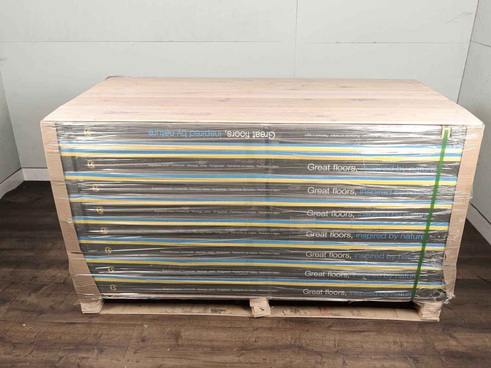 Gemakkelijk te leggen wegens clicksysteem, geschikt voor alle soorten vloer en koelverwarmingen, kwaliteits parketvloer, vloer is van hoogwaardig eiken hout, kant en klaar behandeld, dikte 14 mm, toplaag 3 mm, 50 pakken a 2,888 m2 Within 14 days Merk: Great floor Product type: Parket Oppervlakte: 144m² Geschikt voor vloerverwarming: Ja V-groef: Ja Afwerking: Wit geolied, extra rustiek, gebosteld, met v-groef Aantal m² per verpakking: 2.888m² Kleur: Wit geolied Gewicht: 1150kg Lengte: 1900mm Breedte: 190mm Materiaal: Eiken multiplank