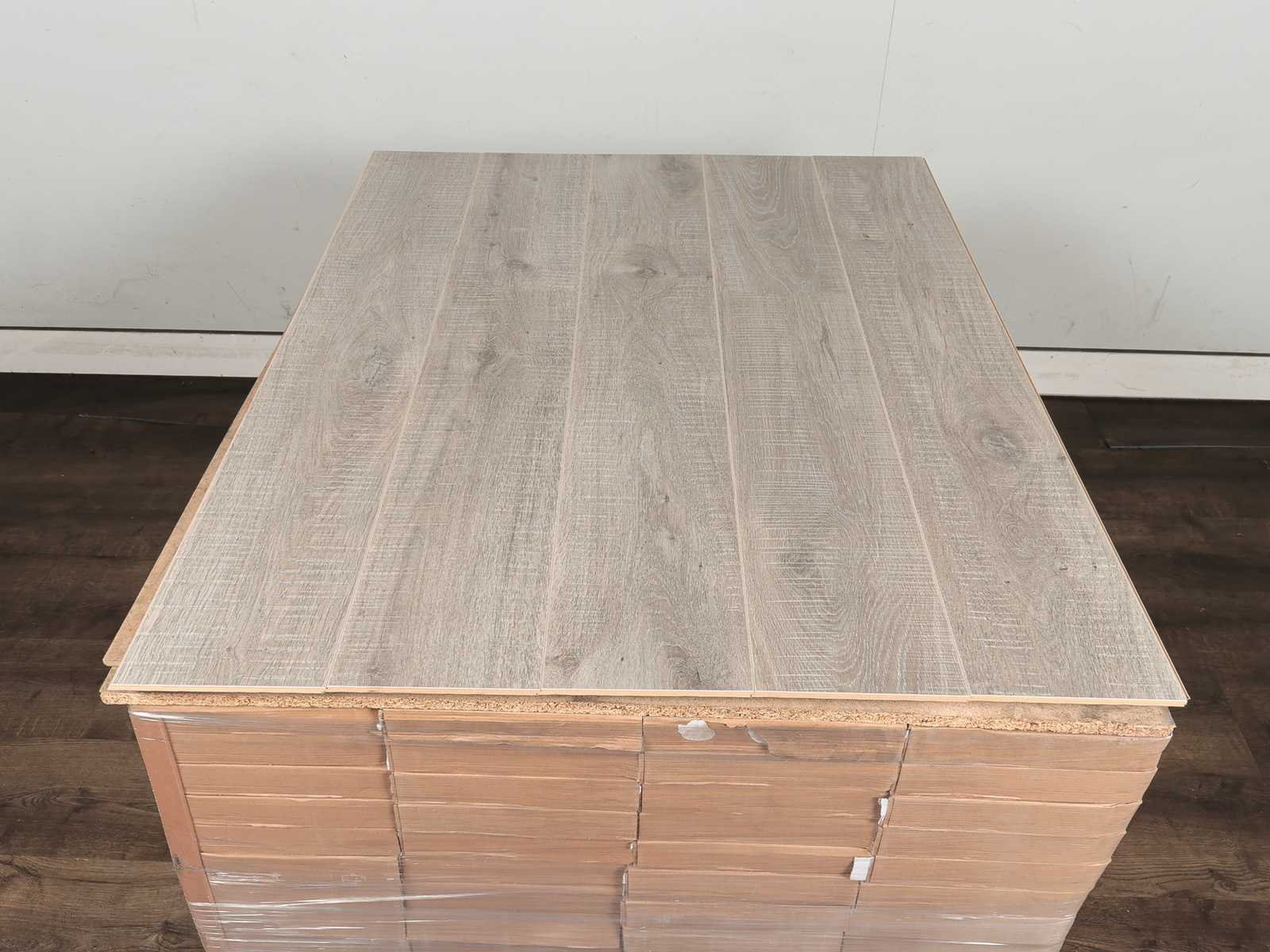 Kwaliteits laminaat vloer, dikte 7 mm, voorzien van clicksysteem, goed te combineren met vloerverwarming, kras en slijtvast, anti slip, gemakkelijk schoon te maken, warm en comfortabel, 51 pakken a 2,42 m2 Within 14 days Merk: Quick floors Product type: Laminaat Oppervlakte: 123m² Geschikt voor vloerverwarming: Ja V-groef: Ja Afwerking: Voelbaar structuur, anti slip, met v-groef Aantal m² per verpakking: 2.42m² Kleur: Zacht grijs eiken 916 Gewicht: 865kg Lengte: 1261mm Breedte: 192mm Materiaal: HDF/MDF