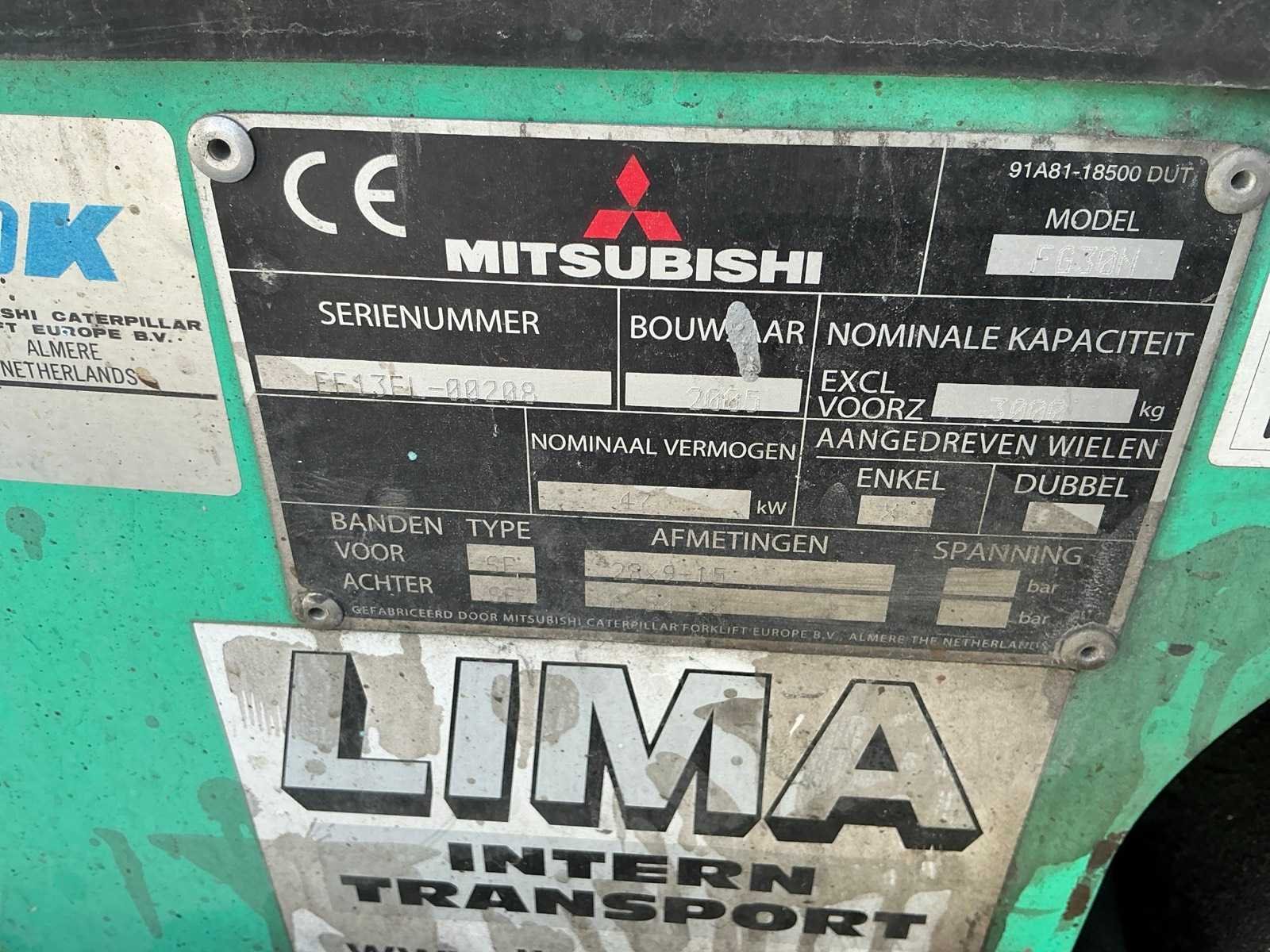 3178 uur; dubbele deur; zonder gasfles; Merk: Mitsubishi Type: FG30N Bouwjaar: 2005 Serienummer: EE13EL-00208 Brandstof: lpg Kenteken: T-61-DBL Soort band: Volrubber banden Aantal wielen: 4 Side-shift: true Duplex mast: true Hefvermogen: 3000kg Lepellengte: 1200mm Max. hefhoogte: 3700mm Vol rubber banden: true Totale afmeting L: 4000mm Totale afmeting Breedte: 1270mm Totale afmeting Hoogte: 2400mm LPG: true