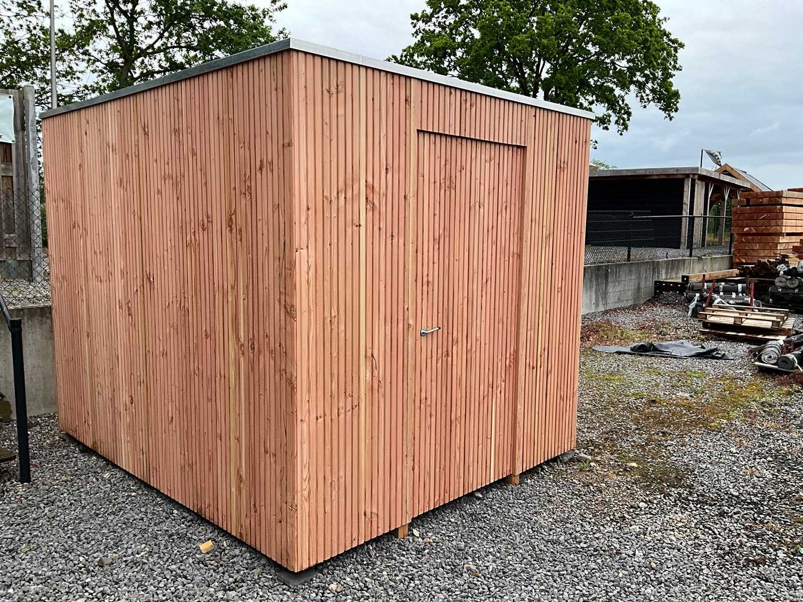 Modern Model Tuinhuis Kenmerken: De deur kan naar wens in de lange of korte zijde worden gemonteerd. Daarnaast kan de deur zowel aan de linker- als aan de rechterkant worden geplaatst. De draairichting kan naar links of naar rechts worden ingesteld. Materiaal: Palen: 12x12 cm Douglas Dakbalken: 5x15 cm Douglas Regelwerk: 5x7 cm Vuren Wanden: 2 cm dikke Triple Douglas planken Dakplanken: 1,8 cm dikke Douglas planken Dakbedekking: EPDM dakfolie met lijm en dakdoorvoer Daktrim: Aluminium Levering: Geheel geleverd als bouwpakket Afmetingen pakket: 120 x 100 x 300 cm Gewicht pakket: 900 kg Model: Tuinhuis Product type: Modern Gewicht: 900kg Lengte: 295cm Breedte: 295cm Hoogte: 240cm Materiaal: Douglas