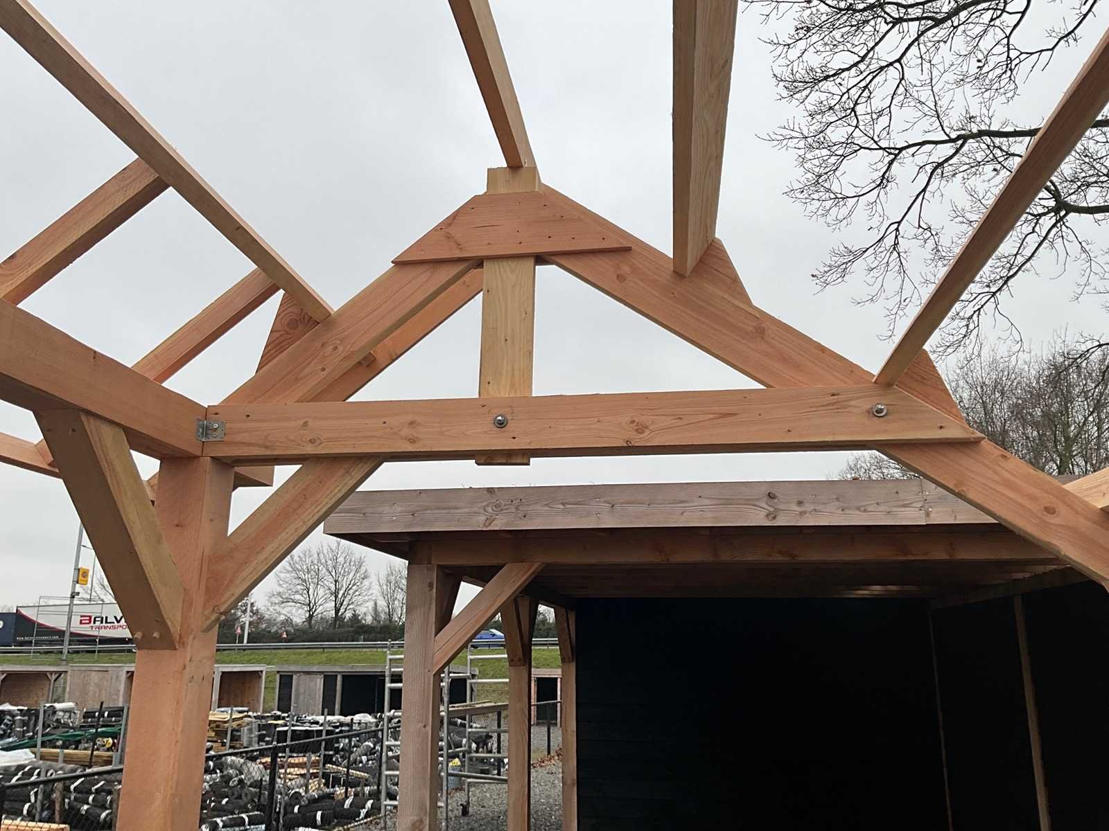 Constructie zonder dakbeschot Palen 150x150mm Douglas fijnbezaagd (6st.) Ligger voorzijde 150x150mm ligger achterzijde 120x120mm Spant 50x150mm Schoren 120x120mm 50x150mm dakbalken 50x150mm boeideel 20x200mm 20x100mm Dakmaat 5600x3600mm Buitenzijde palen 5000x3000mm Afmeting Pakket: 350x125x140cm, 1000kg Geleverd in een bouwpakket Alle onderdelen op maat gezaagd Geleverd met handleiding en bevestigingsmateriaal Geleverd zonder grondpoeren Houtsoort: Douglas Bevestigingsmateriaal: true Constructieplan: true Eigen gewicht: 1000 Totale afmeting L: 5600 Totale afmeting Breedte: 3600 Totale afmeting Hoogte: 3250 Verpakt per: 1 pakket Verpakking afm. l: 3500mm Verpakking afm. w: 1250mm Verpakking afm. h: 1400mm
