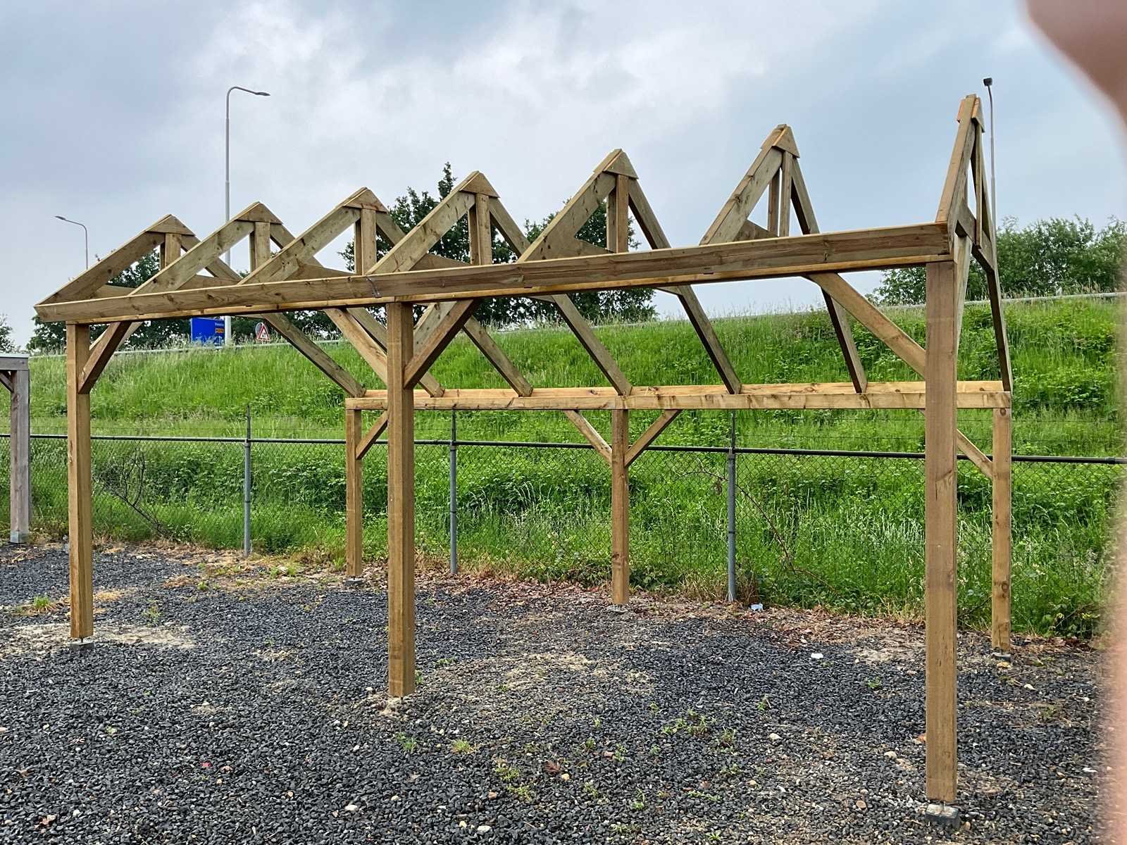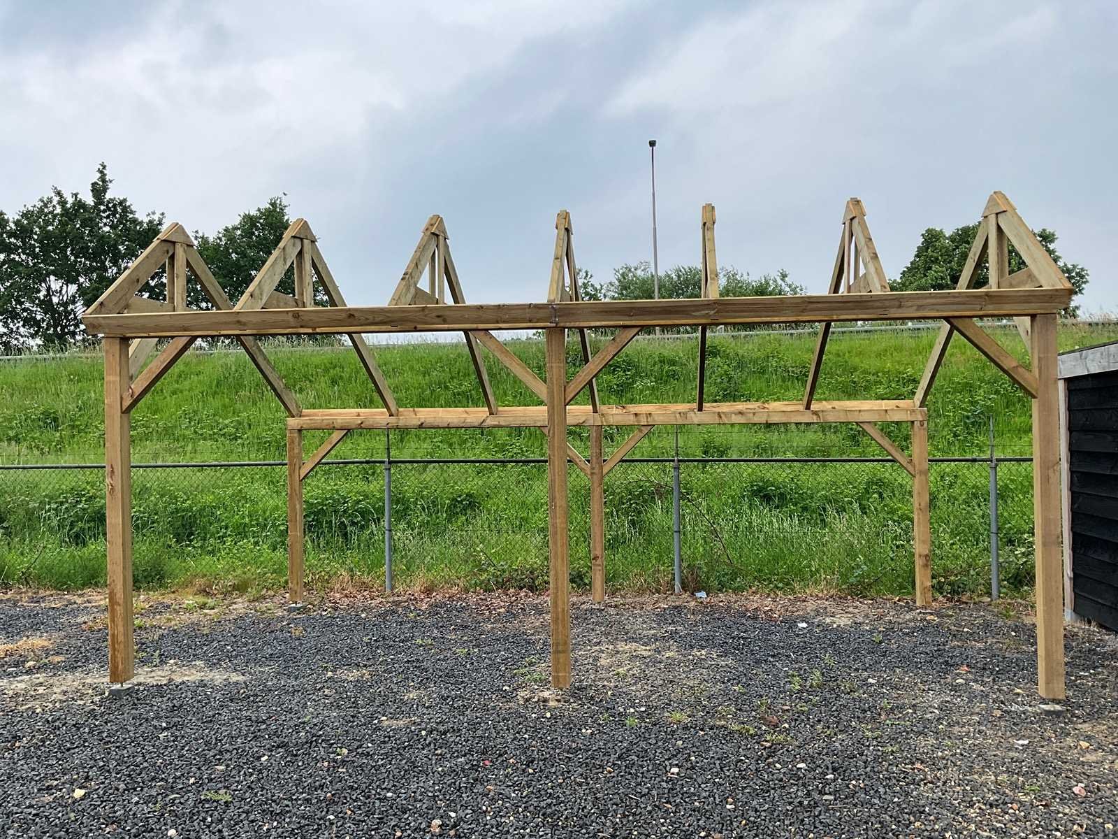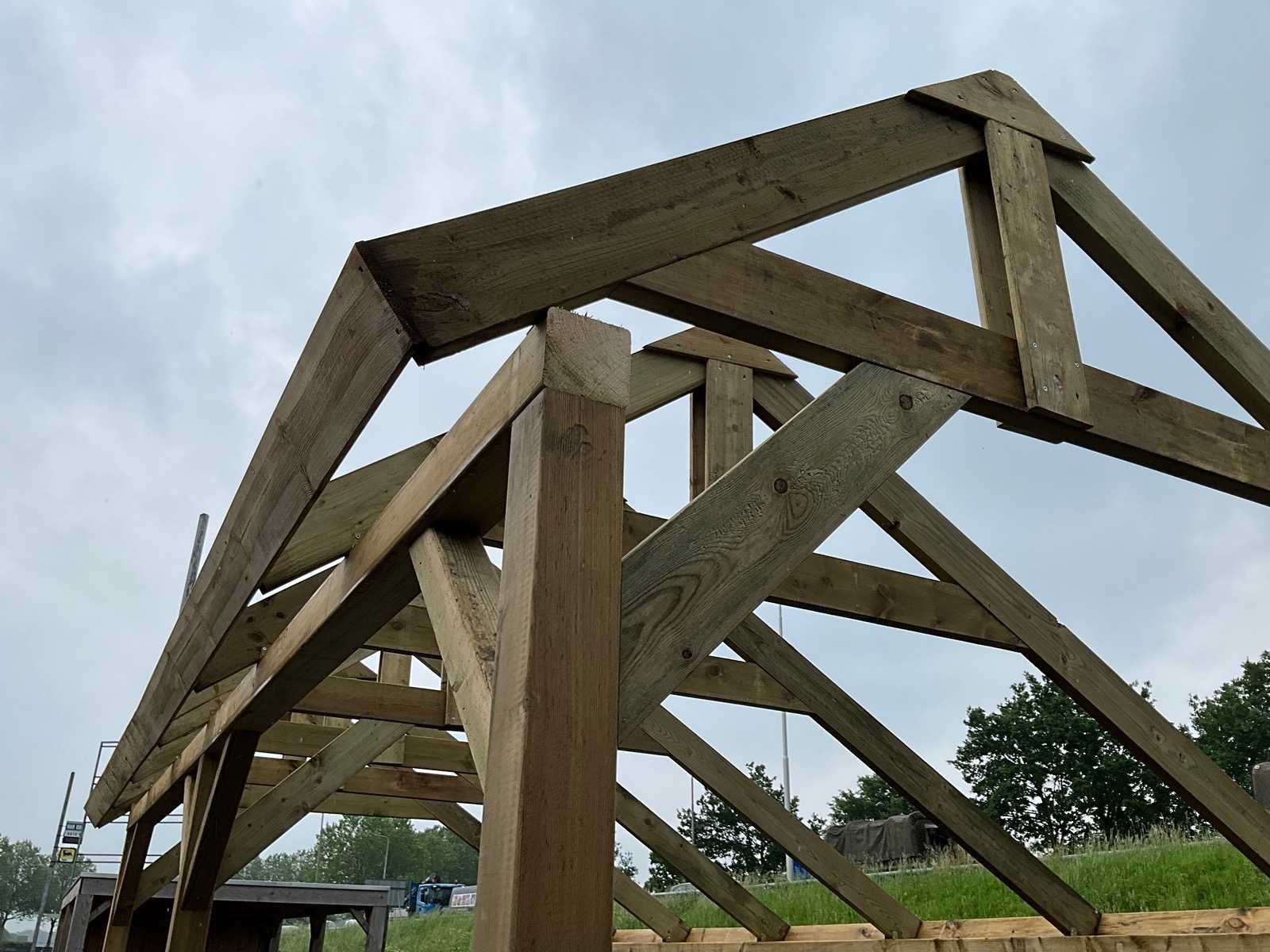 Palen: 11x11 cm geschaafd vuren ( 8 stuks ) Liggers: 12x12 cm geschaafd vuren Schoren: 9x9 cm geïmpregneerd vuren Boeien: 1,6x14 cm geïmpregneerd vuren Spanten: 4,5x14,5 cm geïmpregneerd vuren Het geheel is volledig op maat gezaagd en wordt geleverd met handleiding en bevestigingsmateriaal. Grondpoeren zijn niet inbegrepen. Het kavel wordt geleverd in bouwpakketvorm, met afmetingen van 125x125x300 cm en een gewicht van 900 kg. Gewicht: 900kg Lengte: 900cm Breedte: 300cm Hoogte: 322cm Materiaal: Geïmpregneerd vurenhout