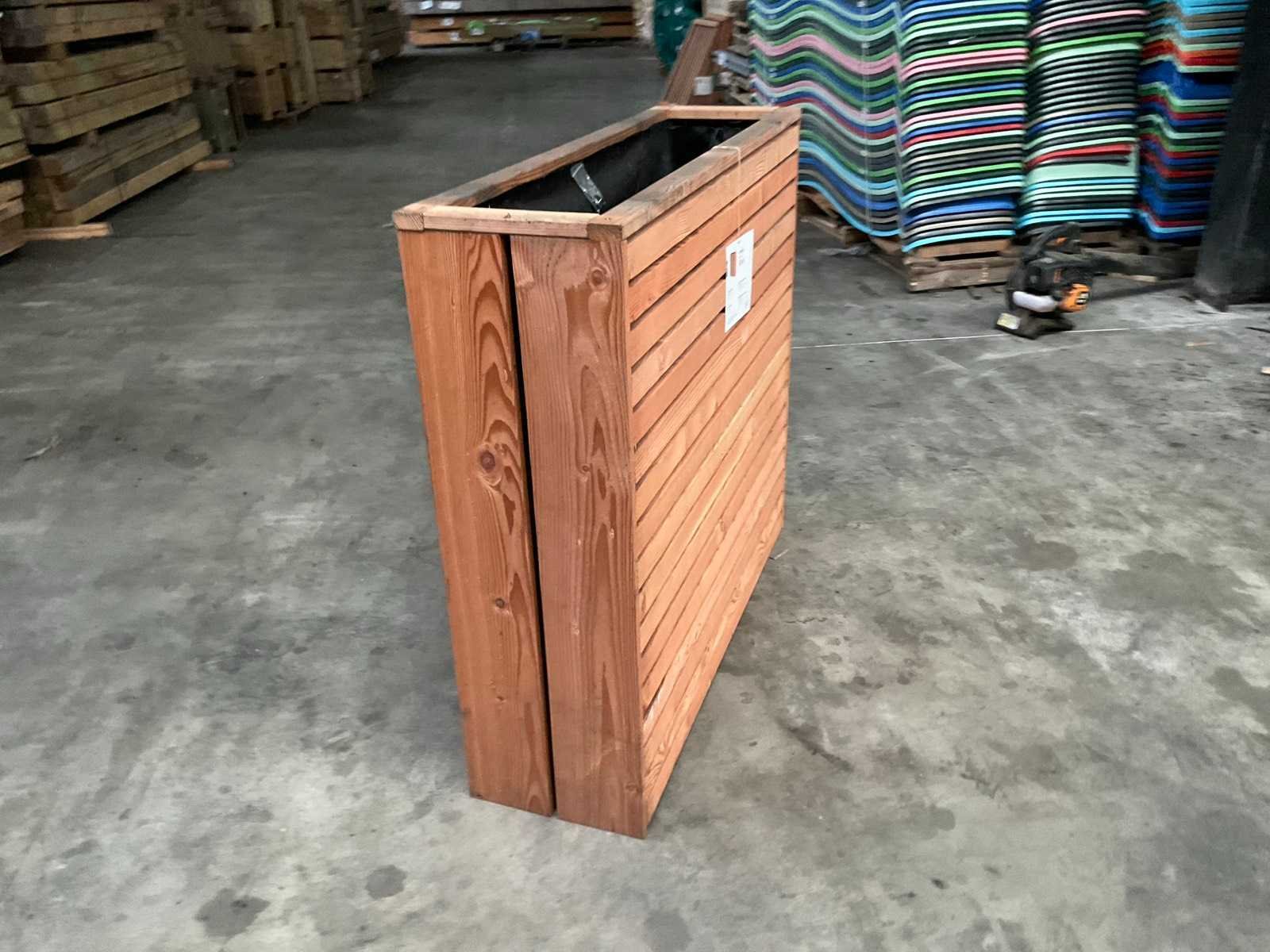 Hillhout Douglas bloembak "Elan" - 30x103x93 cm Breedte: 103 cm Diepte: 30 cm Hoogte: 93 cm Verfijnde vormgeving Zijkanten van balkjes met ca. 1 cm tussenruimte Onbehandeld douglas Balkjes: 2 x 4,4 cm Inclusief zwarte binnenzak Merk: Hillhout Model: Elan Product type: Bloembak Gewicht: 50kg Lengte: 93cm Breedte: 30cm Hoogte: 103cm Materiaal: Douglas