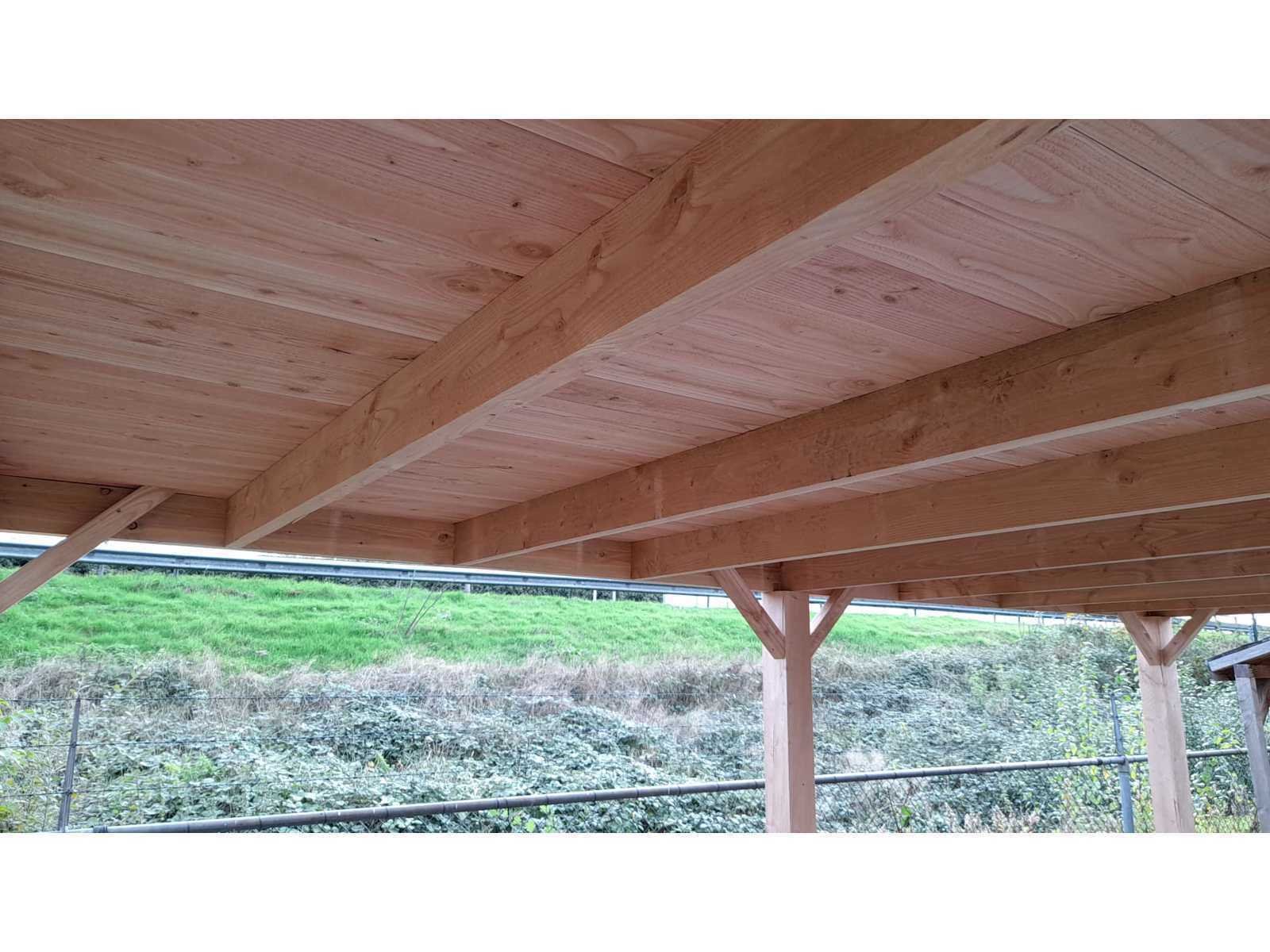 Palen: 150x150 mm Liggers: 50x150 mm Dakplanken: 18 mm Boeideel: 20x200 mm Overkapping wordt in bouwpakket geleverd, op maat gezaagd met opbouwhandleiding. Zonder paalhouders en dakbedekking. Product type: Overkapping Houtsoort: Douglas Verduurzaming: Onbehandeld Bevestigingsmateriaal: true Constructieplan: true Eigen gewicht: 550 Totale afmeting L: 414 Totale afmeting Breedte: 750 Totale afmeting Hoogte: 244 Verpakking afm. l: 3000mm Verpakking afm. w: 1200mm Verpakking afm. h: 800mm