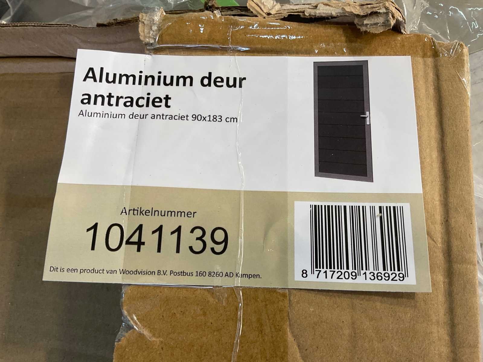 Kavel bevat: 1x aluminium deur in aluminium frame (183 x 90 cm) 1x set hang- en sluitwerk Let op: Palen worden niet meegeleverd. Kleur: Antraciet