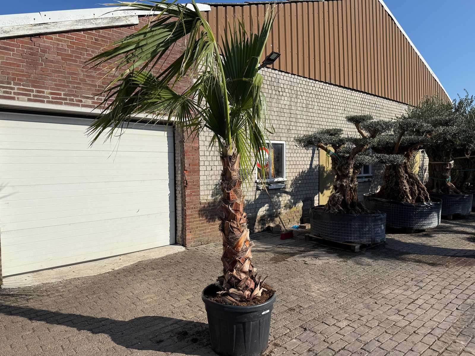 Type: Mexicaanse Waaierpalm Latijnse benaming: Washingtonia Robusta Hoogte ca.: 300cm In pot: true Diameter ca.: 300cm Stamdikte: 100cm Leeftijd: 200 Eigen gewicht: 2000