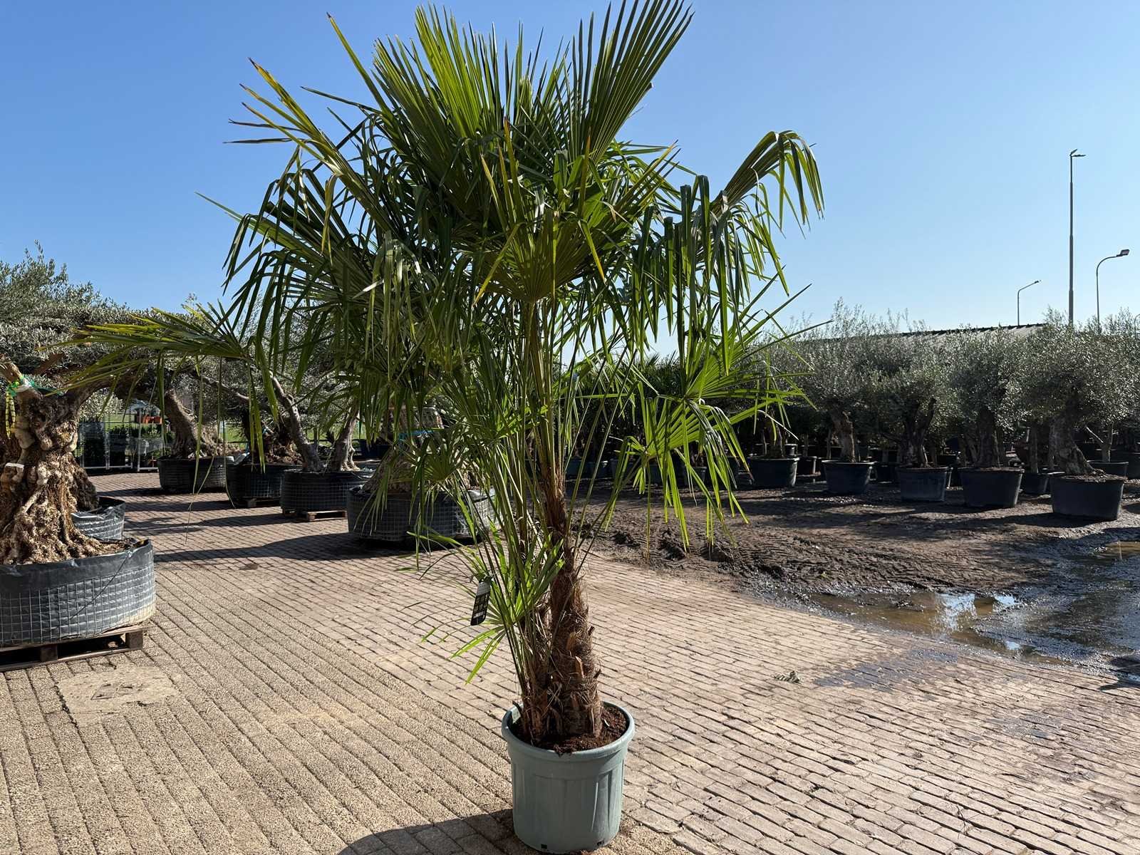 Type: Chinese Waaierpalm Latijnse benaming: Trachycarpus Fortunei Hoogte ca.: 250cm In pot: true Diameter ca.: 75cm Stamdikte: 8cm Leeftijd: 10