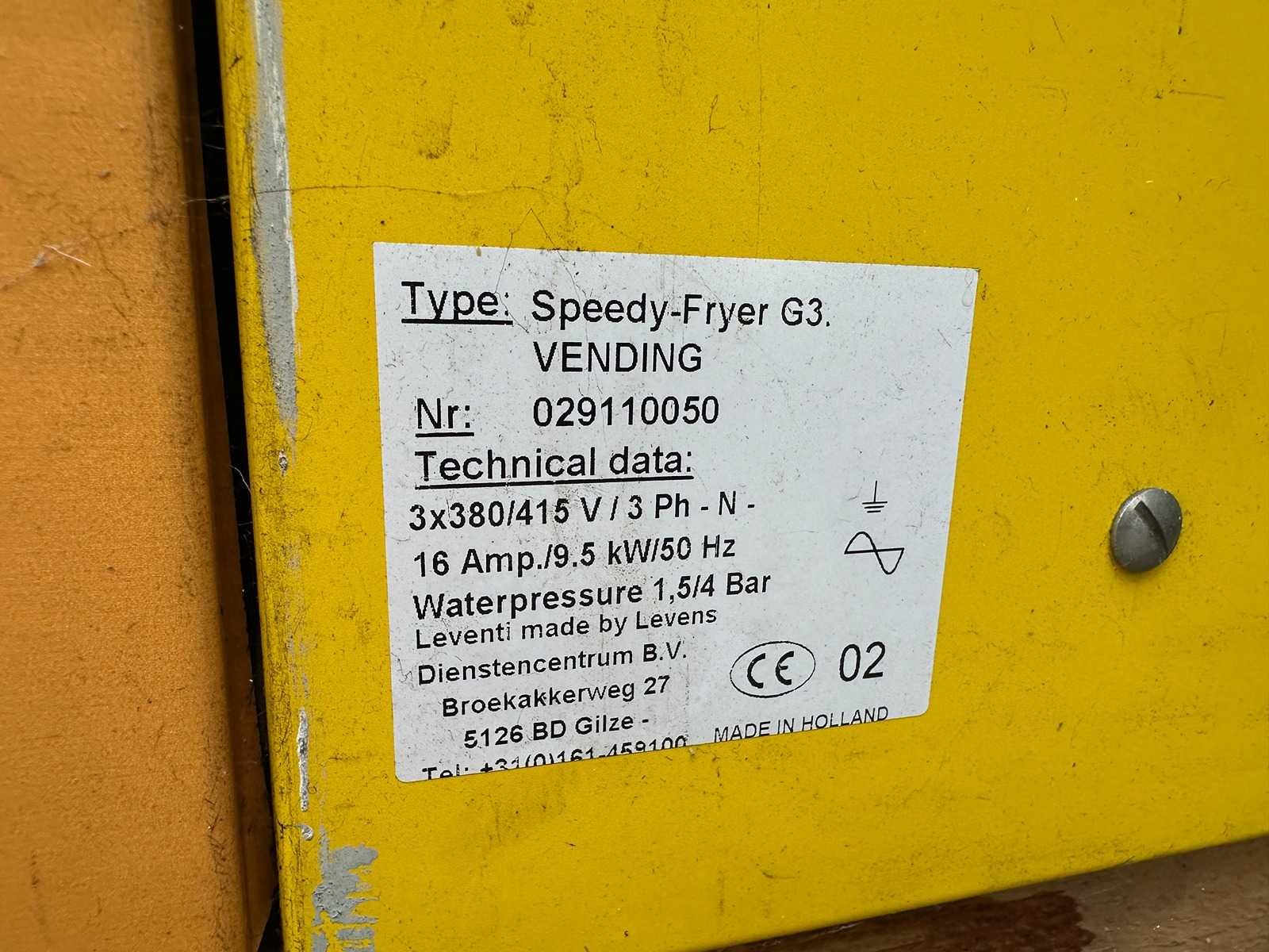 Franse frieten apparaat ; Speedy Fryer G3 vending ; Werking onbekend Merk: Leventi Type: Speedy Fryer G3 Totale afmeting L: 880mm Totale afmeting Breedte: 770mm Totale afmeting Hoogte: 2000mm