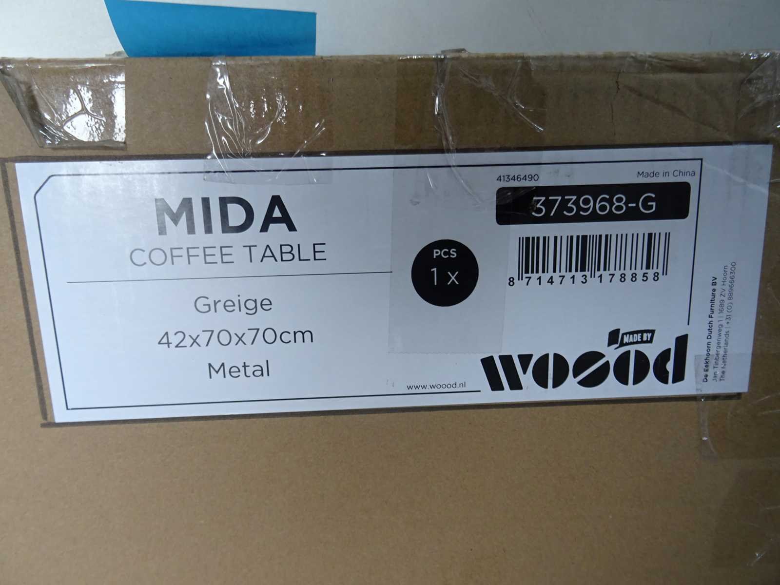 Enkele beschadigingen aan lak, EAN: 8714713178858 Merk: Woood Model: Mida Kleur: greige Lengte: 75cm Breedte: 75cm Hoogte: 42cm Materiaal: metaal
