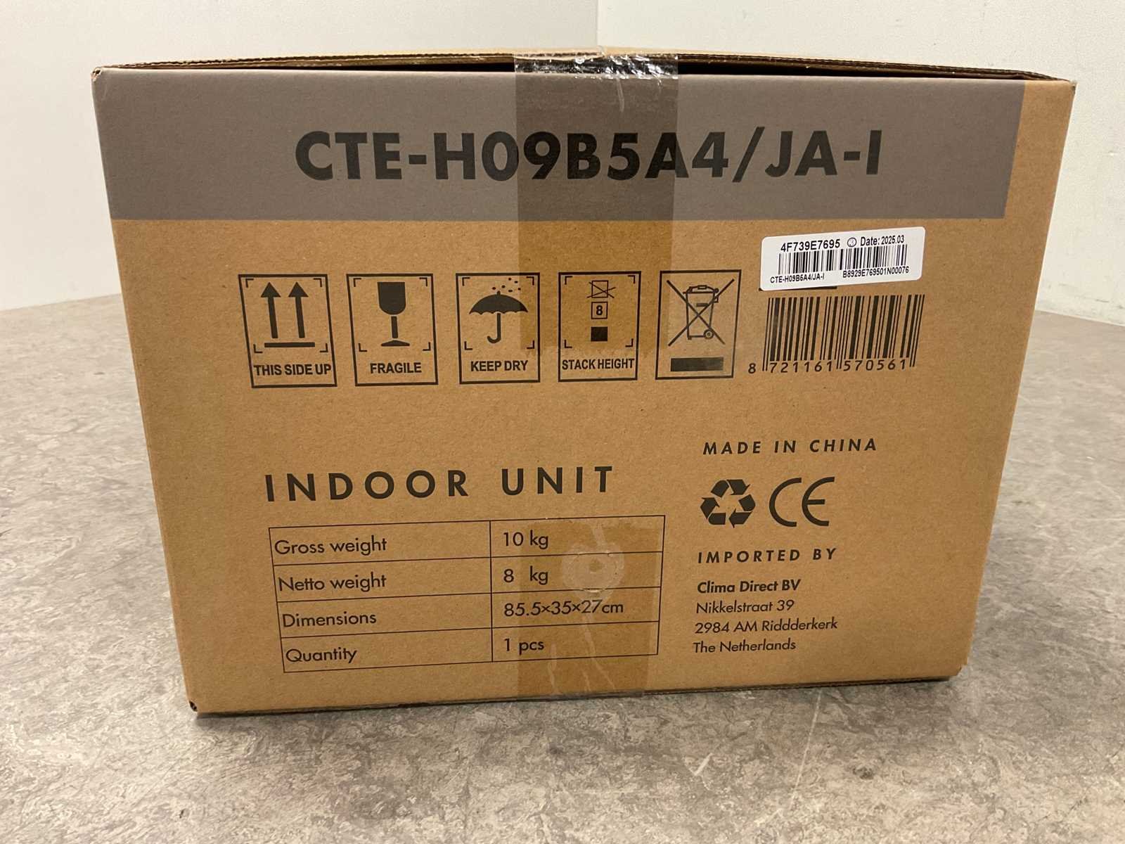 Deze split-unit airconditioner met afstandsbediening levert koeling én verwarming voor ruimtes van ca. 18-25m². De set bestaat uit een binnenunit en buitenunit met energiezuinige invertertechniek en het R32-koudemiddel. Dankzij de geïntegreerde wifi-functie bedien je de airco via een app op je smartphone. Je regelt temperatuur, timer en modi waar je ook bent. Met een koelvermogen van 2,7kW en een verwarmingsvermogen van 2,7kW is de unit geschikt voor slaapkamer, thuiskantoor of kleine woonkamer. Model: CTE-H12C5E4/JA (Binnenunit: CTE-H09B5A4/JA-I, Buitenunit: CTE-H09B5A4/JA-O). Energievoorziening: 220–240 V / 50 Hz. Koelmiddel: R32 – 0,57 kg (GWP 675→ 0,38 ton CO₂-eq). SEER: 6,5. SCOP: 4,0. Binnenunit: afmeting 85,5 × 23,5 × 27 cm, gewicht 8 kilogram, luchtvolume 550 m³/u, ventilatortype Cross-flow. Buitenunit: afmeting 76 × 30,5 × 51 cm, gewicht 18,5 kilogram, compressor GMCC Rotary, aansluitmaten: 3/8" (gas) & 1/4" (vloeistof). IP-classificatie: IPX4. Type: Split units Bouwjaar: 2025 Koelcapaciteit (BTU/h): 9200 Koelcapaciteit (W): 2700 Koelcompressor: true Verwarmingscapaciteit: 2700 Type koudemiddel: R32 Split-unit: true Aansluiting: 230V Eigen gewicht: 26,5kg