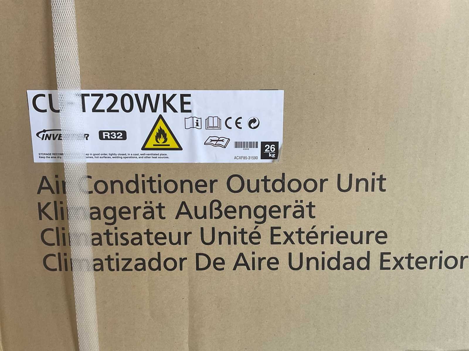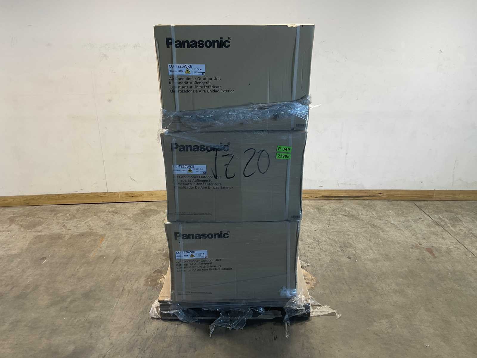 Pallet met 9 stuks Panasonic CU-TZ20WKE buitenunits. De Panasonic CU-TZ20WKE is een buitenunit uit de TZ-serie voor toepassing in single-split airconditioningsystemen. De unit werkt met koudemiddel R32. Deze buitenunit heeft een nominaal koelvermogen van 2,0 kW en een nominaal verwarmvermogen van 2,7 kW. De energie-efficiëntie bedraagt SEER 6,20 en SCOP 4,10. De afmetingen van de unit bedragen 780 × 289 × 542 mm (B × D × H) en het gewicht is 26 kg. Merk: Panasonic Type: CU-TZ20WKE Koelcapaciteit (W): 2000 Verwarmingscapaciteit: 2700 Type koudemiddel: R32 Split-unit: true Aansluiting: 230V Eigen gewicht: 26kg Totale afmeting L: 780mm Totale afmeting Breedte: 289mm Totale afmeting Hoogte: 542mm