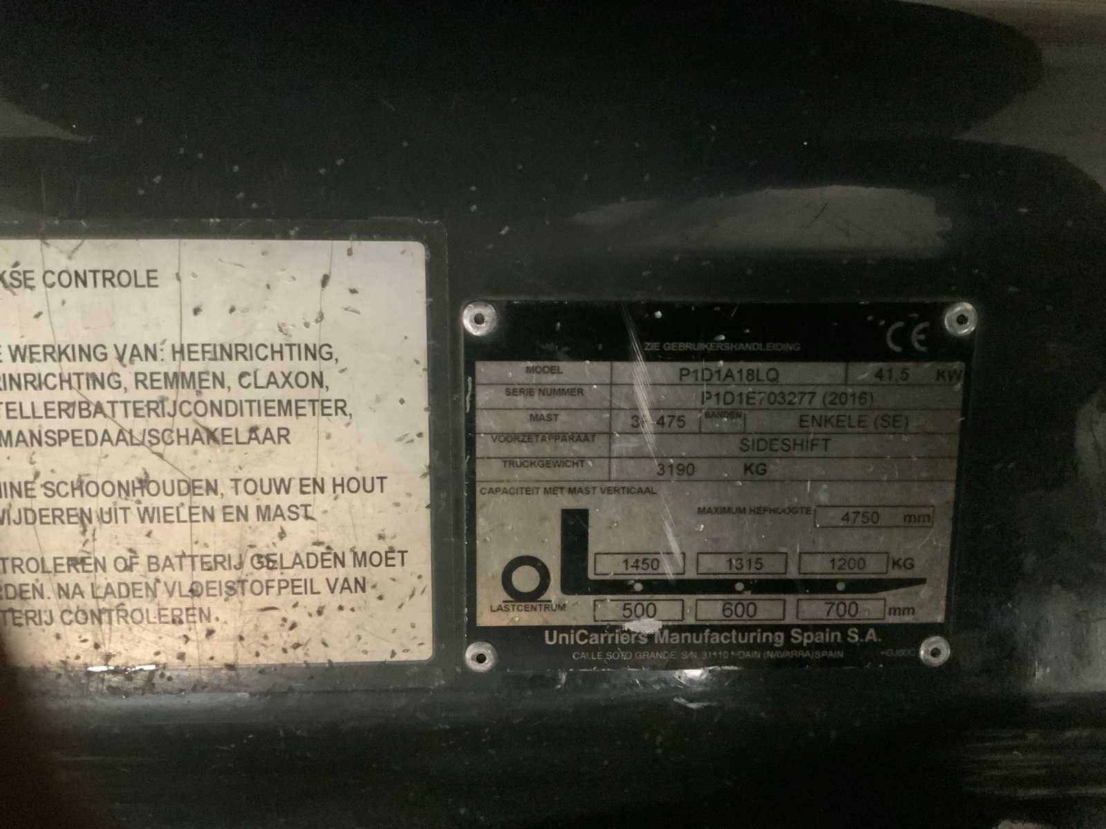 910 uur Merk: Nissan Type: 18 Bouwjaar: 2016 Serienummer: E703277 Brandstof: LPG Mast: Triple Soort band: Volrubber banden Aantal wielen: 4 Accu lader: true Free-lift: true Side-shift: true Triple mast: true Eigen gewicht: 3190kg Hefvermogen: 1800kg Max. hefhoogte: 4750mm Vol rubber banden: true LPG: true