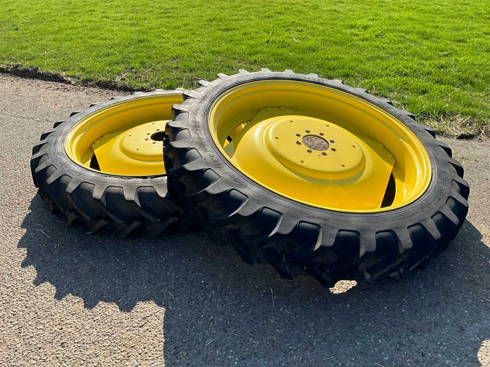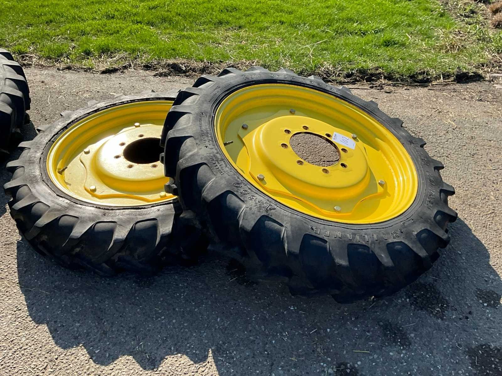 2x 230x95R32 met 8x275 velg, naaf ø 220 mm, 2x 270/95R44 met 8x205 velg, naaf ø 150 mm Afkomstig van John Deere 2850, spoorbreedte 1,5m. Molcon verstelbare velgen Merk: Alliance Type: A-350 Row Crop