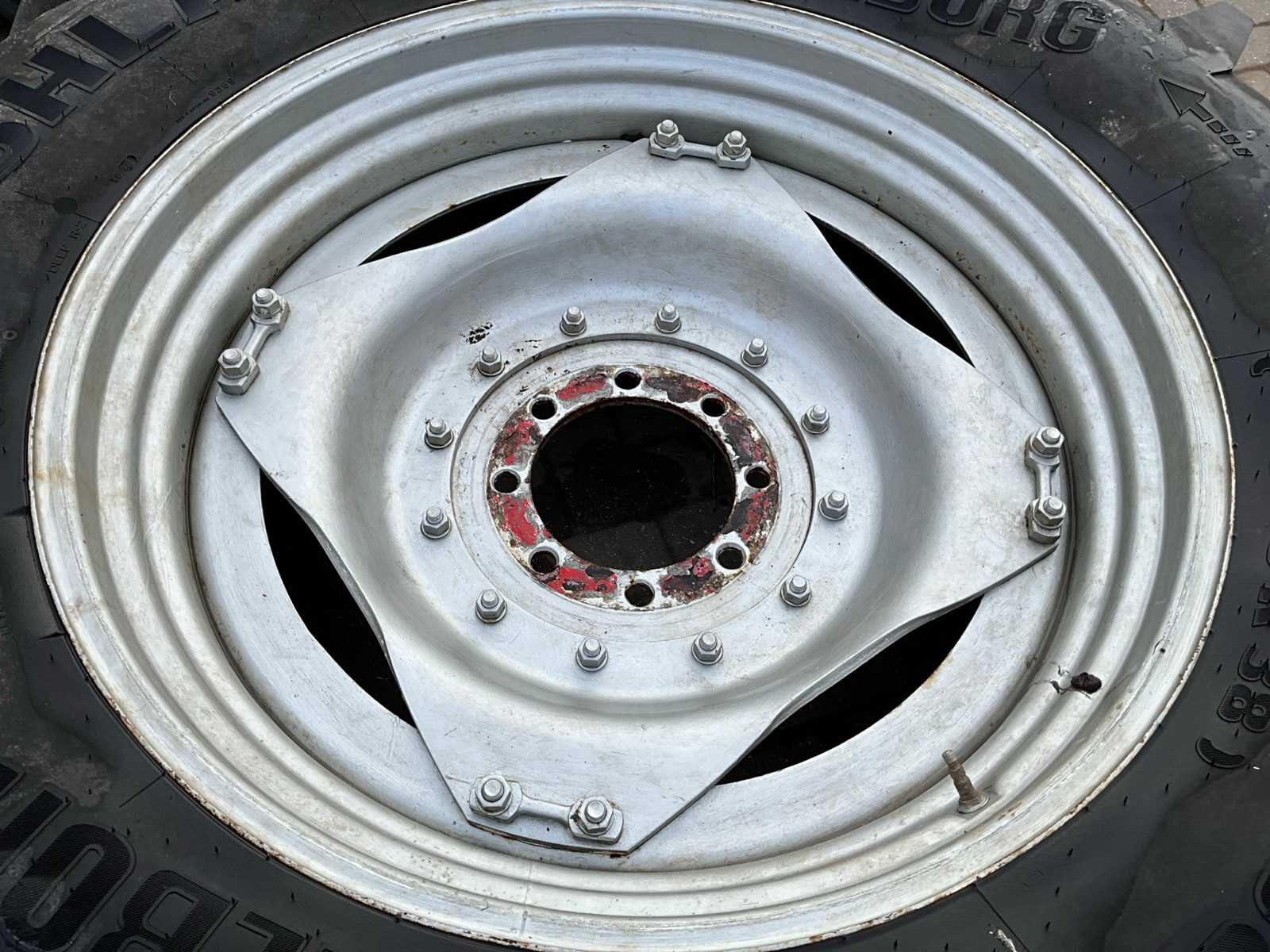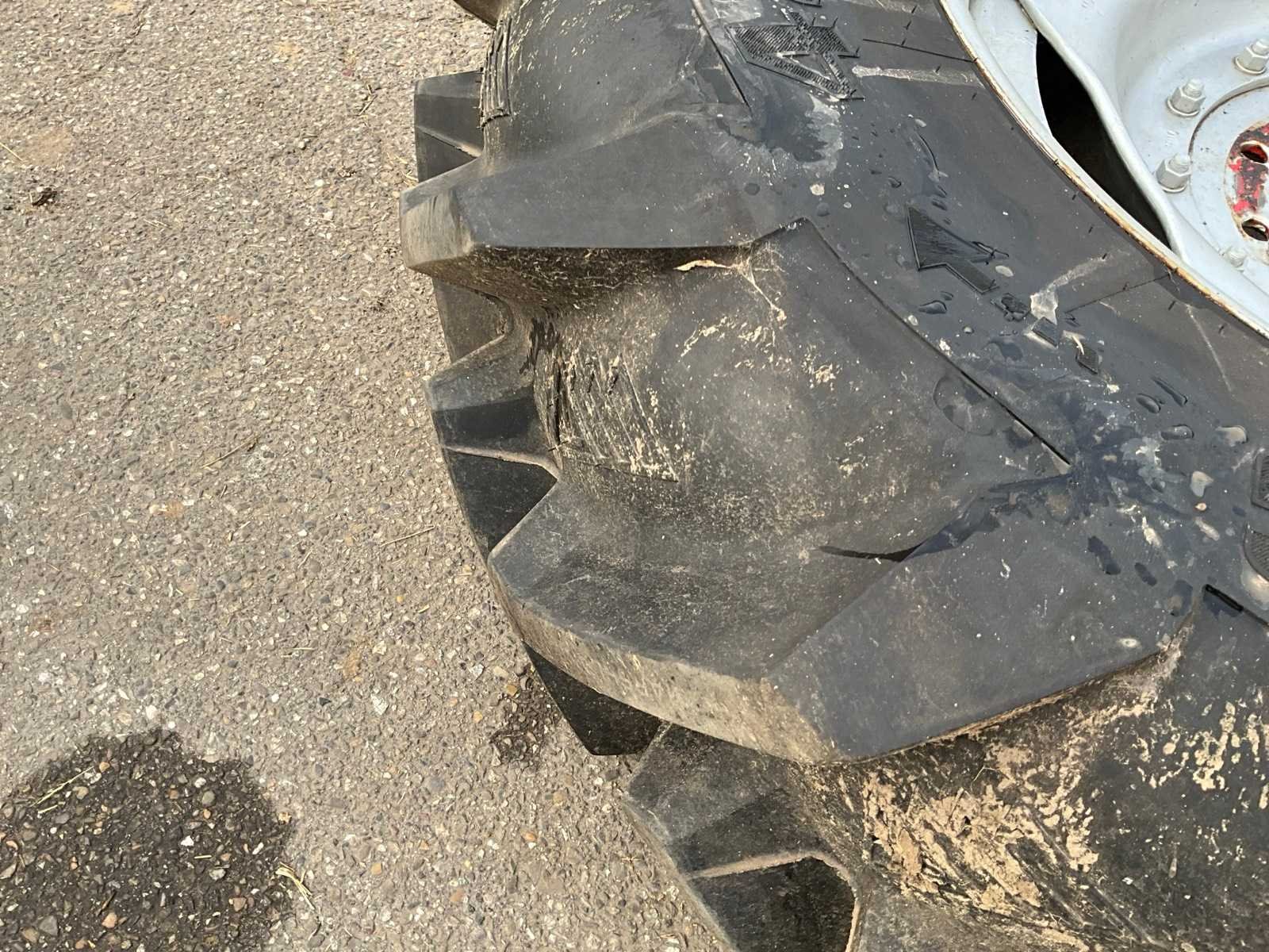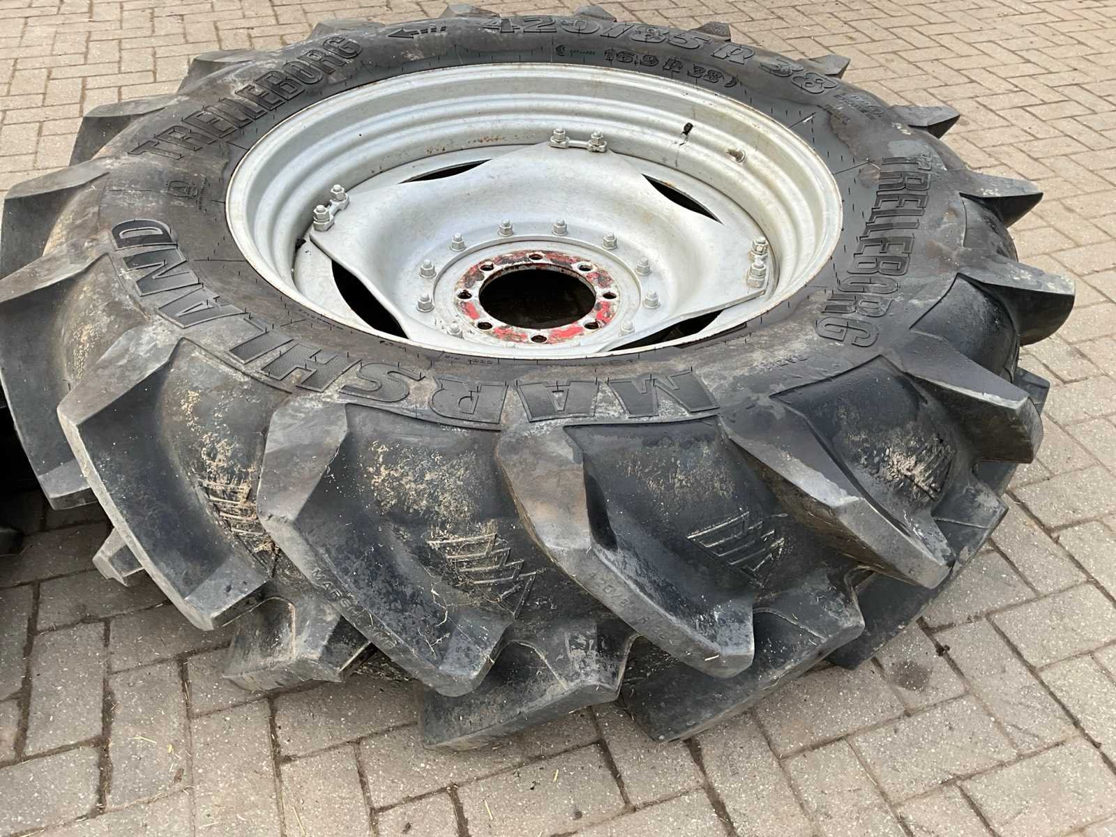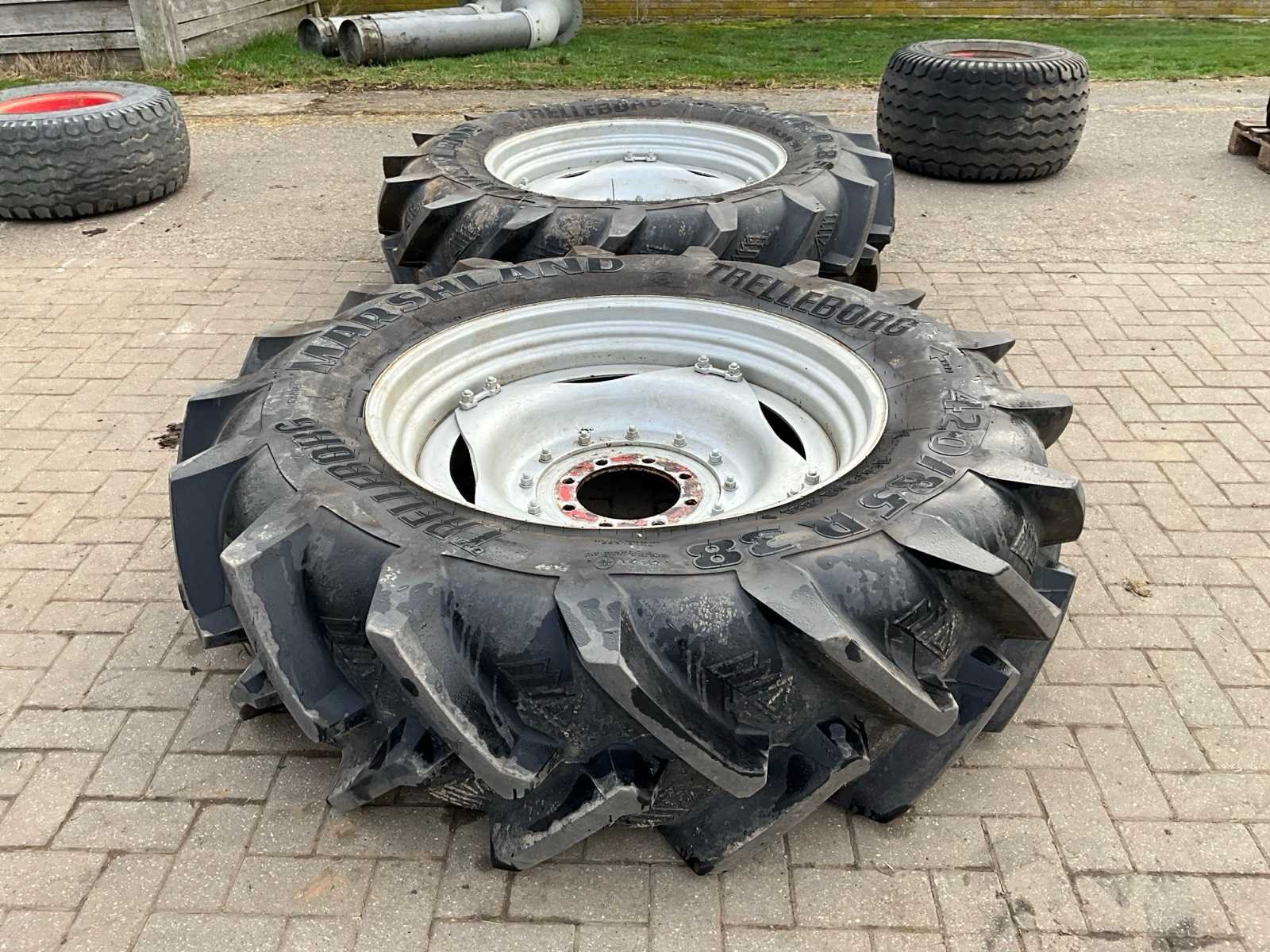 Voorzien van 8x275 velg, naaf ø 220 mm Ploegbanden. Afkomstig van Case Maxxum 115 Merk: Trelleborg Type: Marshland Bandenmaat: 420/85 Maat (getal): 38''