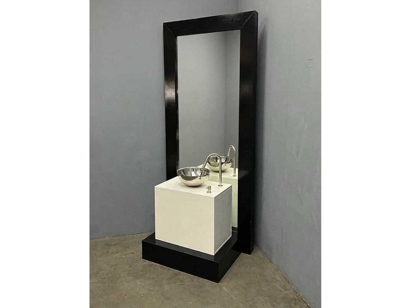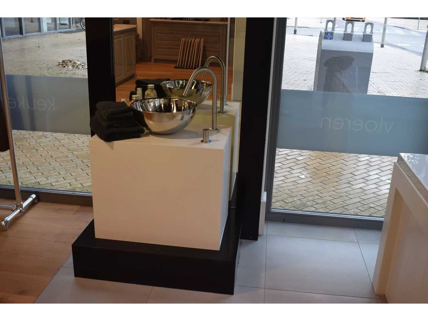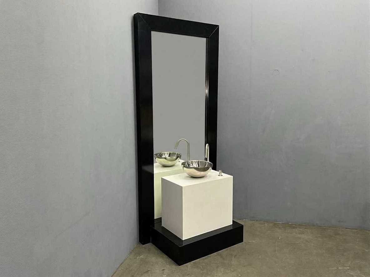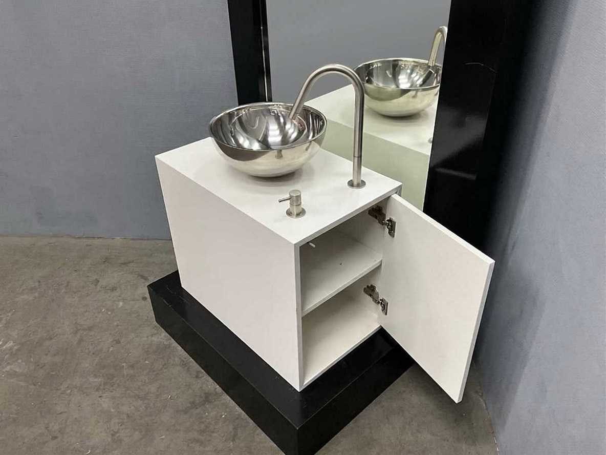 Reeds gedemonteerd Merk: Jacob Interior Kraan: MGS MB 280 mat geborsteld RVS Waskom: Gepolijste RVS 30 x 12 cm Spiegel: Zwart 250 x 108 cm Onderkast: 88 x 59 x 78 cm Afmeting hangkast: 88 x 59 x 78 cm
