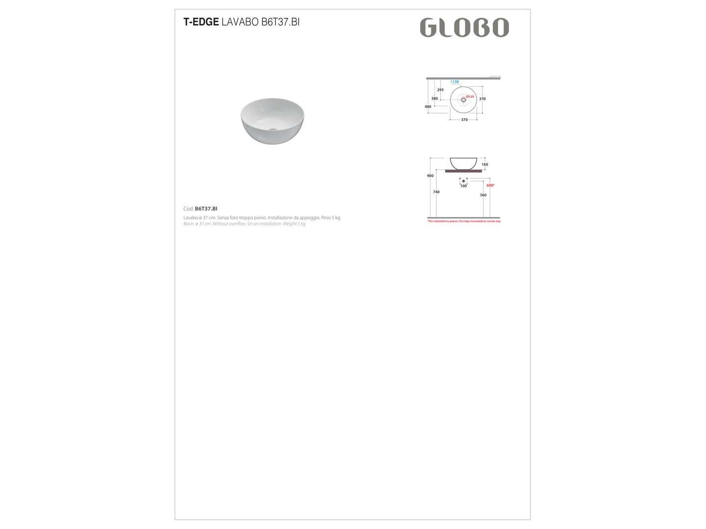 Globo - t-edge - glb6t37.boor - waskom 37 cm