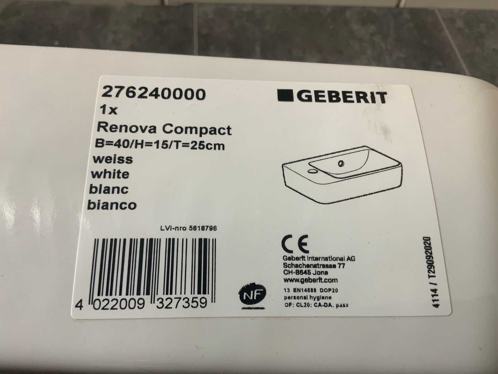 Merk: Geberit Model: Renova Compact Kleur: Wit Lengte: 40cm Breedte: 25cm Hoogte: 10cm Materiaal: Keramiek