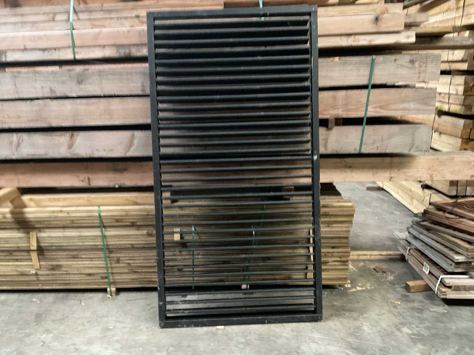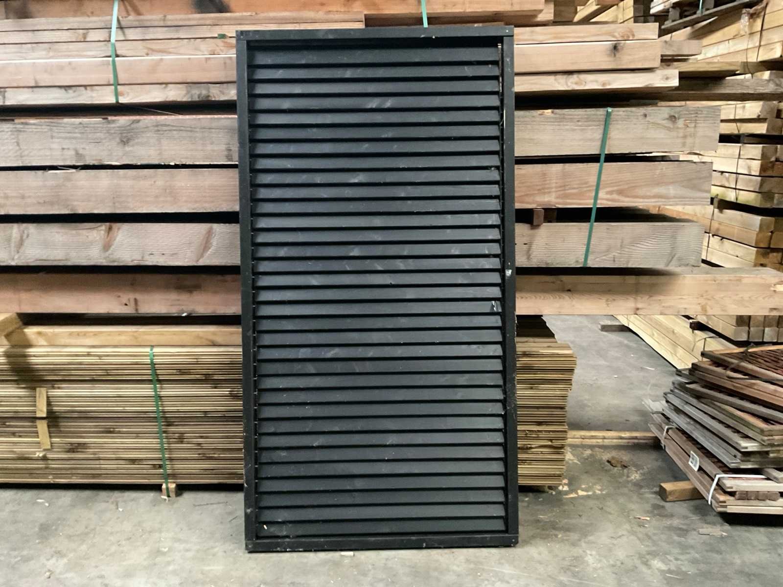 Douglas zwart gespoten Shutterscherm 120x225 cm. Merk: Hillhout Model: Verstelbare schutter lamelle Gewicht: 50kg Breedte: 120cm Hoogte: 225cm Materiaal: Douglas zwart gespoten