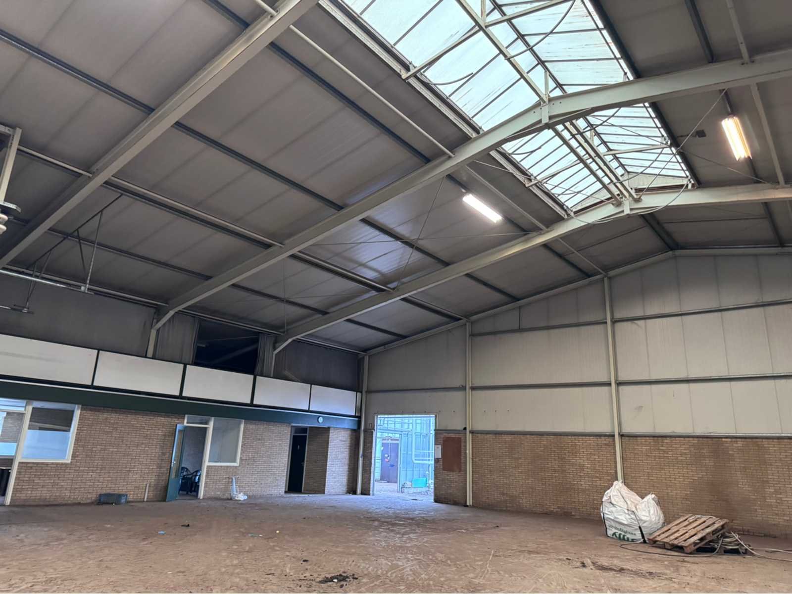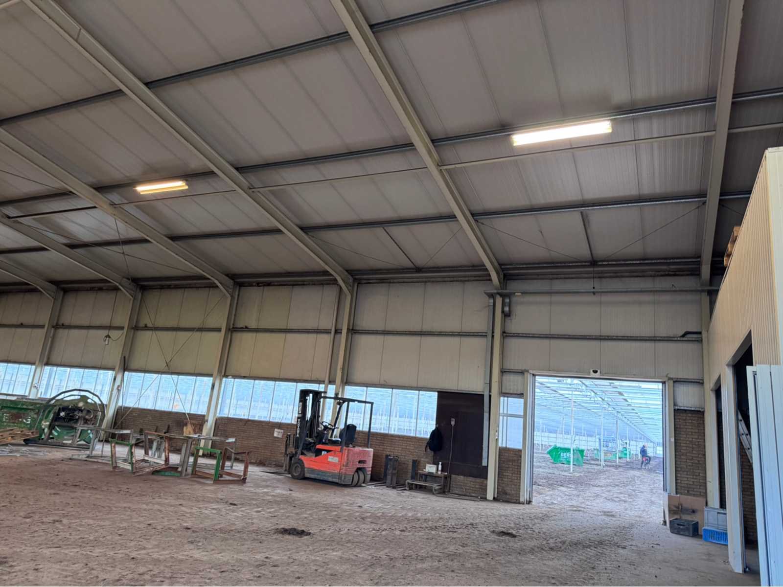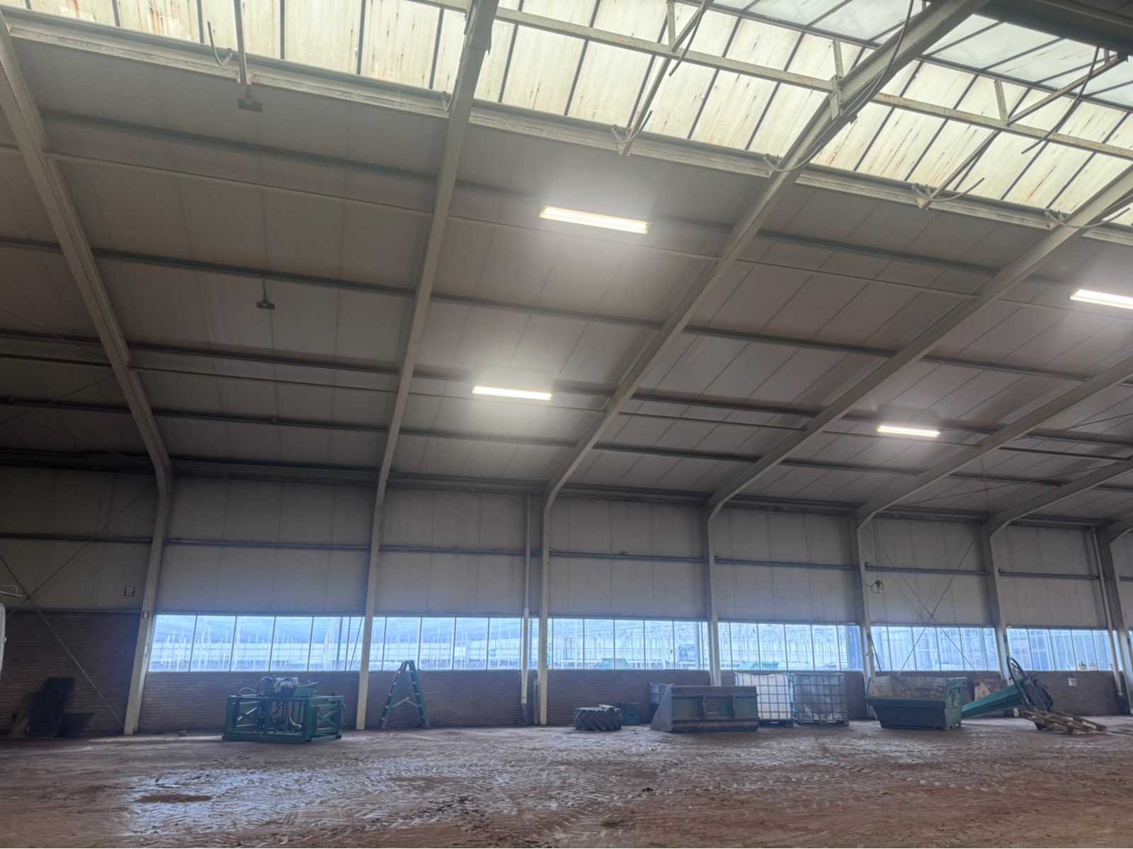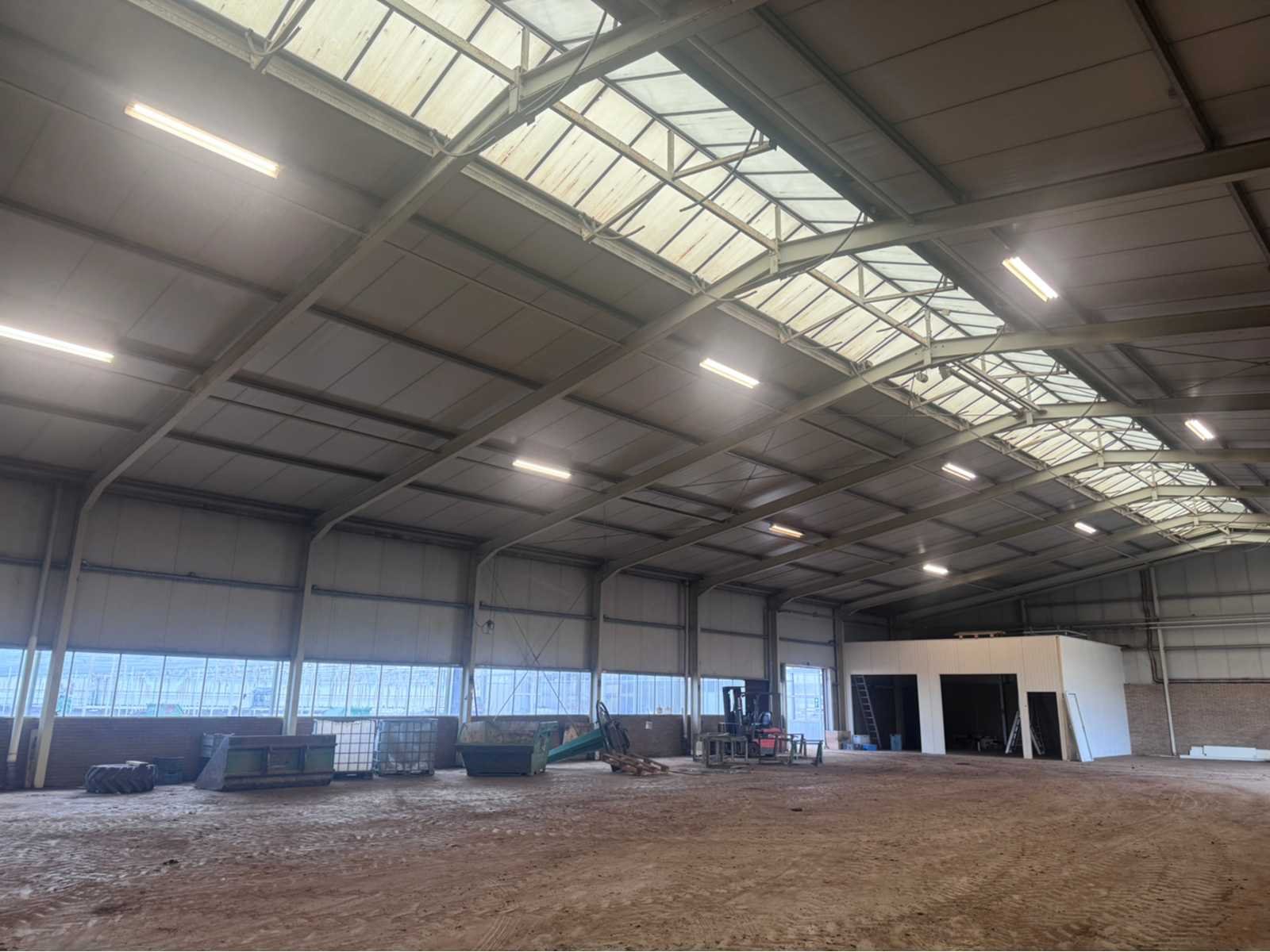Wit gecoate staalconstructie; vak 1; vrije overspanning van 19980 mm; lengte van 36400 mm; vak 2; aanbouw Dock gedeelte van 5800 mm breed en een lengte van 18800 mm; vak 3; vrije overspanning van 25800 mm; lengte van 14930 mm; vak 4; aanbouw gedeelte van 7690 mm diep en een lengte van 14930 mm; goothoogte aanbouw zijde kas is 5500 mm; nokhoogte is 8300 mm; goothoogte aanbouw vak 4 is 4200 mm; vakmaat 4500 mm; hoofd staanders IPE 300; spantbenen IPE 300; kopgevel staanders IPE 200; met kruisschoren en windverbanden; doorlopende nokluchting met mechanische aandrijving; met 3 overheaddeuren en de aanwezige gevel beplating; met Dock levelaar en bediening; zonnepaneel installatie van 290 panelen; 170 zonnepanelen zijn 270 WP; en 120 zonnepanelen zijn 255 WP; met 4 bijhorende omvormers; totale installatie is 76500 WP; met montage systeem en bijhorende bekabeling tot aan de omvormers; wordt vakkundig gedemonteerd door verkoper en transport klaar gemaakt;