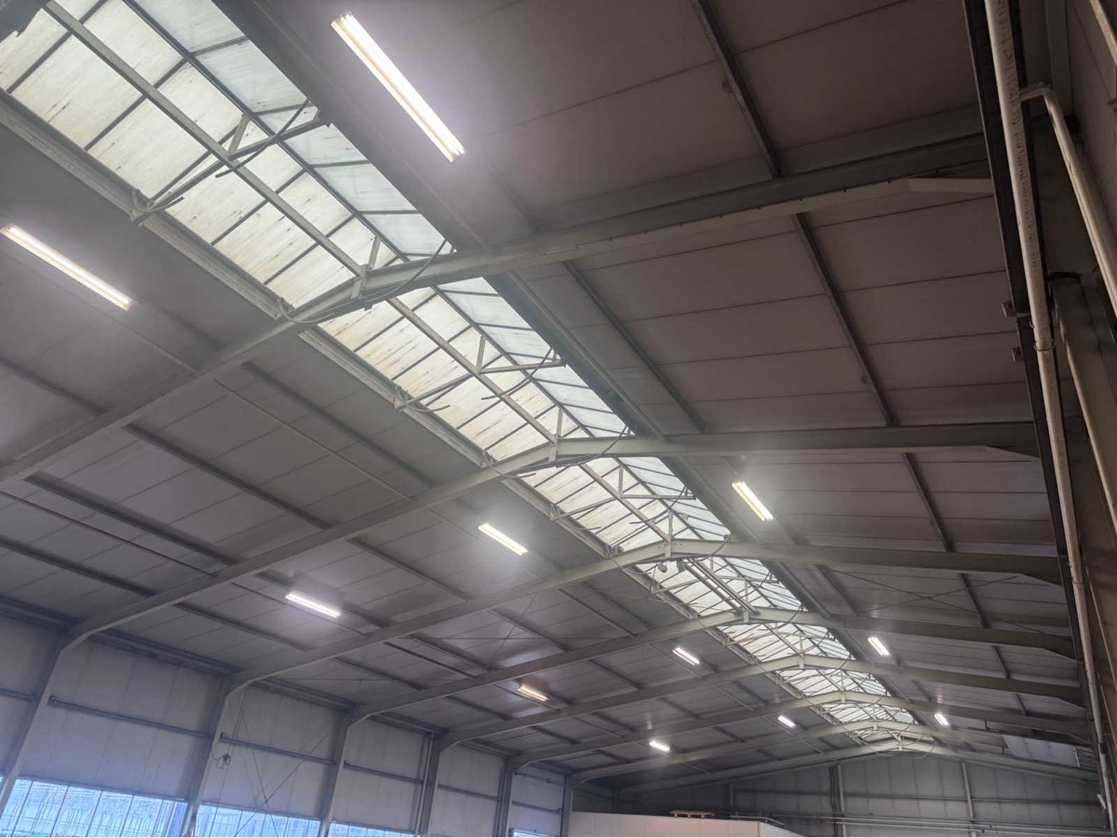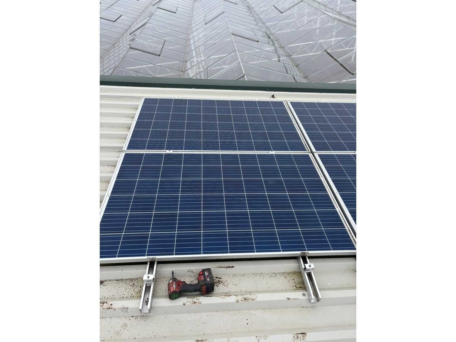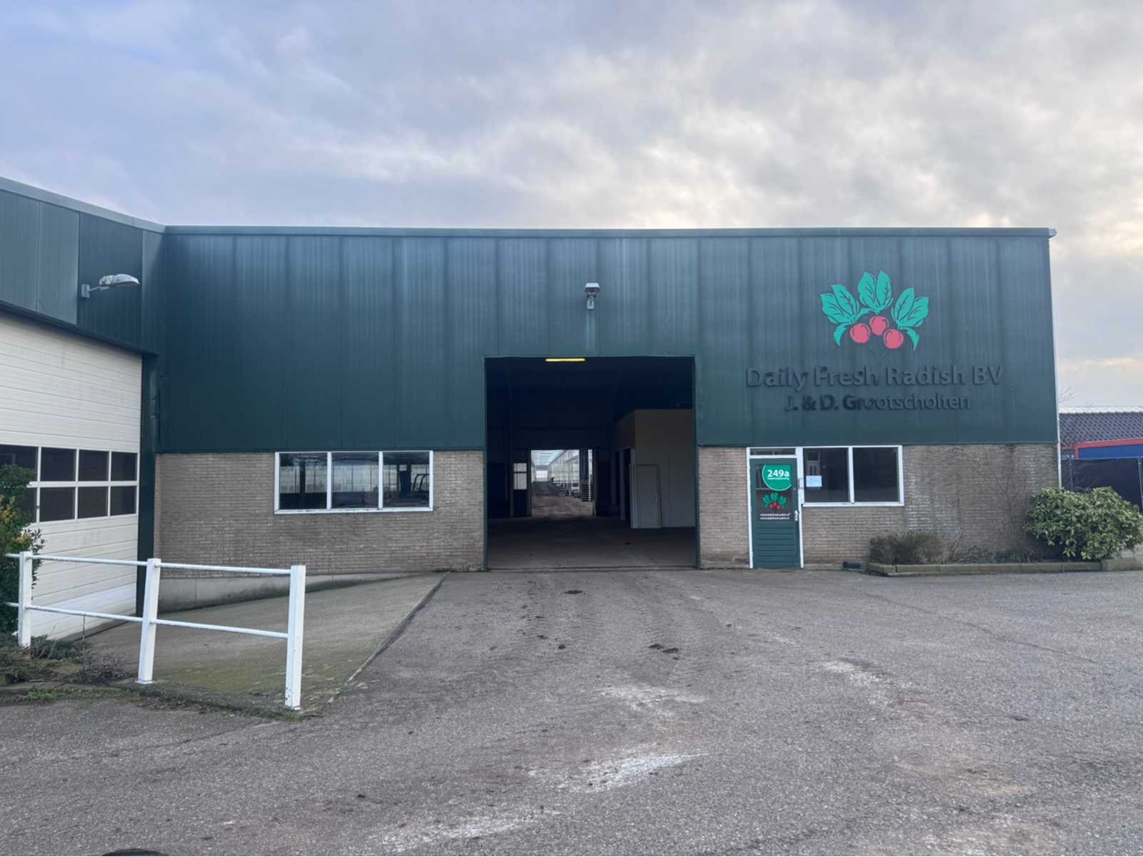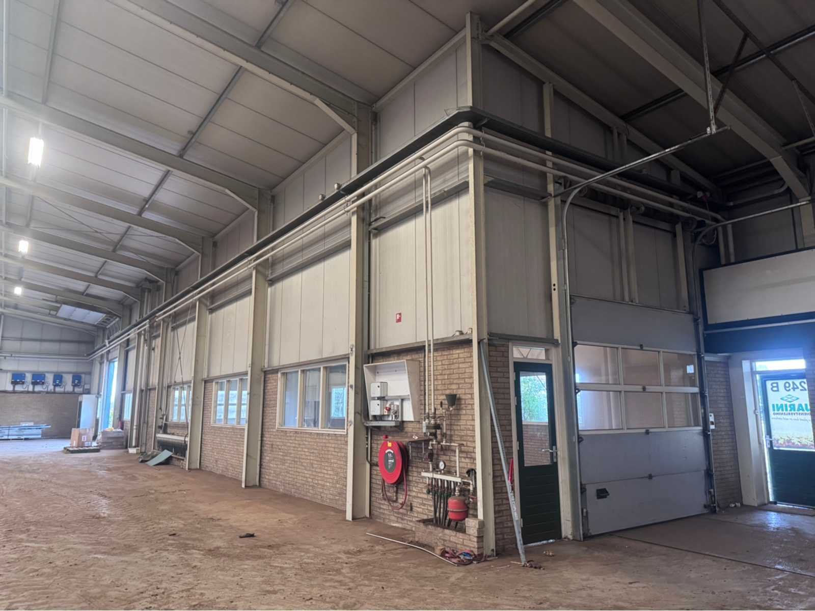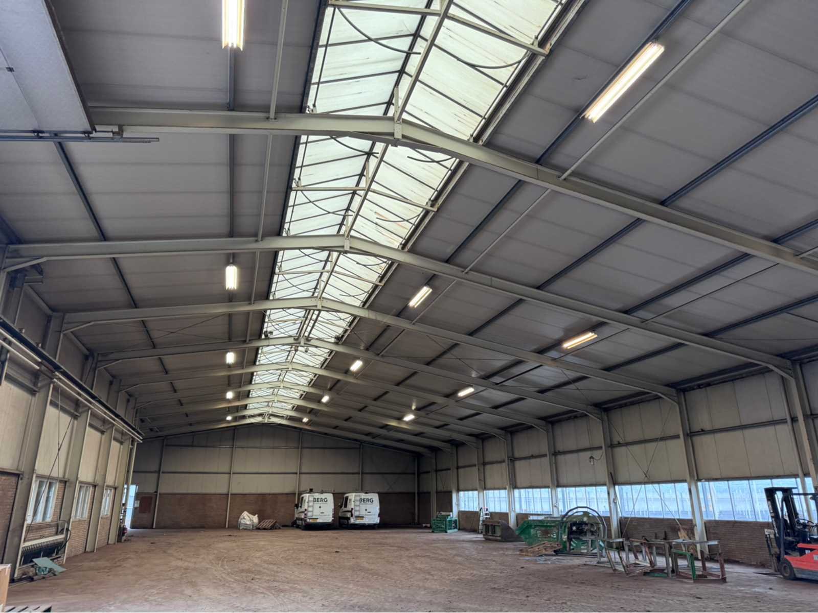 Wit gecoate staalconstructie; vak 1; vrije overspanning van 19980 mm; lengte van 36400 mm; vak 2; aanbouw Dock gedeelte van 5800 mm breed en een lengte van 18800 mm; vak 3; vrije overspanning van 25800 mm; lengte van 14930 mm; vak 4; aanbouw gedeelte van 7690 mm diep en een lengte van 14930 mm; goothoogte aanbouw zijde kas is 5500 mm; nokhoogte is 8300 mm; goothoogte aanbouw vak 4 is 4200 mm; vakmaat 4500 mm; hoofd staanders IPE 300; spantbenen IPE 300; kopgevel staanders IPE 200; met kruisschoren en windverbanden; doorlopende nokluchting met mechanische aandrijving; met 3 overheaddeuren en de aanwezige gevel beplating; met Dock levelaar en bediening; zonnepaneel installatie van 290 panelen; 170 zonnepanelen zijn 270 WP; en 120 zonnepanelen zijn 255 WP; met 4 bijhorende omvormers; totale installatie is 76500 WP; met montage systeem en bijhorende bekabeling tot aan de omvormers; wordt vakkundig gedemonteerd door verkoper en transport klaar gemaakt;