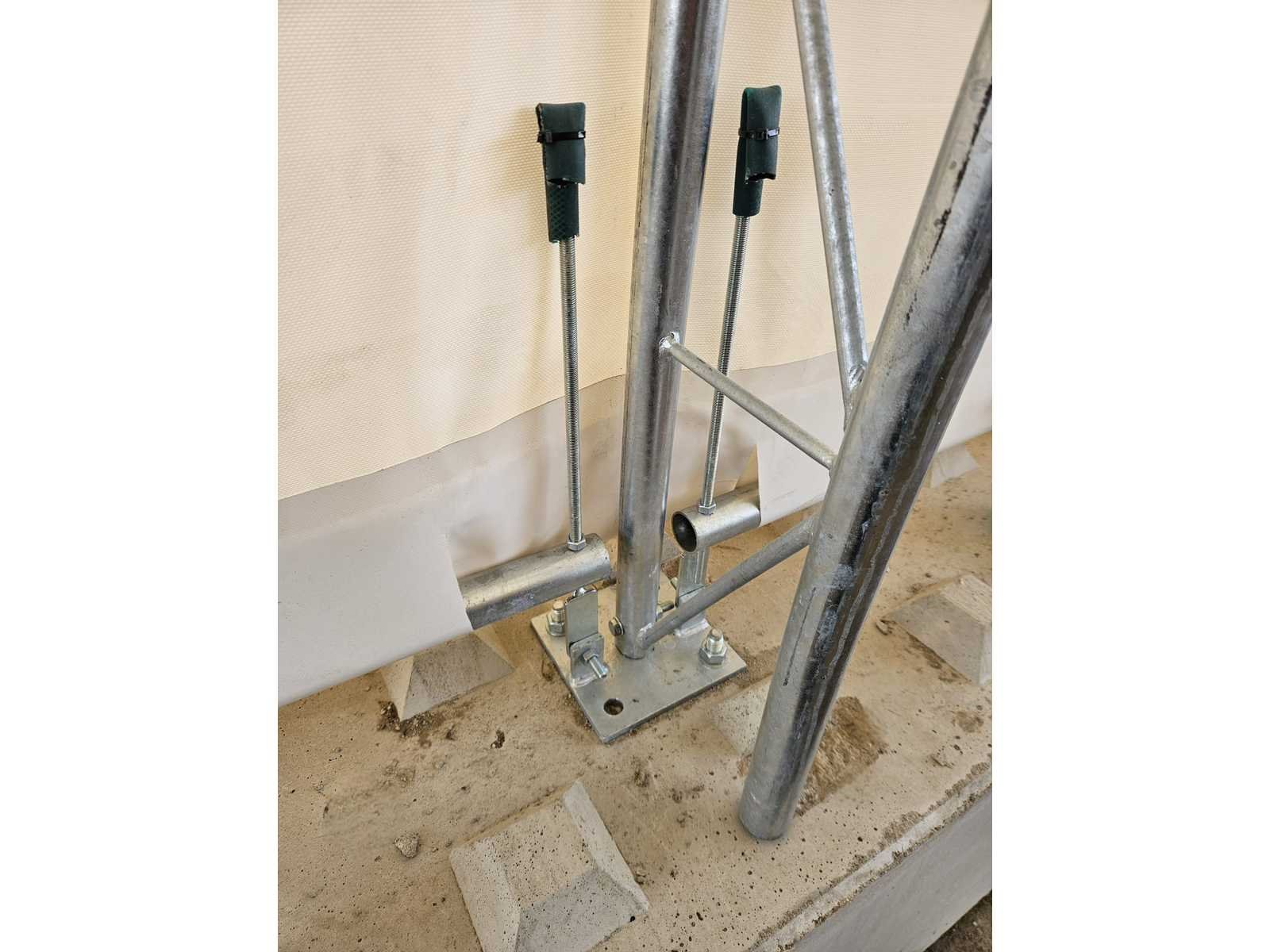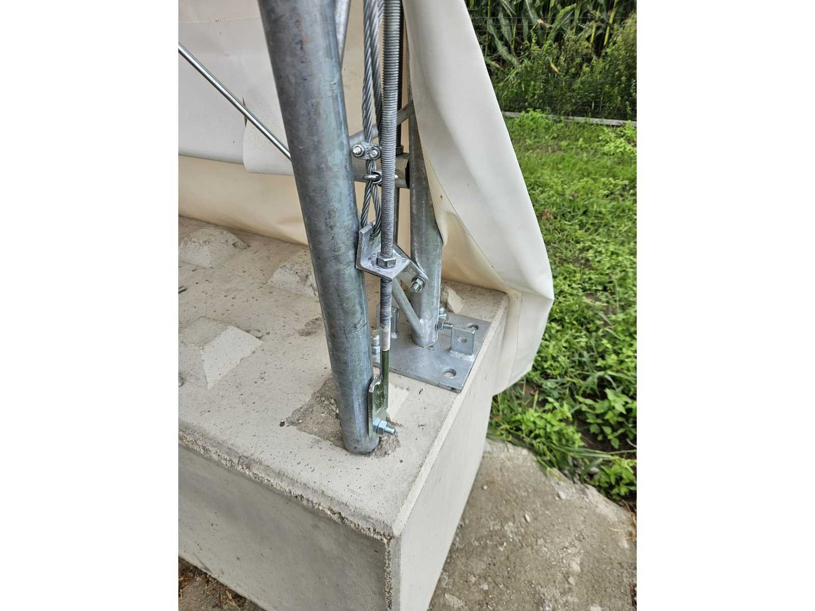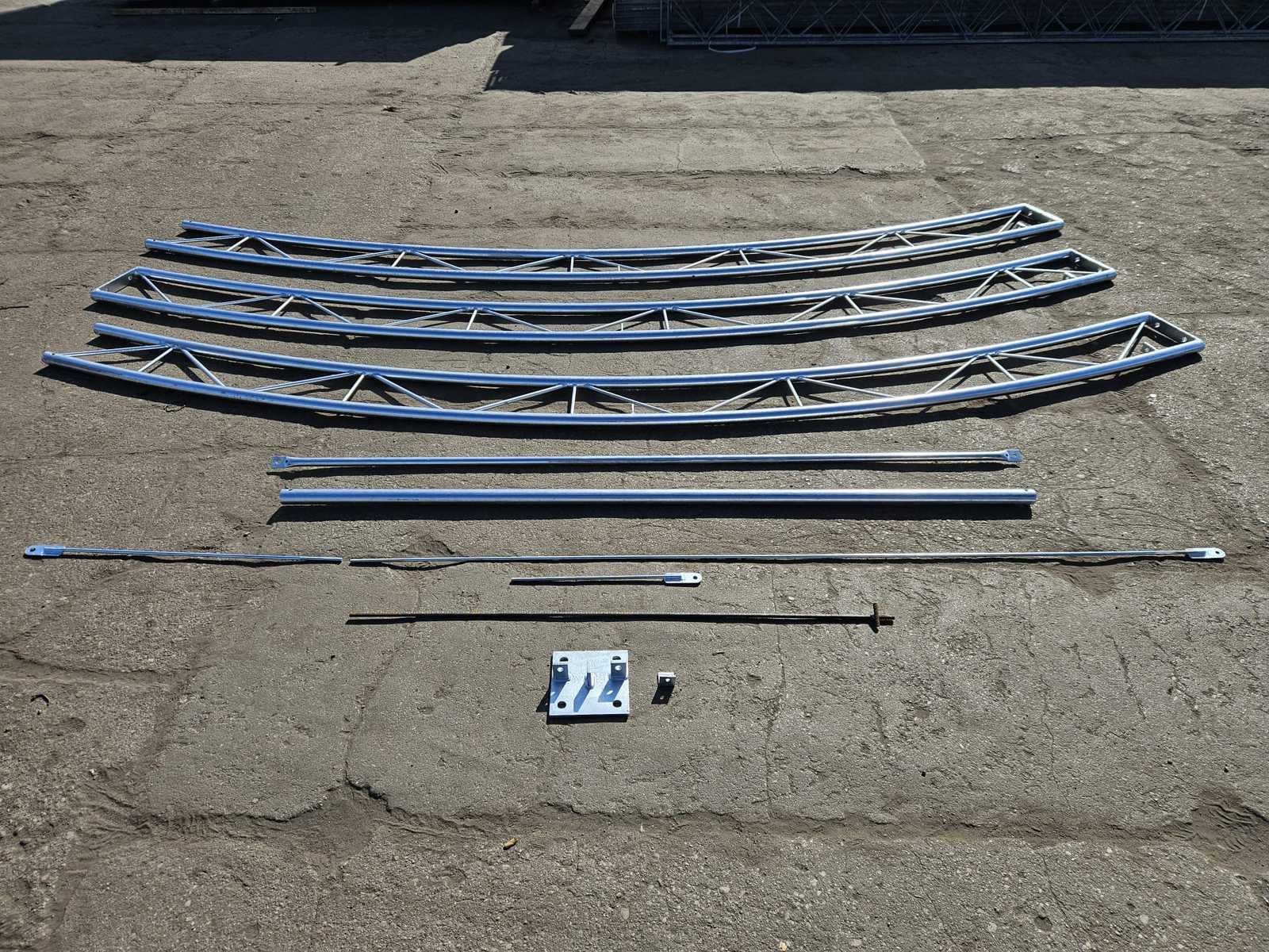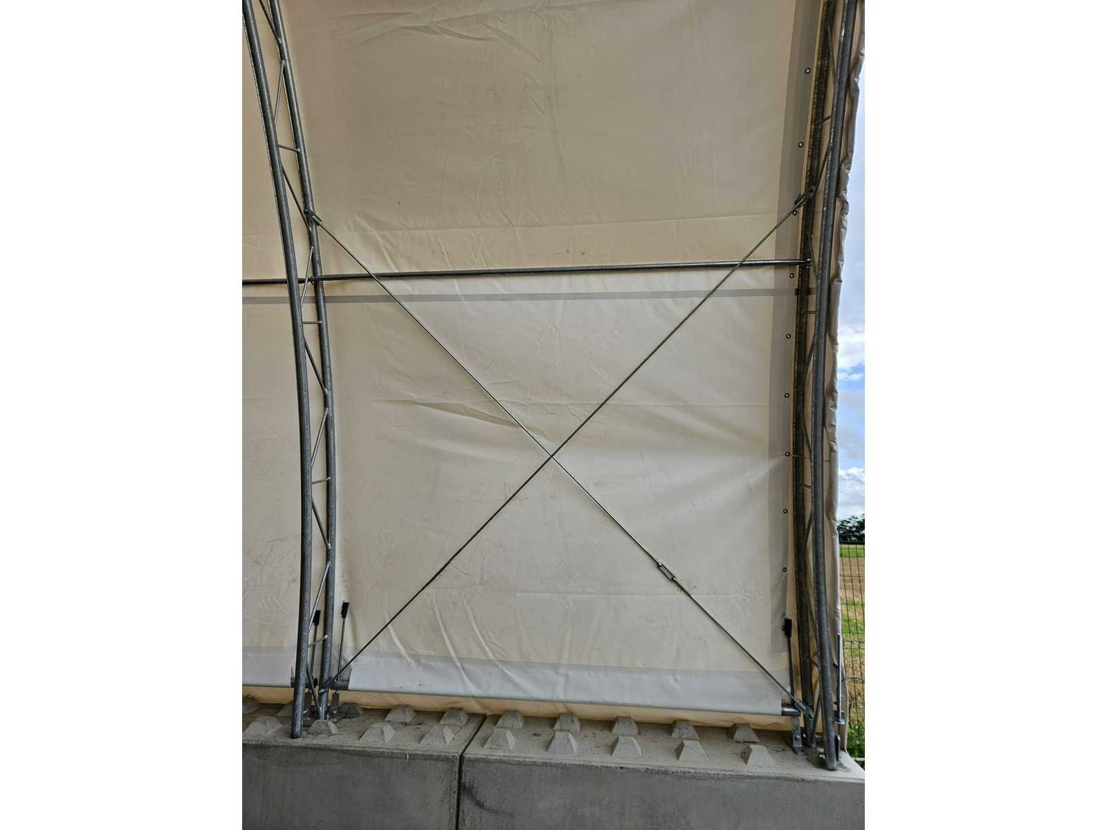 Vrije overspanning van 12000 mm; vakmaat 2500 mm; totaal 8 vakken van 2500 mm; nokhoogte 6000 mm; volblad verzinkte constructie; ongebruikte constructie met nieuw zeil; compleet met druk en trek stangen; voet platen en klein materiaal; wordt netjes verpakt door verkoper; Totaal oppervlakte: 240m² Nok hoogte: 6000mm