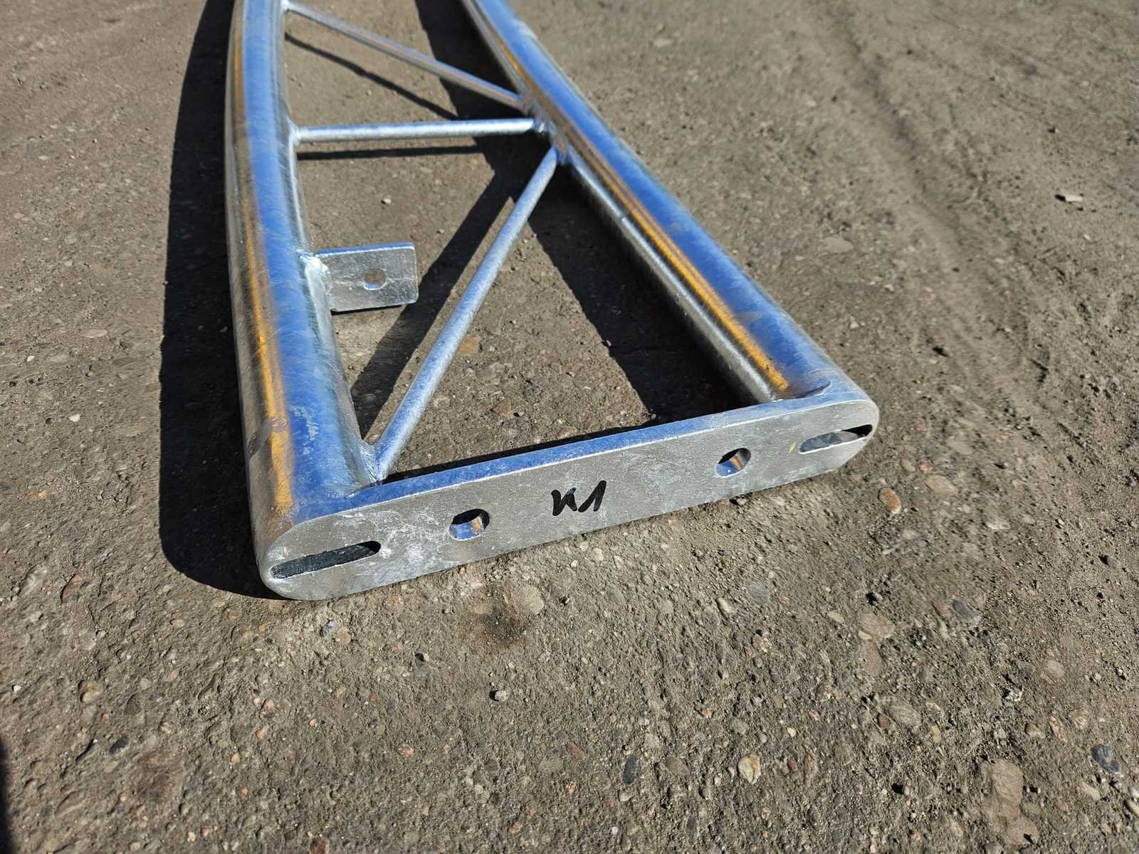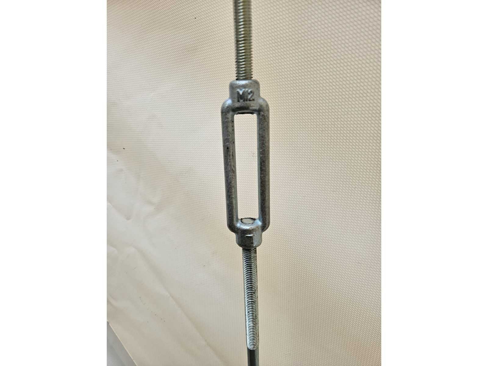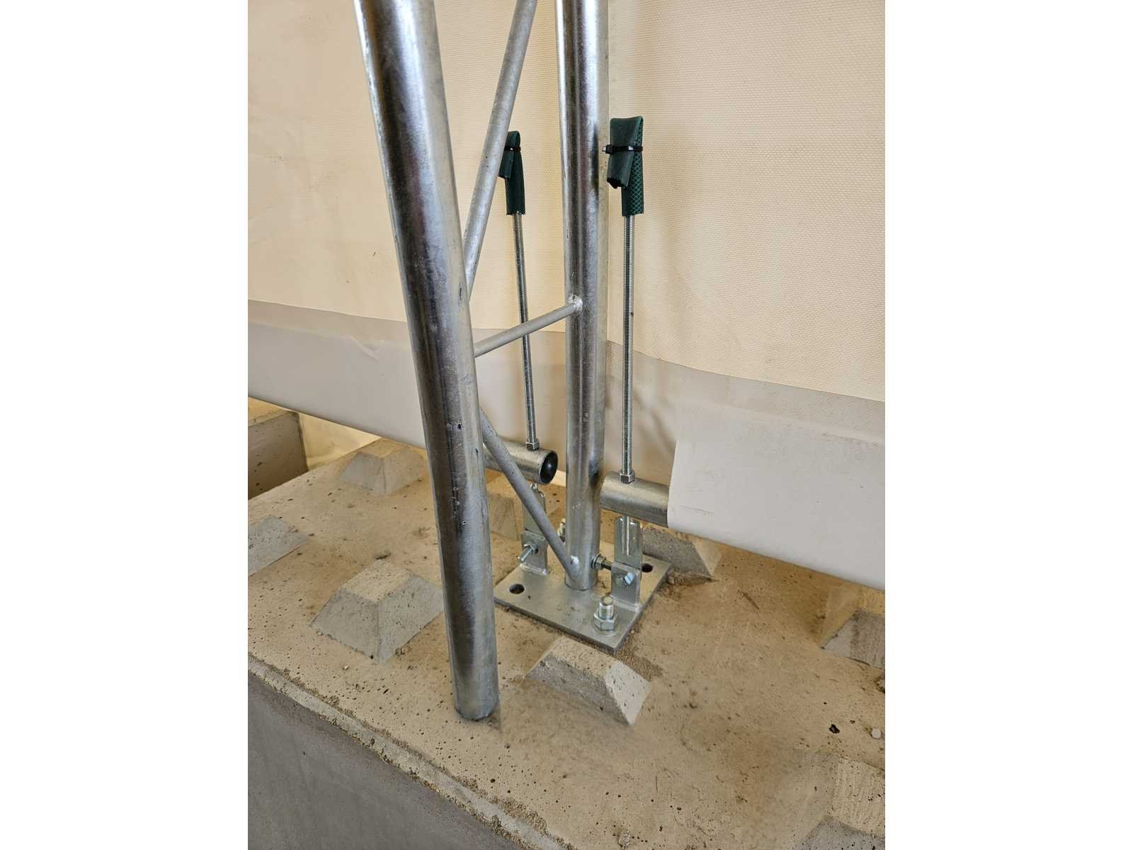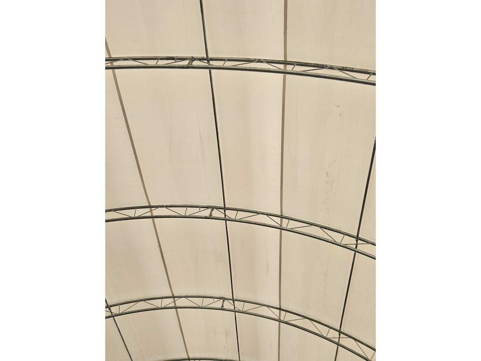 Vrije overspanning van 12000 mm; vakmaat 2500 mm; totaal 8 vakken van 2500 mm; nokhoogte 6000 mm; volblad verzinkte constructie; ongebruikte constructie met nieuw zeil; compleet met druk en trek stangen; voet platen en klein materiaal; wordt netjes verpakt door verkoper; Totaal oppervlakte: 240m² Nok hoogte: 6000mm