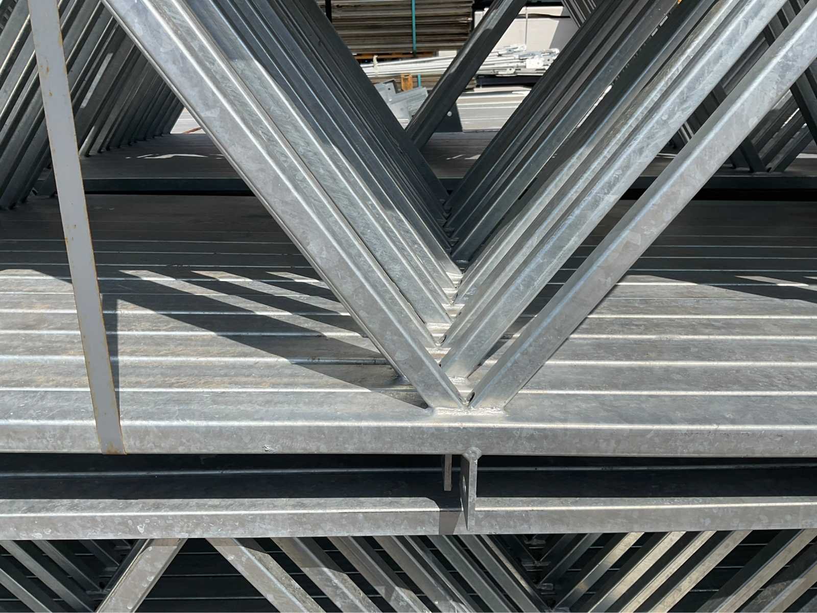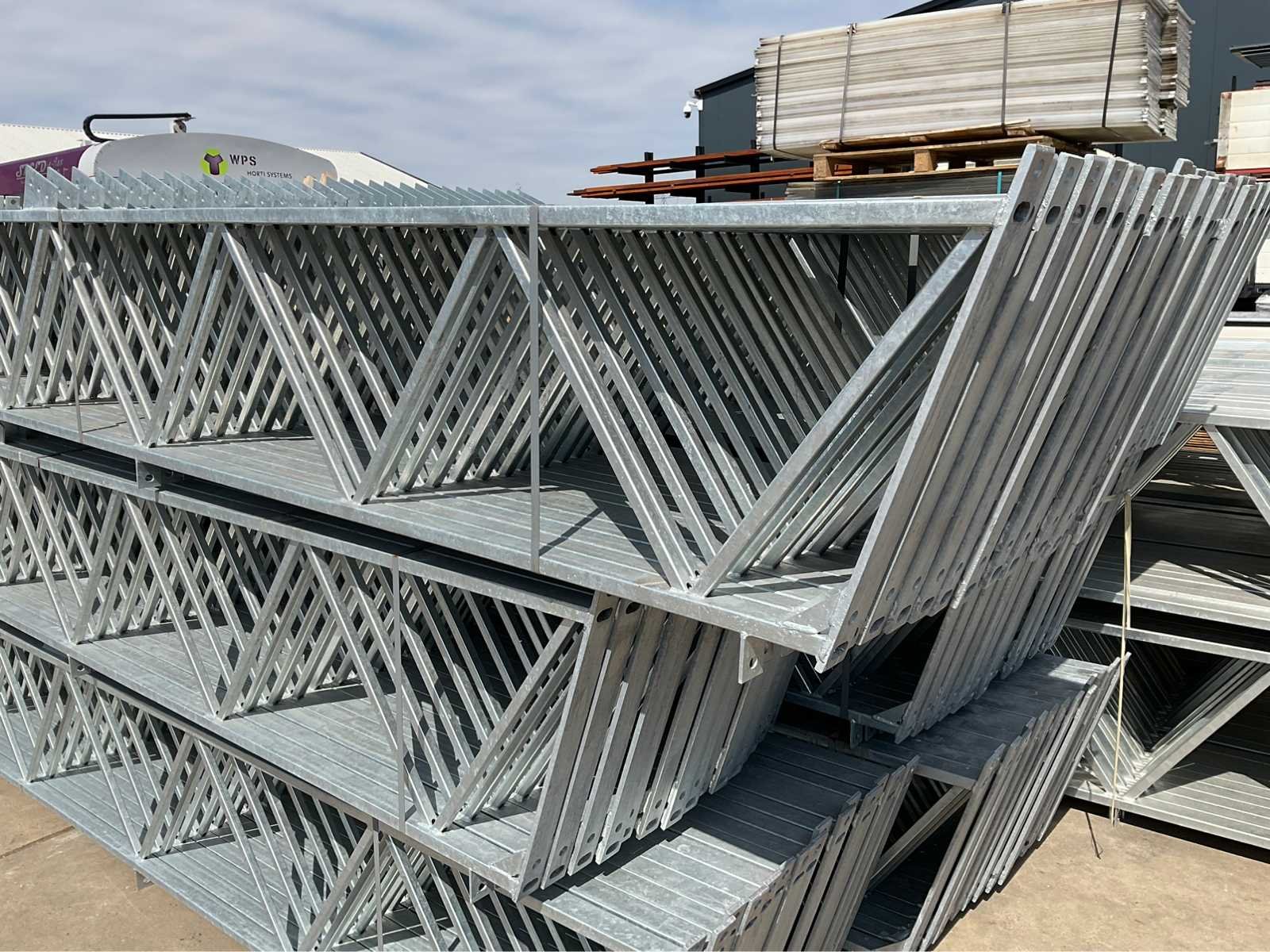 Ongebruikt; gegalvaniseerd staal; breedte / overspanning van deze spanten is ca 12000 mm het betreft bij deze kavel 3 sets spanten, dus 6 stuks halve spanten welke in de nok te koppelen zijn