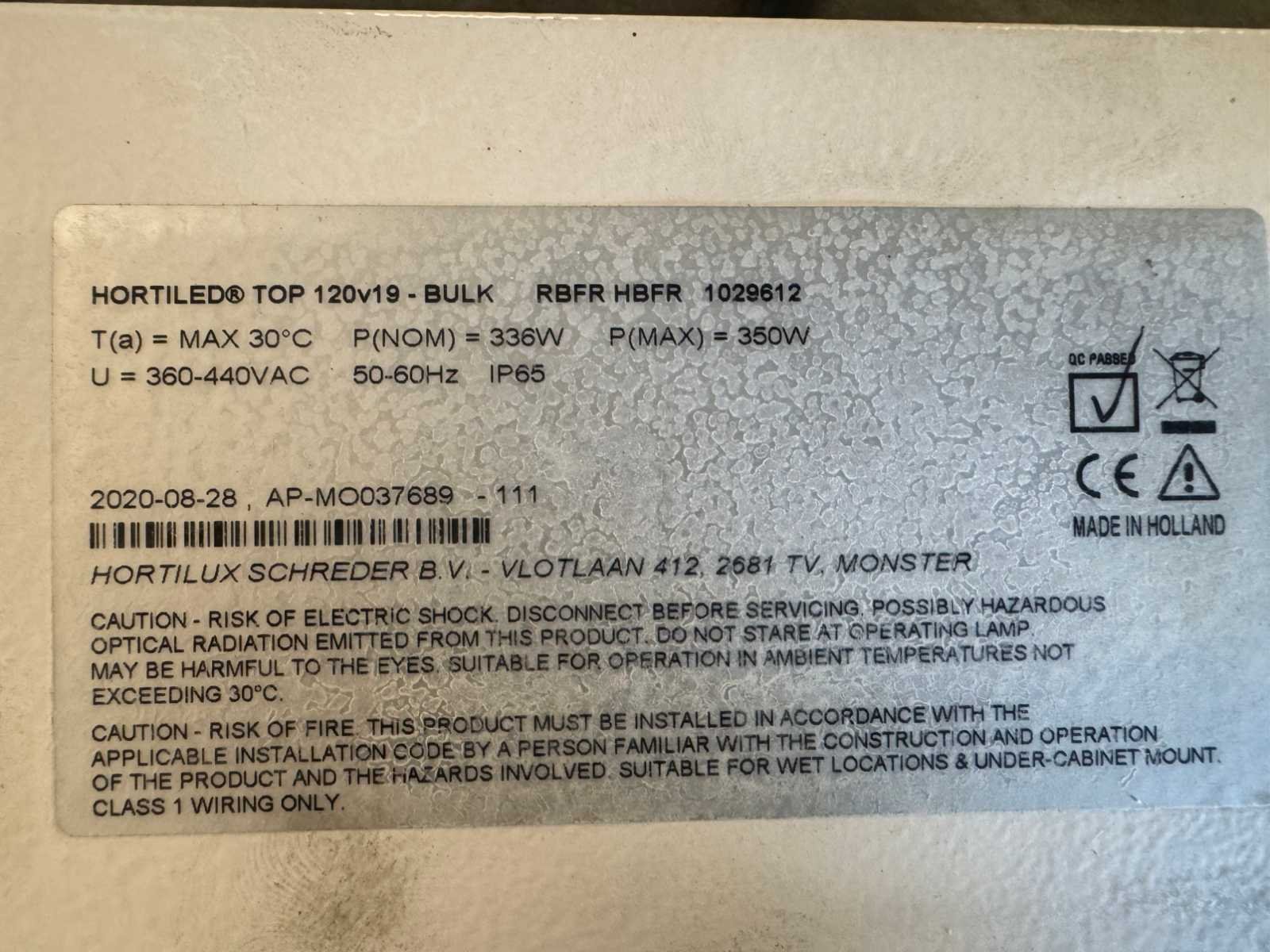 Merk: Hortilux Type: HortiLed Top 120v19 LED: true Vermogen: 350W Aansluiting: 380V Behuizing materiaal: Aluminium Totale afmeting L: 970mm Totale afmeting Breedte: 120mm Totale afmeting Hoogte: 118mm