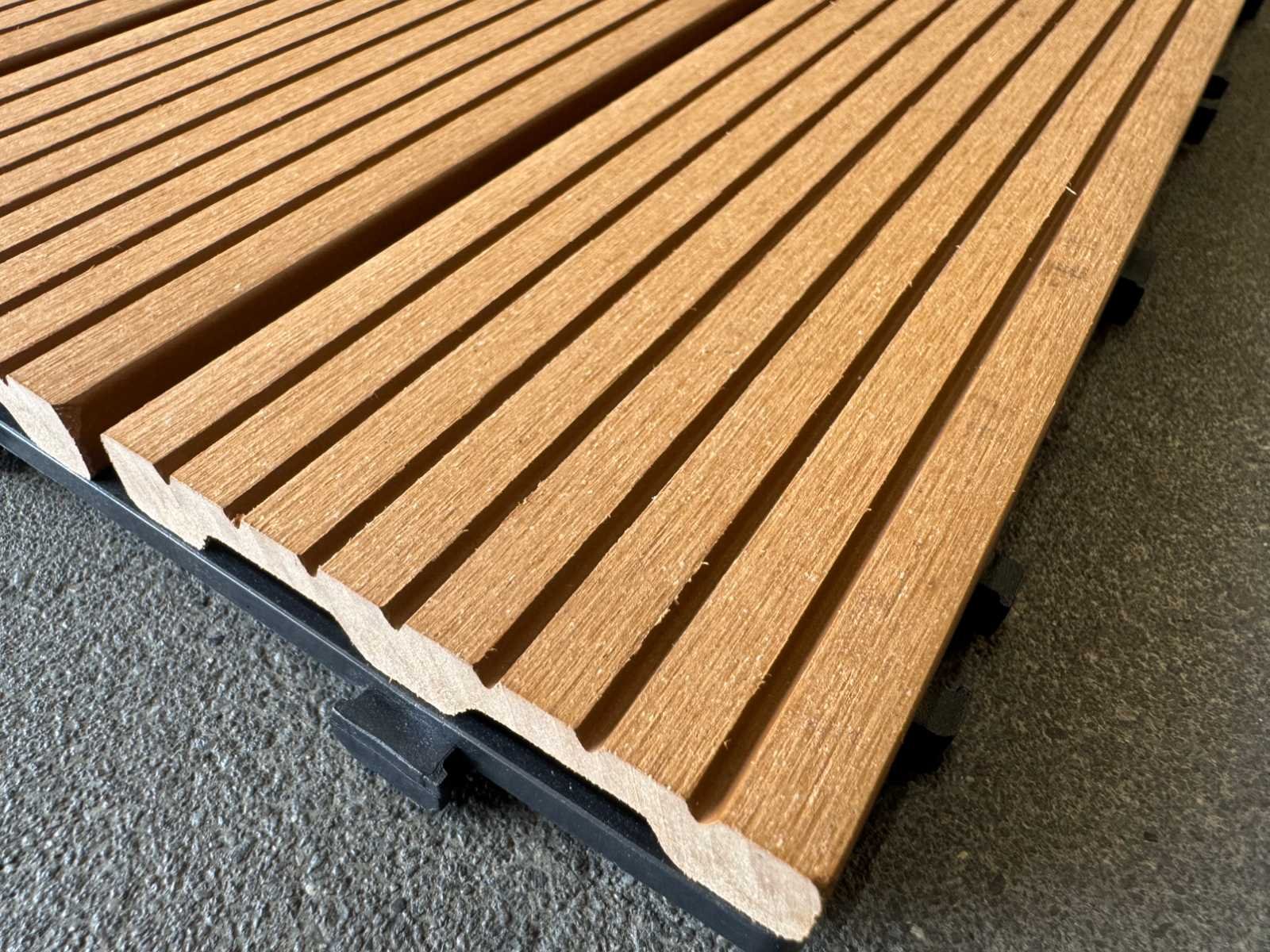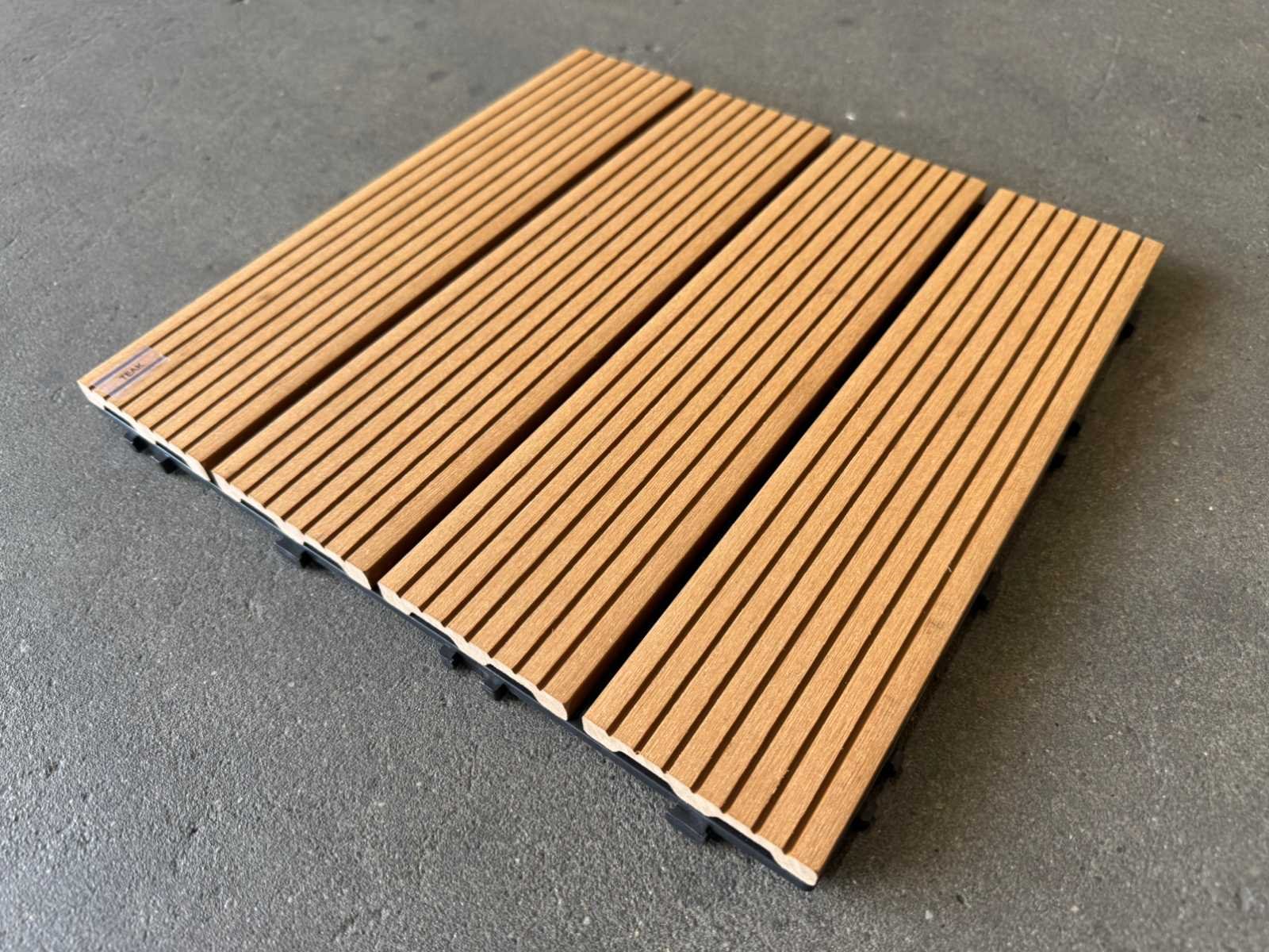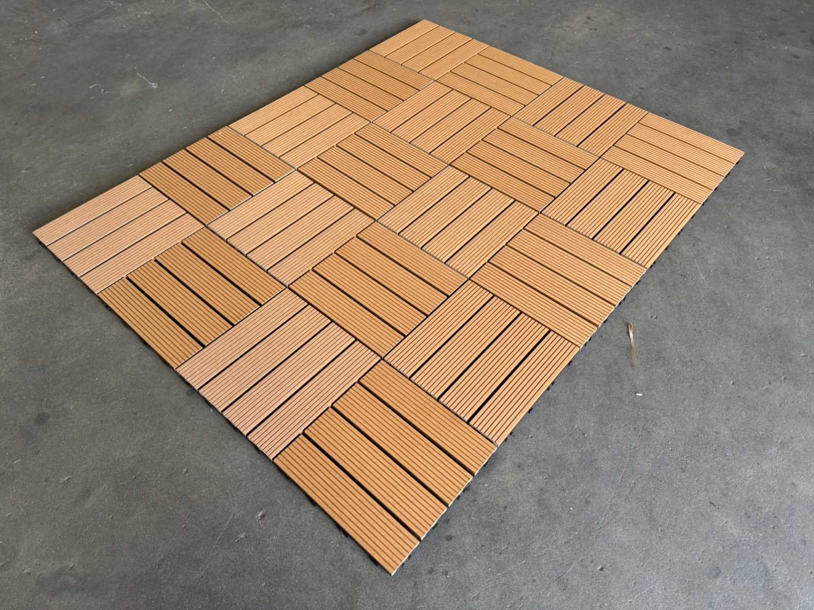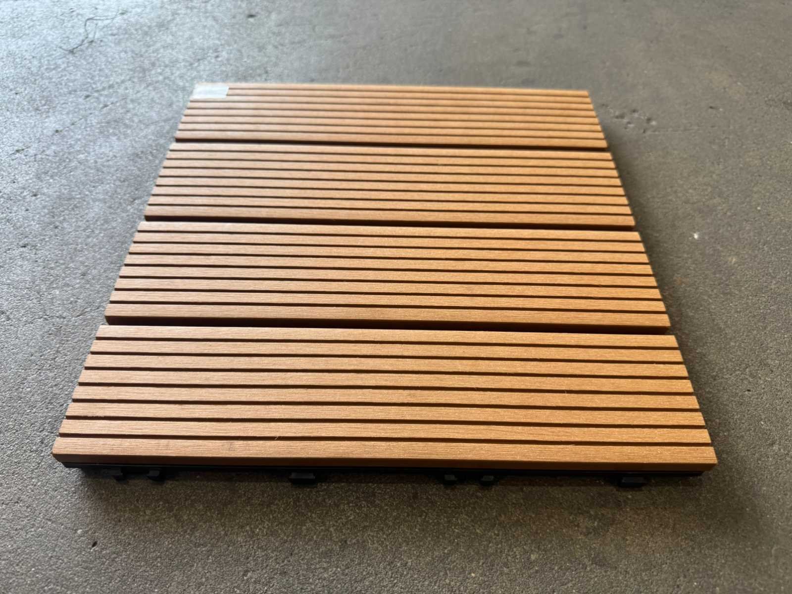 1 tegel is 0,09 m2; tegels zijn koppelbaar; dit kavel bestaat uit 111 stuks tegels Kleur: Teak Lengte: 300mm Breedte: 300mm Dikte: 20mm