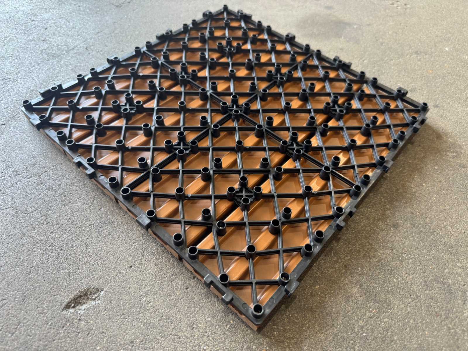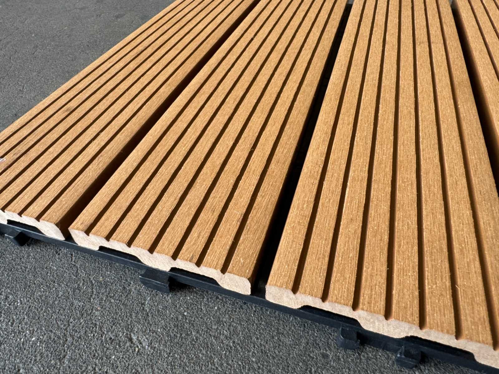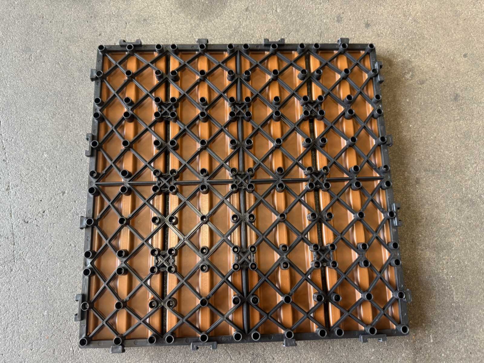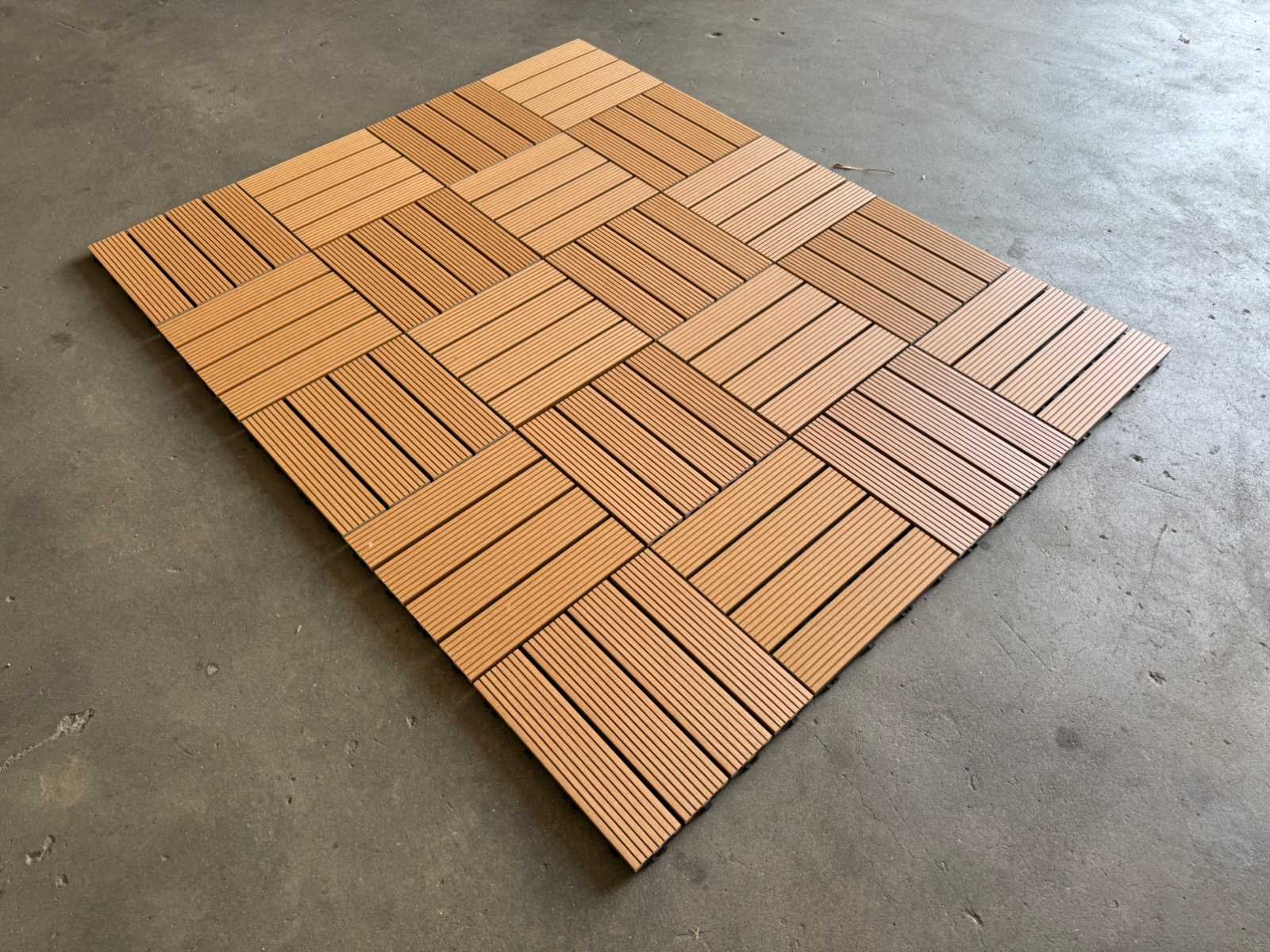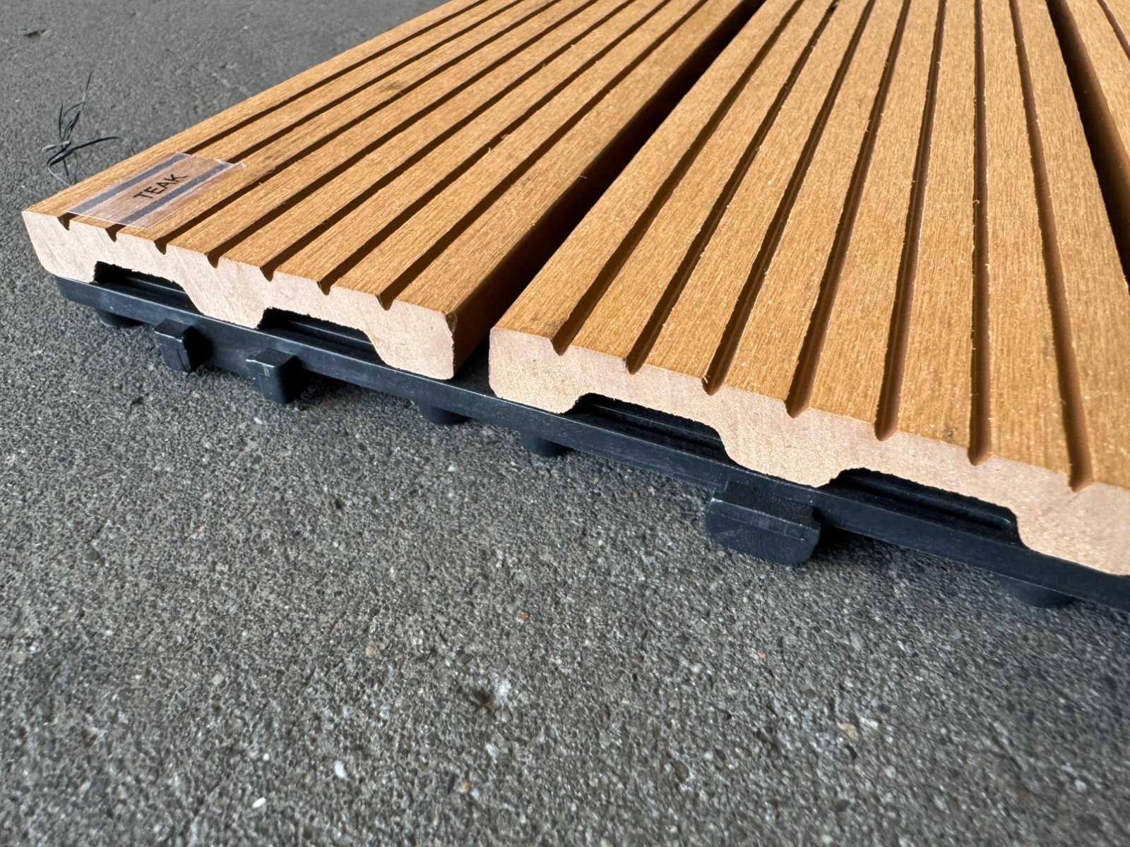 1 tegel is 0,09 m2; tegels zijn koppelbaar; dit kavel bestaat uit 111 stuks tegels Kleur: Teak Lengte: 300mm Breedte: 300mm Dikte: 20mm