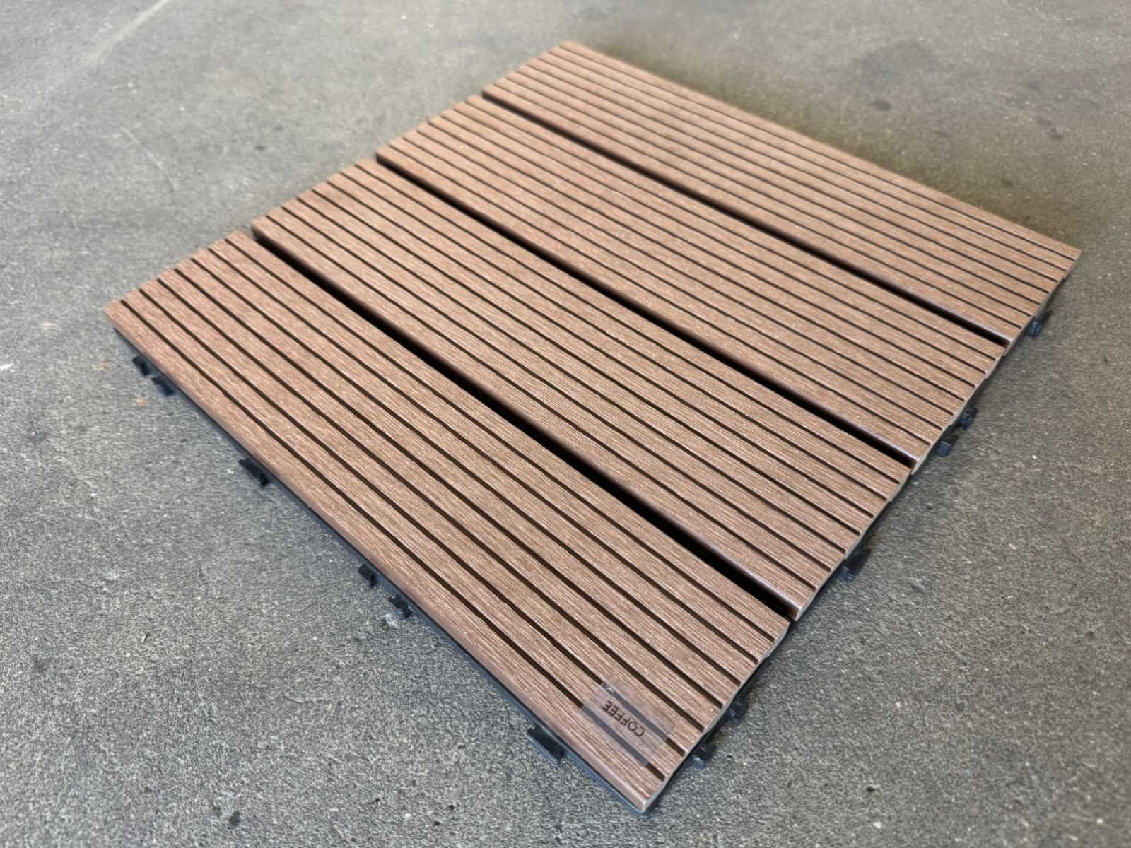 1 tegel is 0,09 m2; tegels zijn koppelbaar; dit kavel bestaat uit 111 stuks tegels Kleur: Coffee Lengte: 300mm Breedte: 300mm Dikte: 20mm