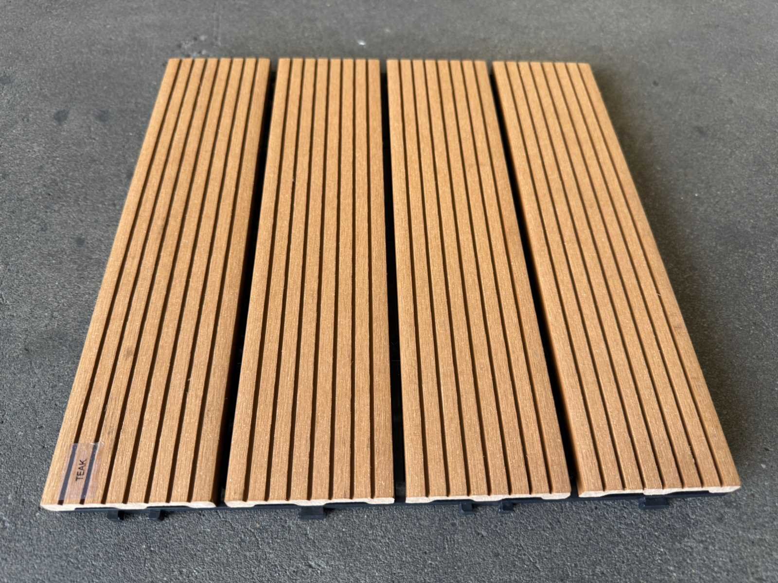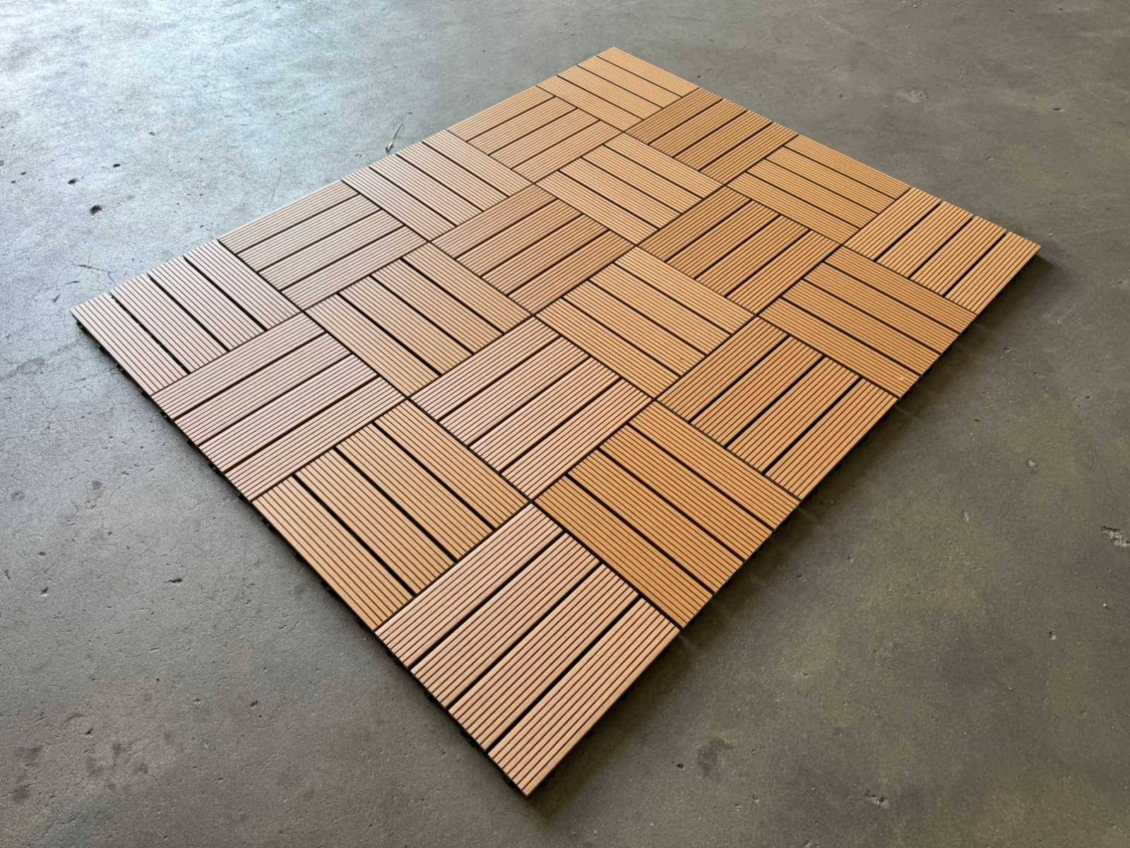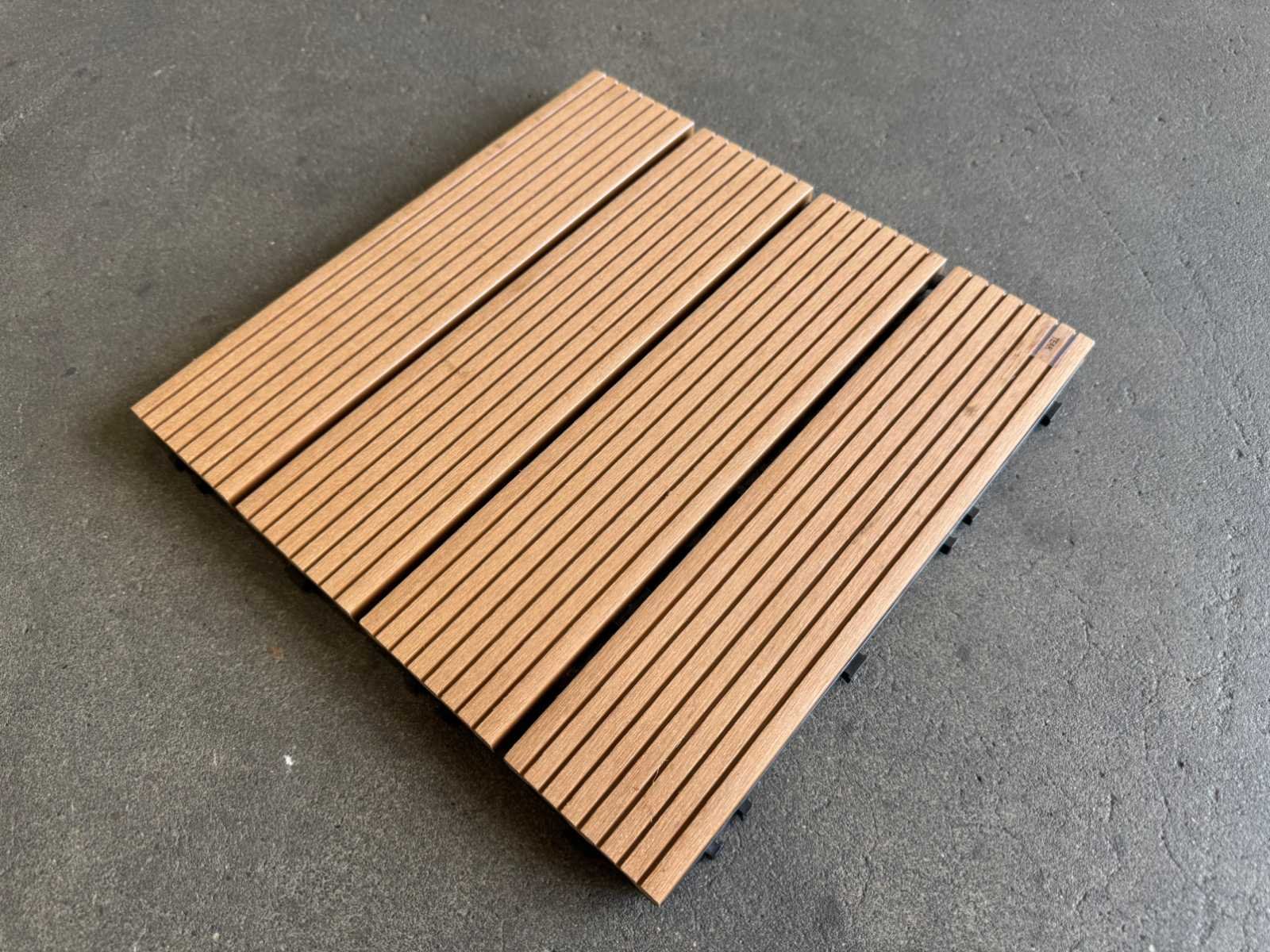 1 tegel is 0,09 m2; tegels zijn koppelbaar; dit kavel bestaat uit 111 stuks tegels Kleur: Teak Lengte: 300mm Breedte: 300mm Dikte: 20mm