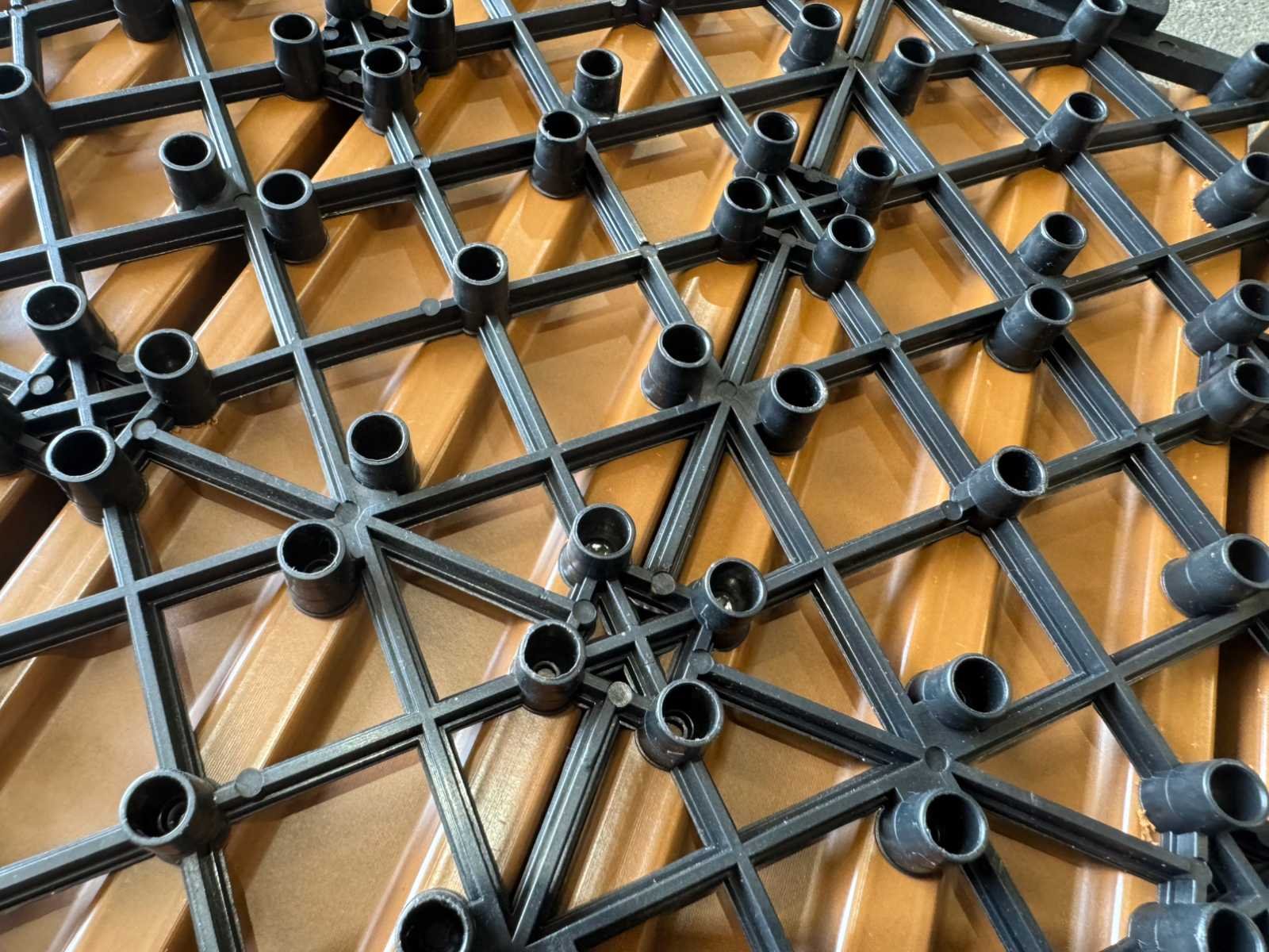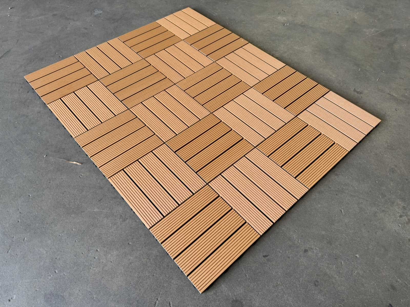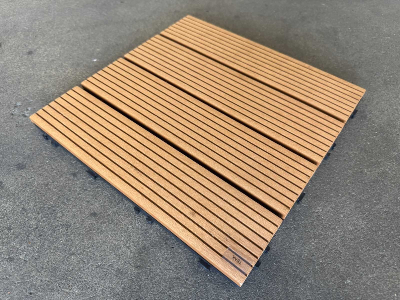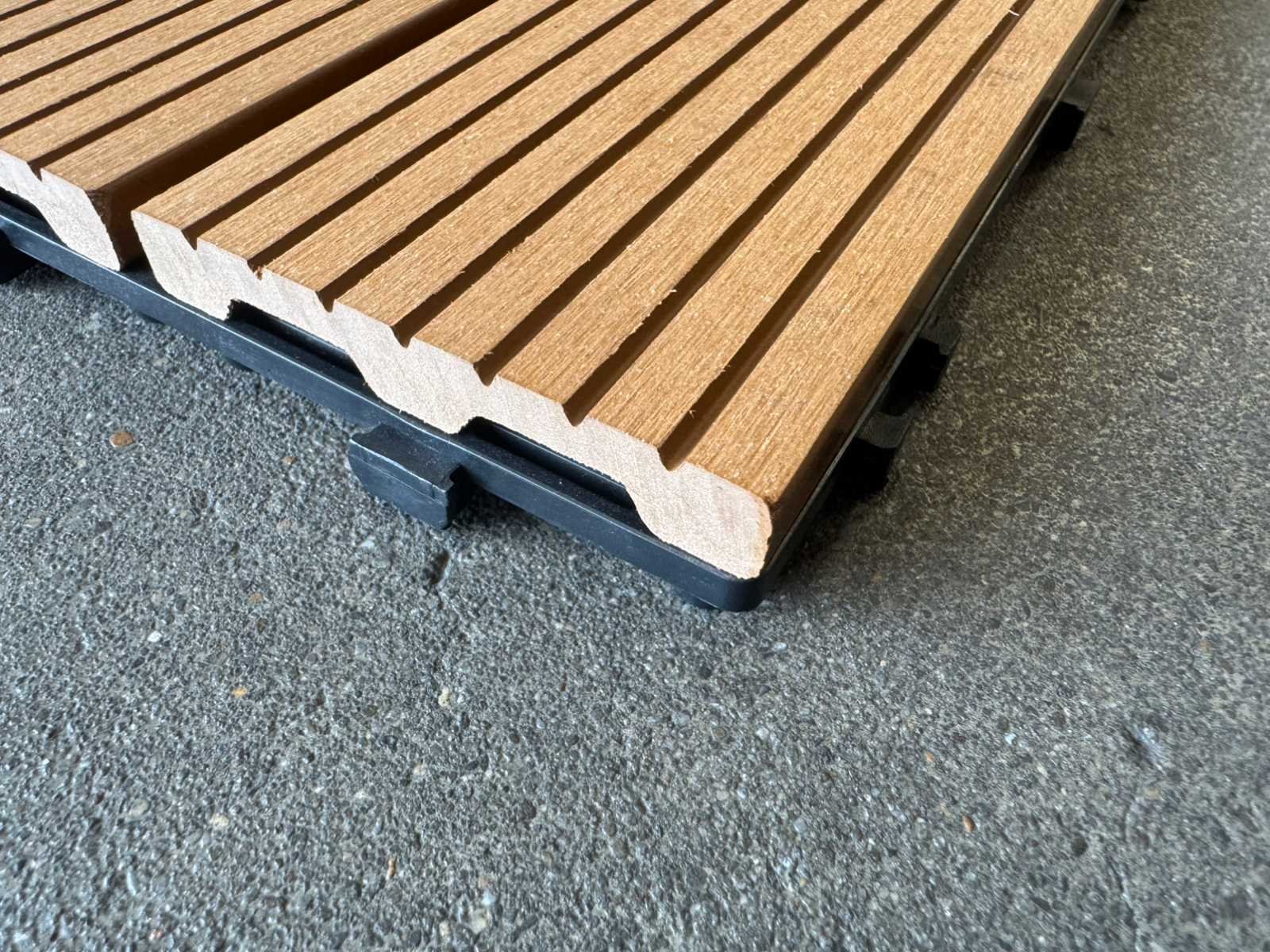 1 tegel is 0,09 m2; tegels zijn koppelbaar; dit kavel bestaat uit 111 stuks tegels Kleur: Teak Lengte: 300mm Breedte: 300mm Dikte: 20mm