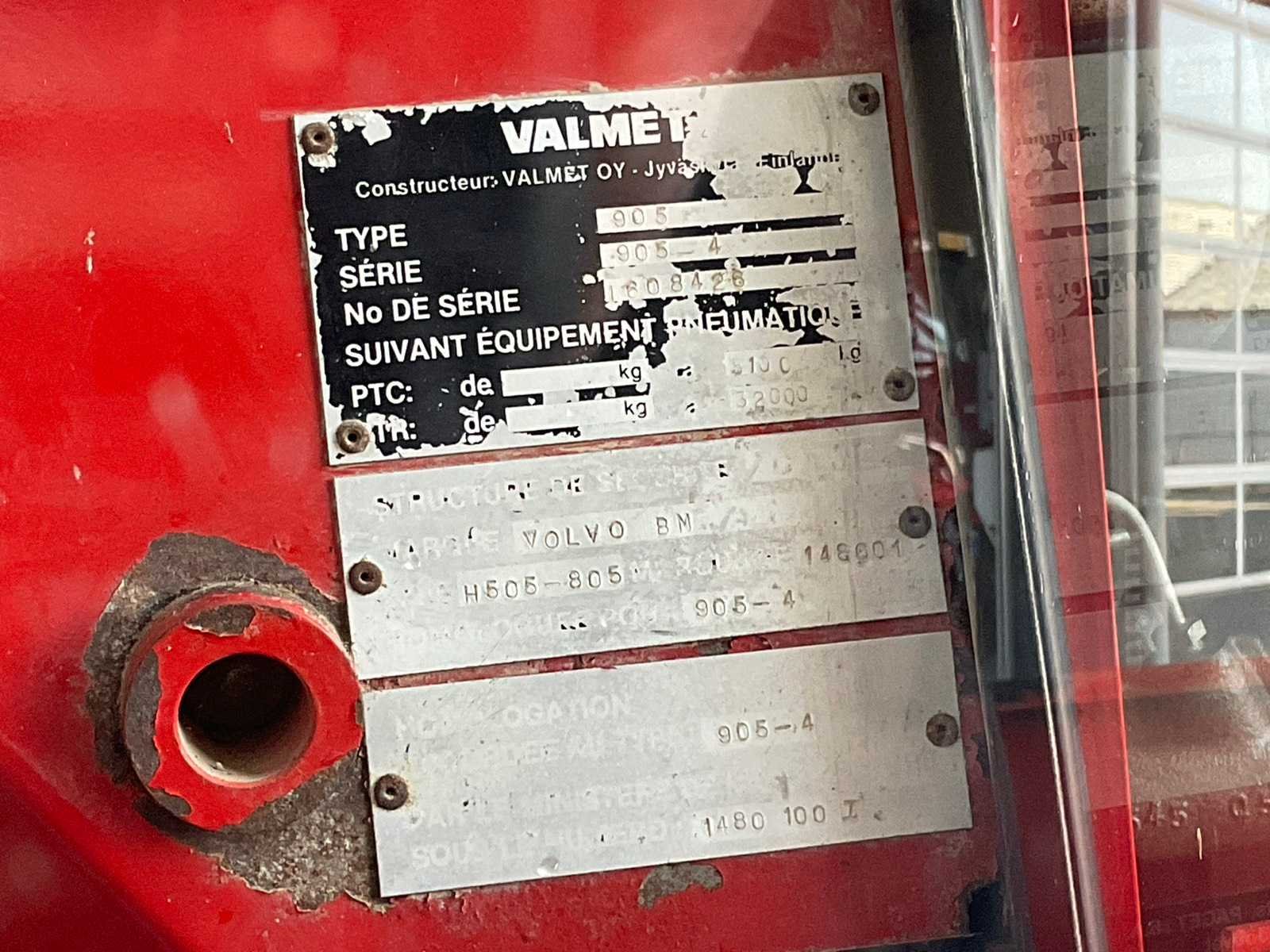 Kipperknobbel, verstelbare boventrekhaak, topstang, hydraulisch wagenremventiel, spoorbreedte 1770mm, spatbordbediening. Let op! Deze tractor heeft olie lekkage aan dieselmotor, Franse registratie papieren Merk: Valmet Type: 905 Autocontrol Bouwjaar: 1988 Serienummer: 1608426 Kenteken: Franse registratiedocumenten Afgelezen urenstand: 14426 Versnellingsbaktype: Handgeschakeld + HiLo Aantal hydraulische ventielen achter: 2 Bandenmaat voor: 14.9R28 Michelin Bandenmaat achter: 18.4-38 Carlisle Cabine: true Totale afmeting L: 5000mm Totale afmeting Breedte: 2200mm Totale afmeting Hoogte: 2750mm