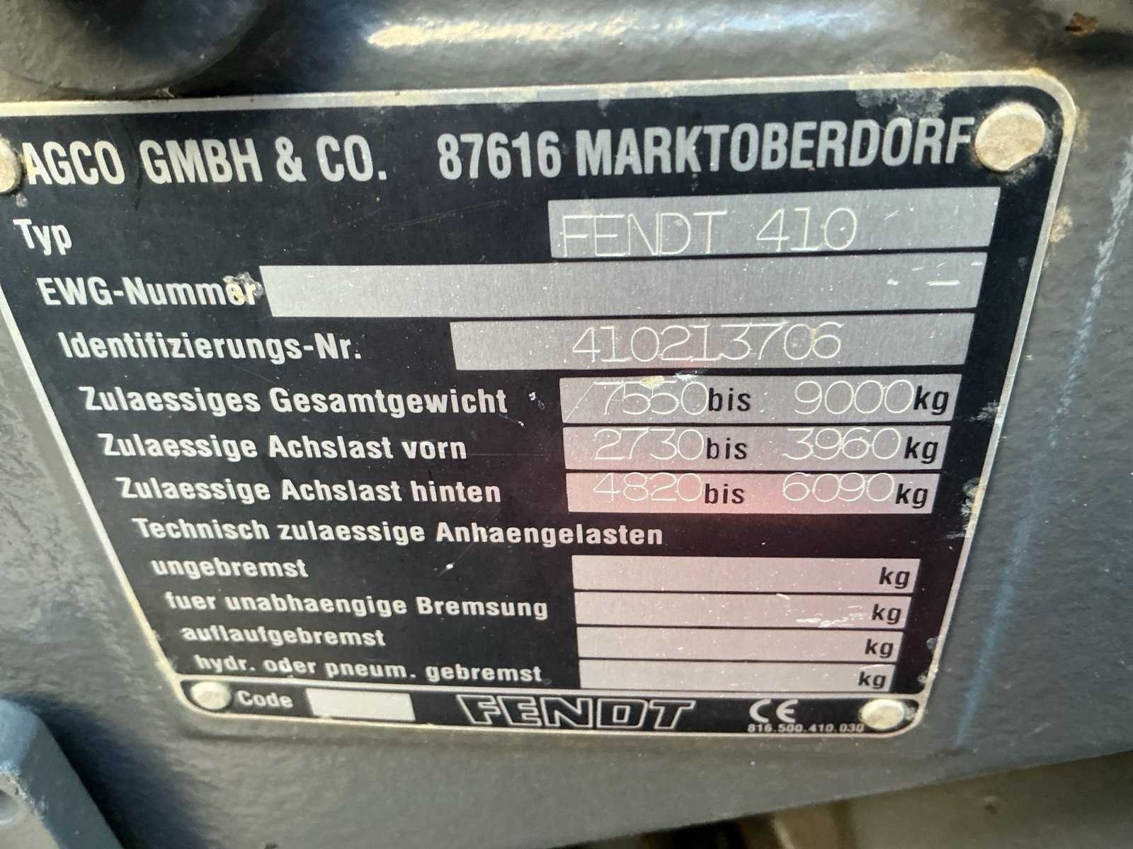 Let op! Betreft Fendt 410 met stickers en een kenteken registratie van een Fendt 412! Voorasvering. Ondertrekhaak, verstelbare boventrekhaak, topstang, load sensing, hydraulisch wagenremventiel, airco, spoorbreedte 1800mm, 540/750/1000 pto rpm, Merk: Fendt Type: 410 Vario Bouwjaar: 2004 Serienummer: 410213706 Kenteken: TBB-58-H Afgelezen urenstand: 13033 Versnellingsbaktype: Vario Aantal hydraulische ventielen voor: 2 Aantal hydraulische ventielen achter: 3 Bandenmaat voor: 340/85R28 BKT Bandenmaat achter: 460/85R38 BKT Load sensing: true Fronthefinrichting: true Cabine: true Luchtgeveerde stoel: true Totale afmeting L: 5000mm Totale afmeting Breedte: 2300mm Totale afmeting Hoogte: 2800mm Datum eerste toelating: 2004-06-30