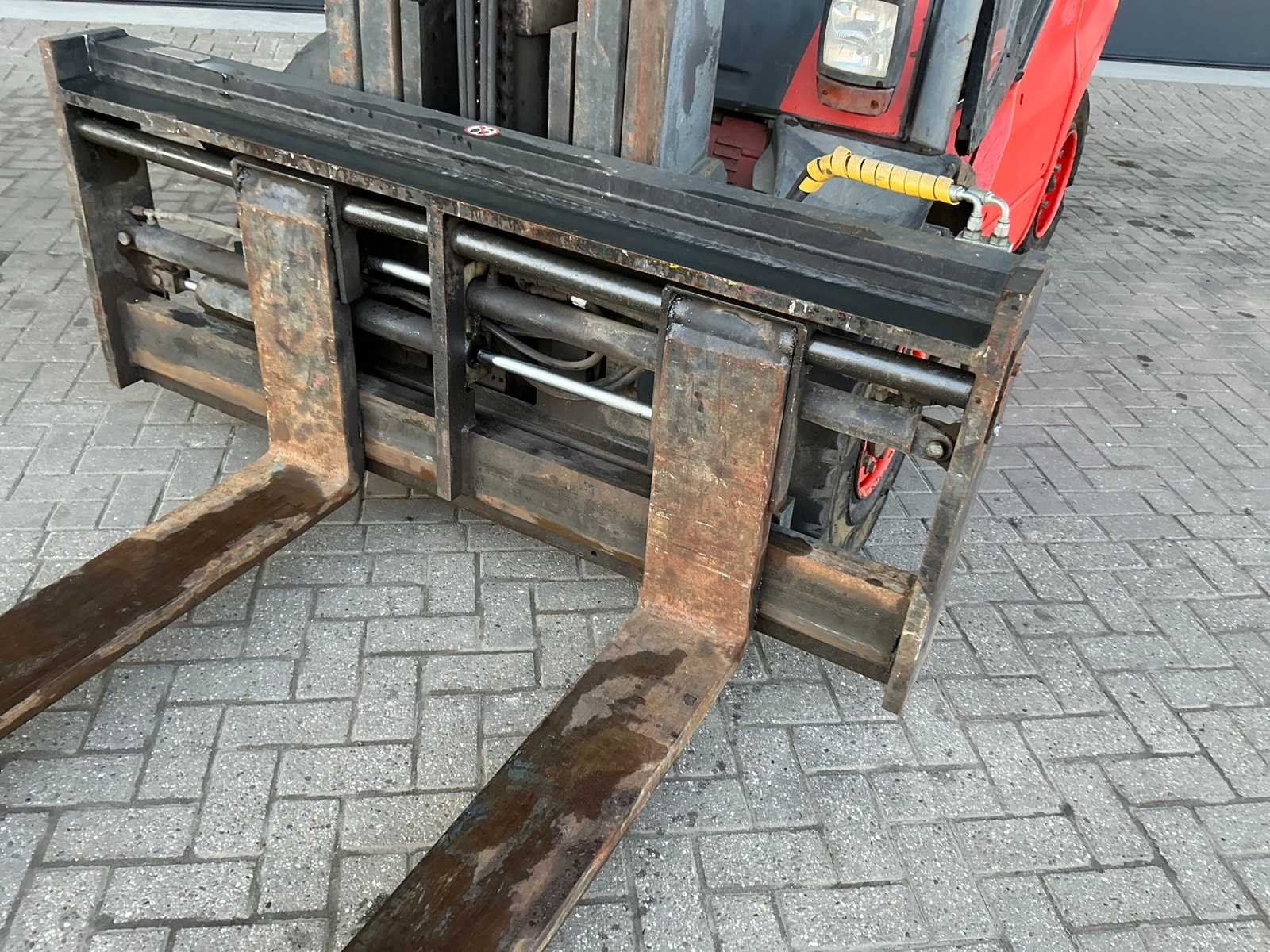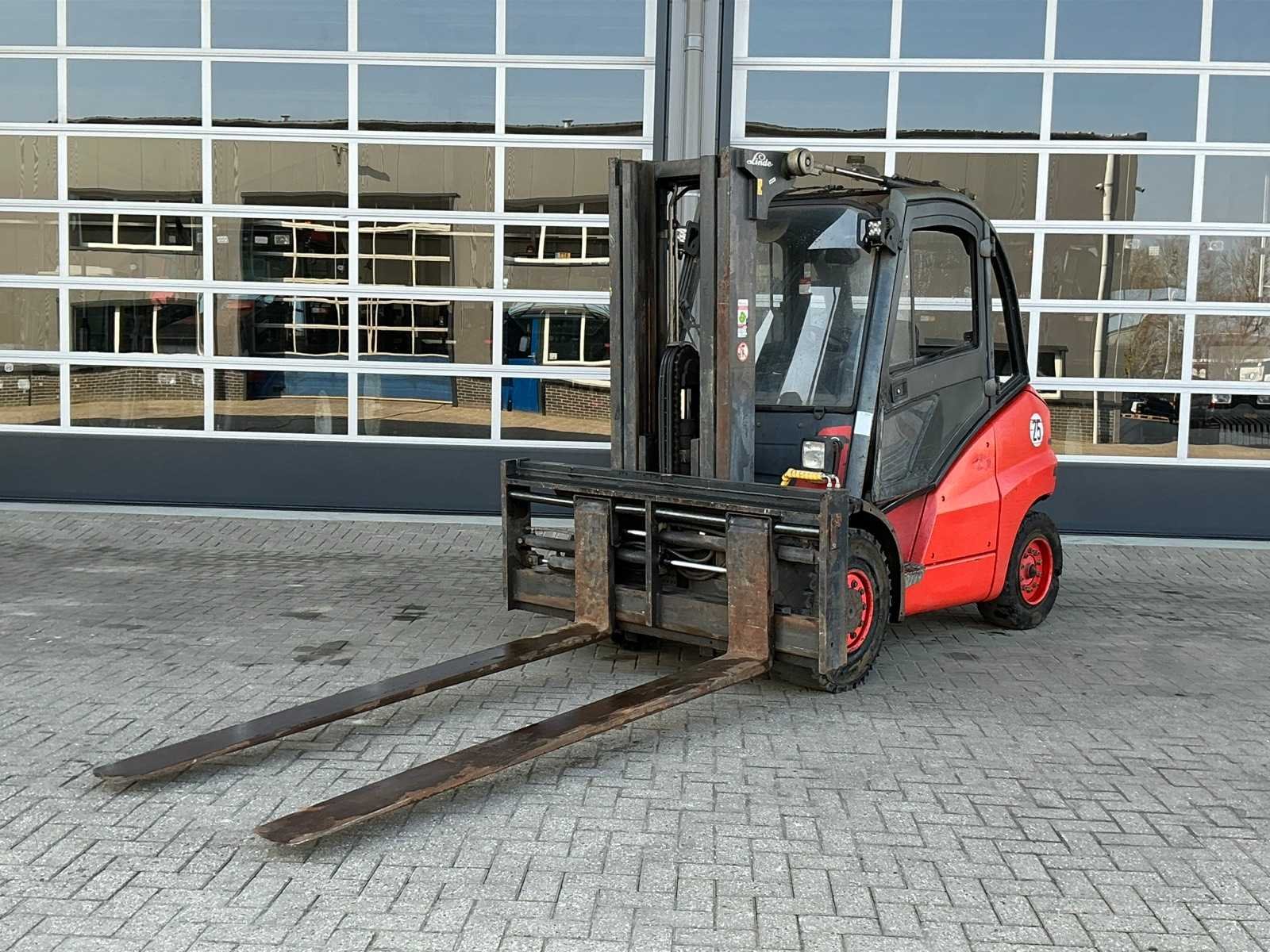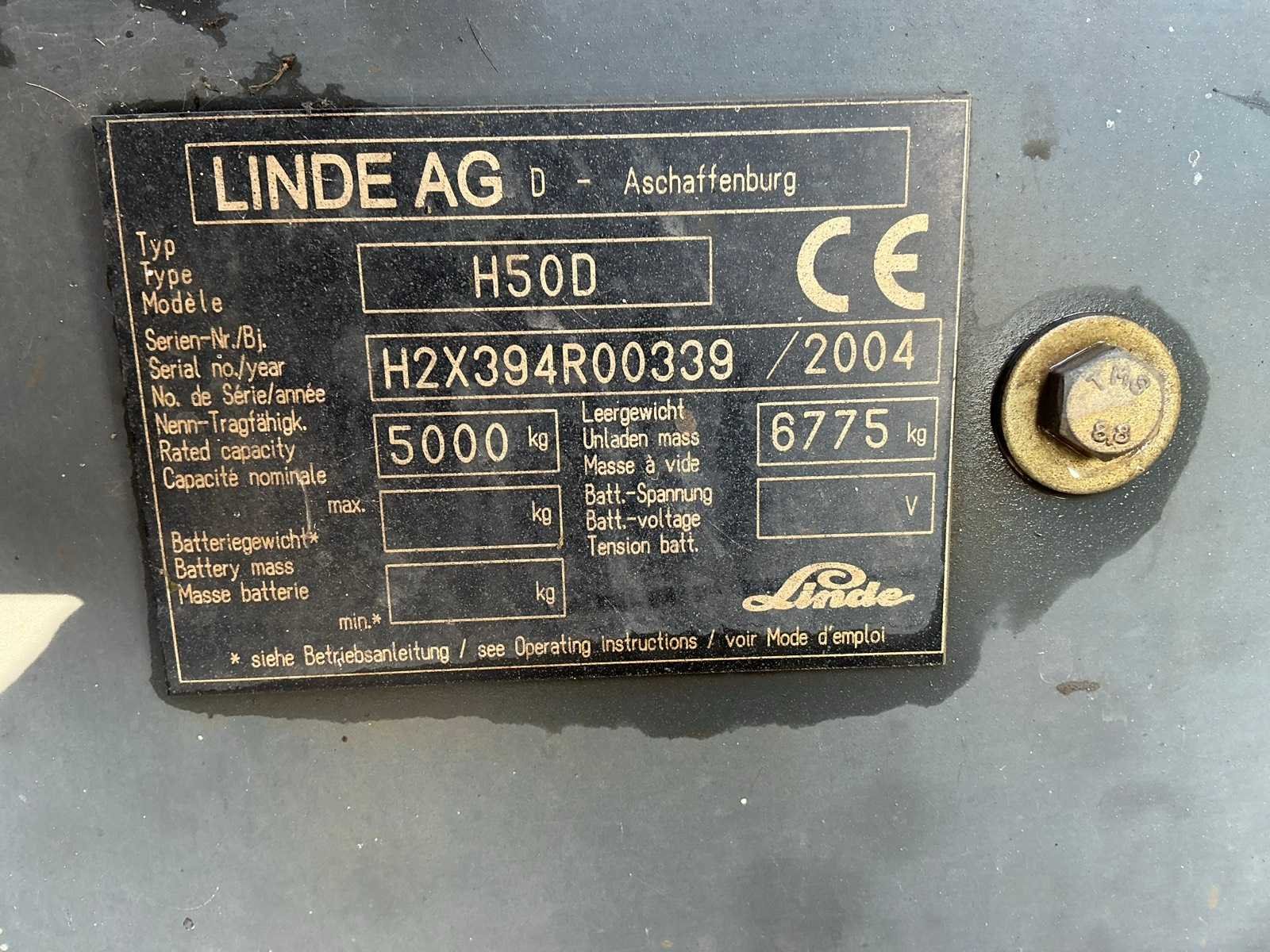 Voorzien van Volkswagen dieselmotor. Merk: Linde Type: H50D Bouwjaar: 2004 Serienummer: H2X394R00339 Brandstof: diesel Kenteken: TSN-64-R Mast: Triple Soort band: Volrubber banden Aantal wielen: 4 Afgelezen urenstand: 118592 Free-lift: true Side-shift: true Hydraulisch verstelbare lepels: true Eigen gewicht: 7000kg Hefvermogen: 4500kg Lepellengte: 2370mm Max. hefhoogte: 4700mm Minimale doorrijhoogte: 2500mm Totale afmeting L: 5600mm Totale afmeting Breedte: 1860mm Totale afmeting Hoogte: 2500mm Diesel: true
