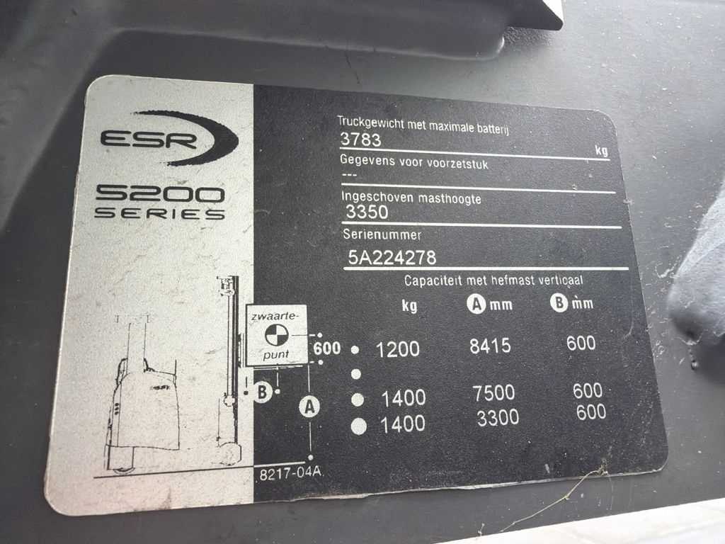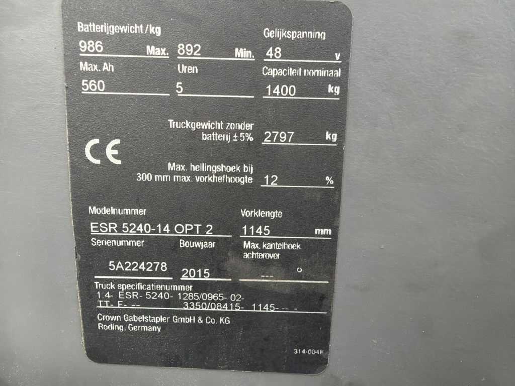 Geen oplader, werkende reachtruck, accu laadt niet meer op door elektrisch defect, veiligheidskooi heeft aanrijdschade Merk: Crown Type: ESR 5240-14 Bouwjaar: 2015 Serienummer: 5A224278 Brandstof: Elektrisch Aantal wielen: 3 Afgelezen urenstand: 4141 Free-lift: true Side-shift: true Triple mast: true Hefvermogen: 1200kg Lepellengte: 1200mm Min. hefhoogte: 50mm Max. hefhoogte: 8415mm Hefhoogte: 8415mm Minimale doorrijhoogte: 3350mm Totale afmeting L: 2300mm Totale afmeting Breedte: 1500mm Totale afmeting Hoogte: 3350mm