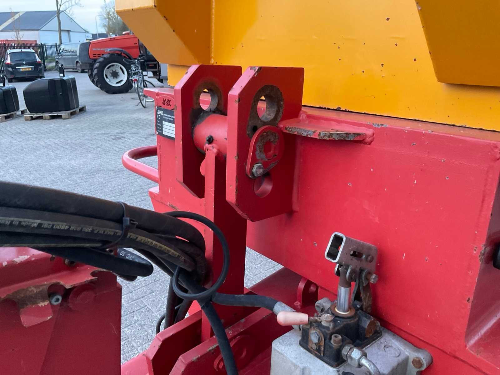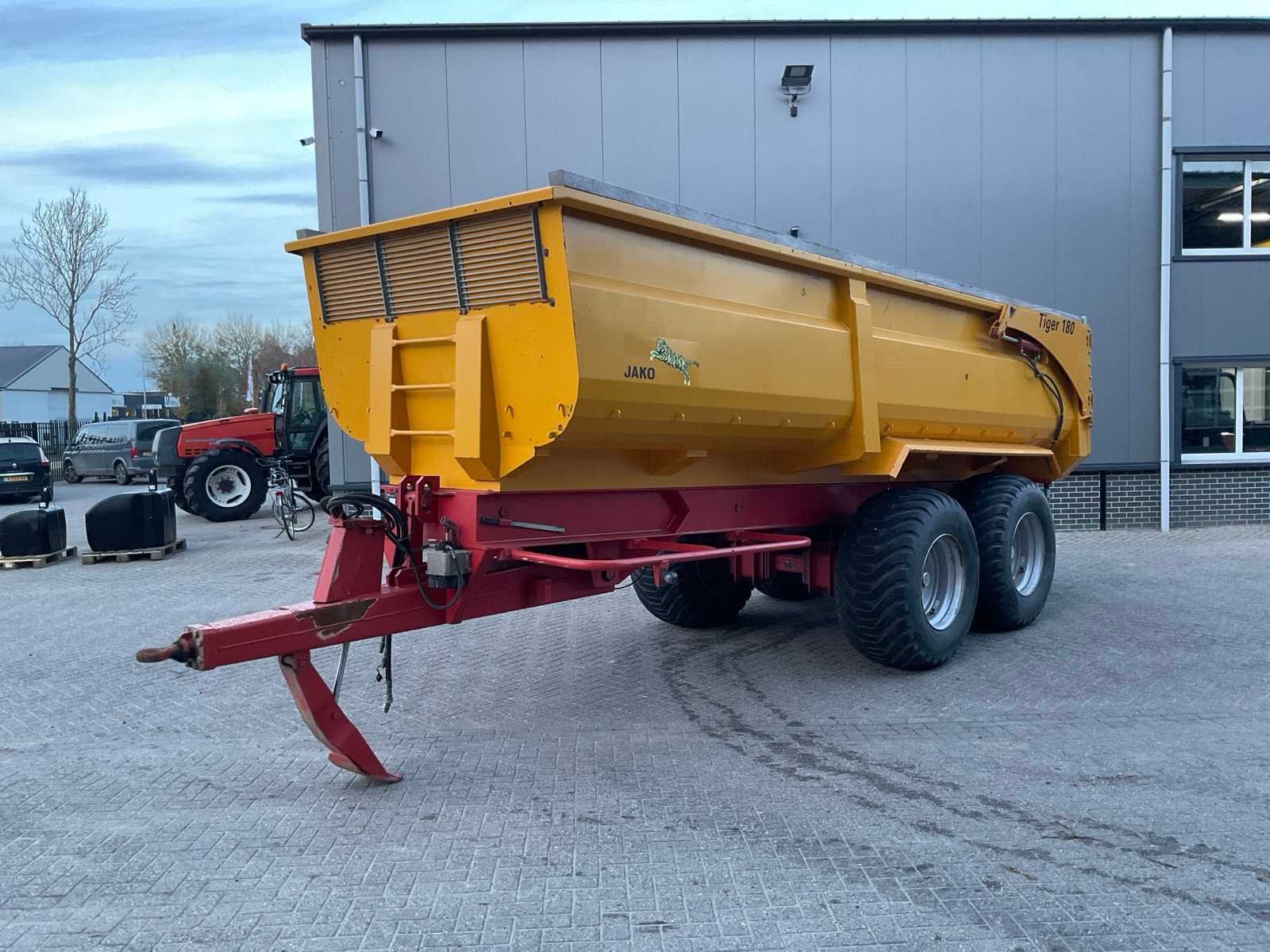 Hydraulische steunpoot, verstelbare disselhoogte, hydraulisch achterschot, afhankelijk pendelonderstel, doorkijkrooster met afdichtplaat, graanschot Merk: Jako Type: Tiger 180 Bouwjaar: 2015 Serienummer: 2200 Kenteken: LJX-50-K Aantal assen: 2 Bandenmaat: 600/55-26.5 Altura Max. snelheid: 40km/h Hydraulische remmen: true