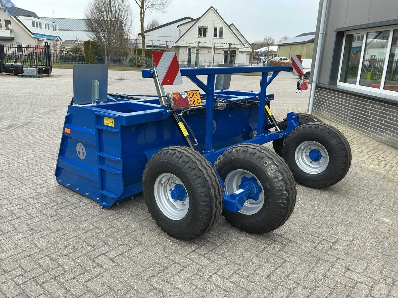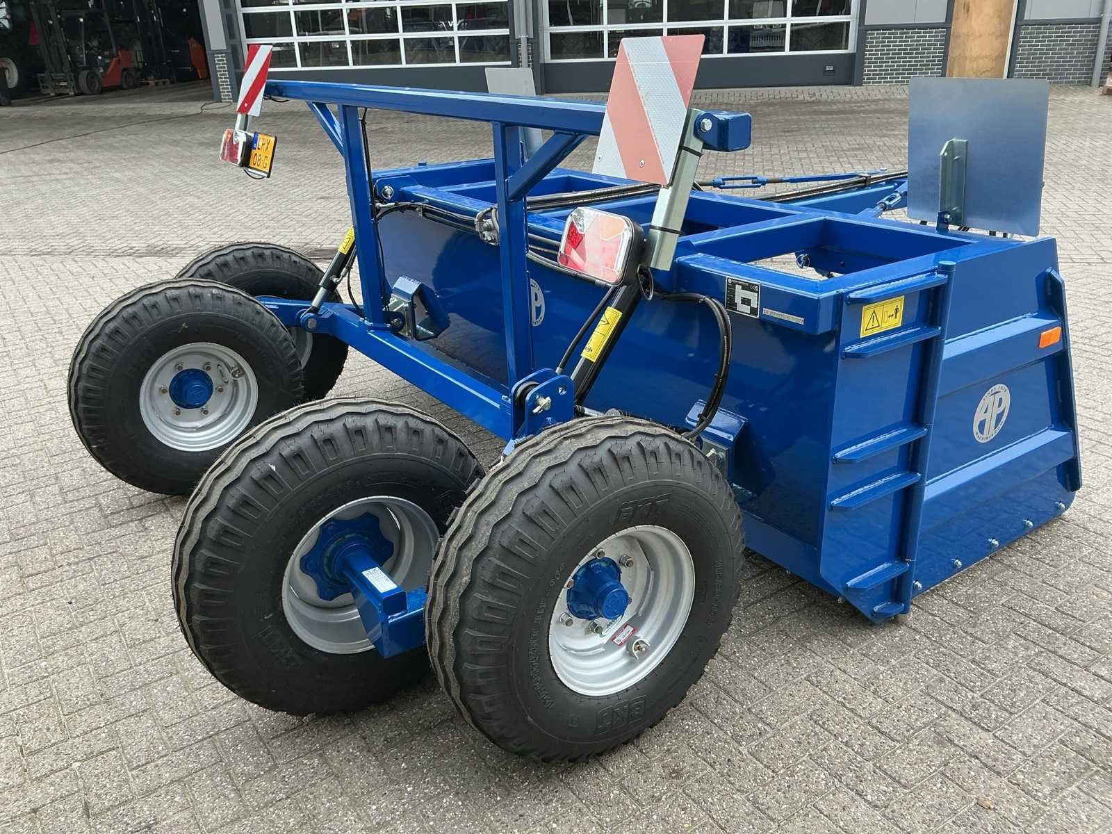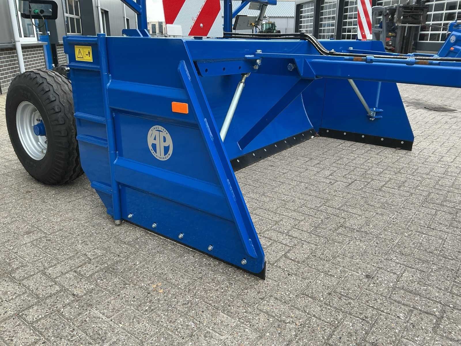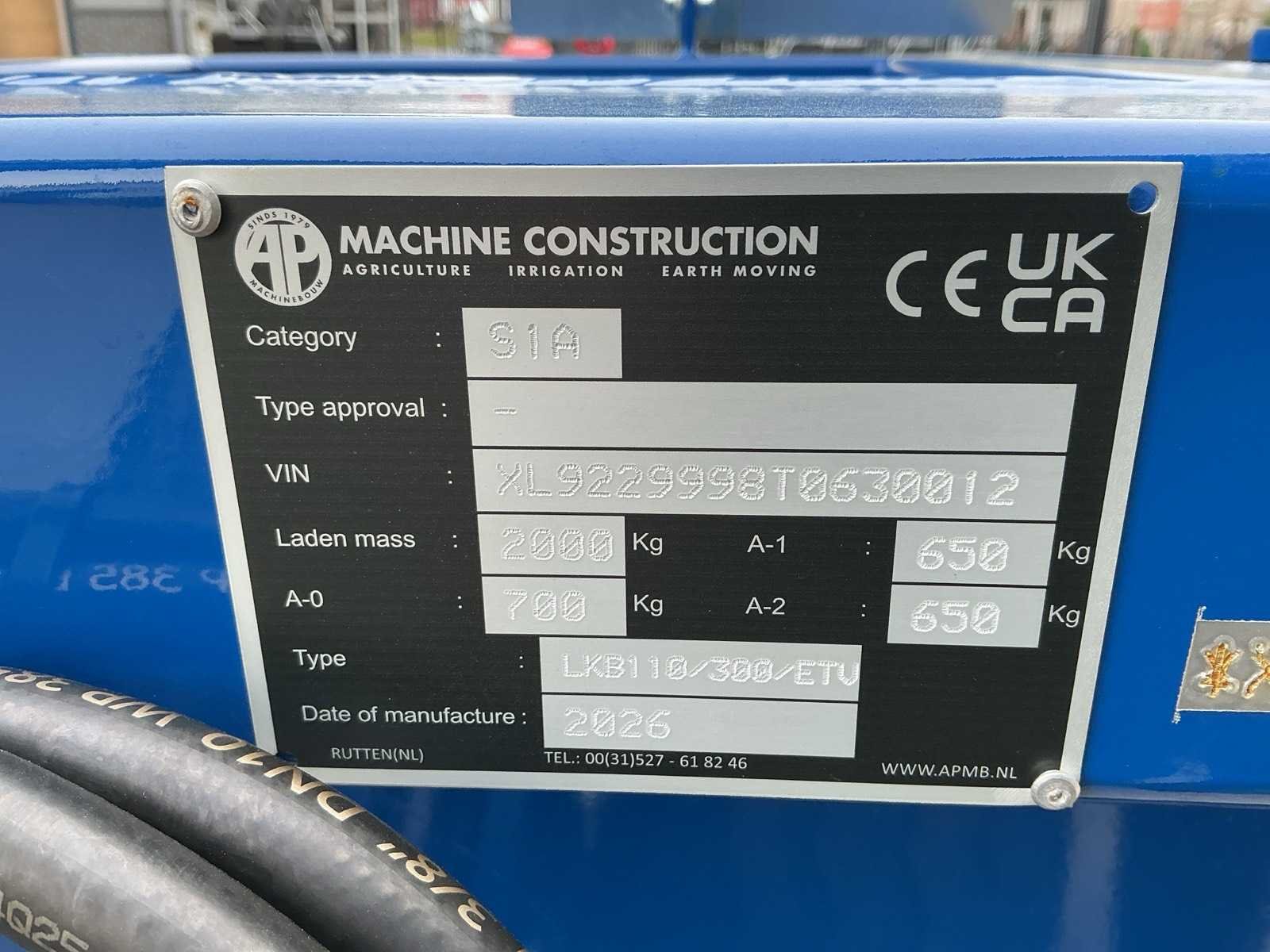 Werkbreedte 2850-4850mm met mechanische deuren, Is voorzien van: enkel talud verstelling aan rechterzijde, Bordhoogte 1000mm, demontabele trekboom, Brede BKT-banden 11.5/80-15.3, Alle draaipunten zijn gelagerd, Demontabel Hardox messen, Wegverlichting met verbredingsborden, wordt geleverd met Nederlandse kentekenplaat Merk: AP Type: LKB100/300 ETV Bouwjaar: 2026 Serienummer: XL9229998T0630012 Kenteken: LRX-08-G Werkbreedte: 4850mm Aantal wielen: 4 Eigen gewicht: 800kg Totale afmeting L: 5000mm Totale afmeting Breedte: 3000mm Totale afmeting Hoogte: 1400mm