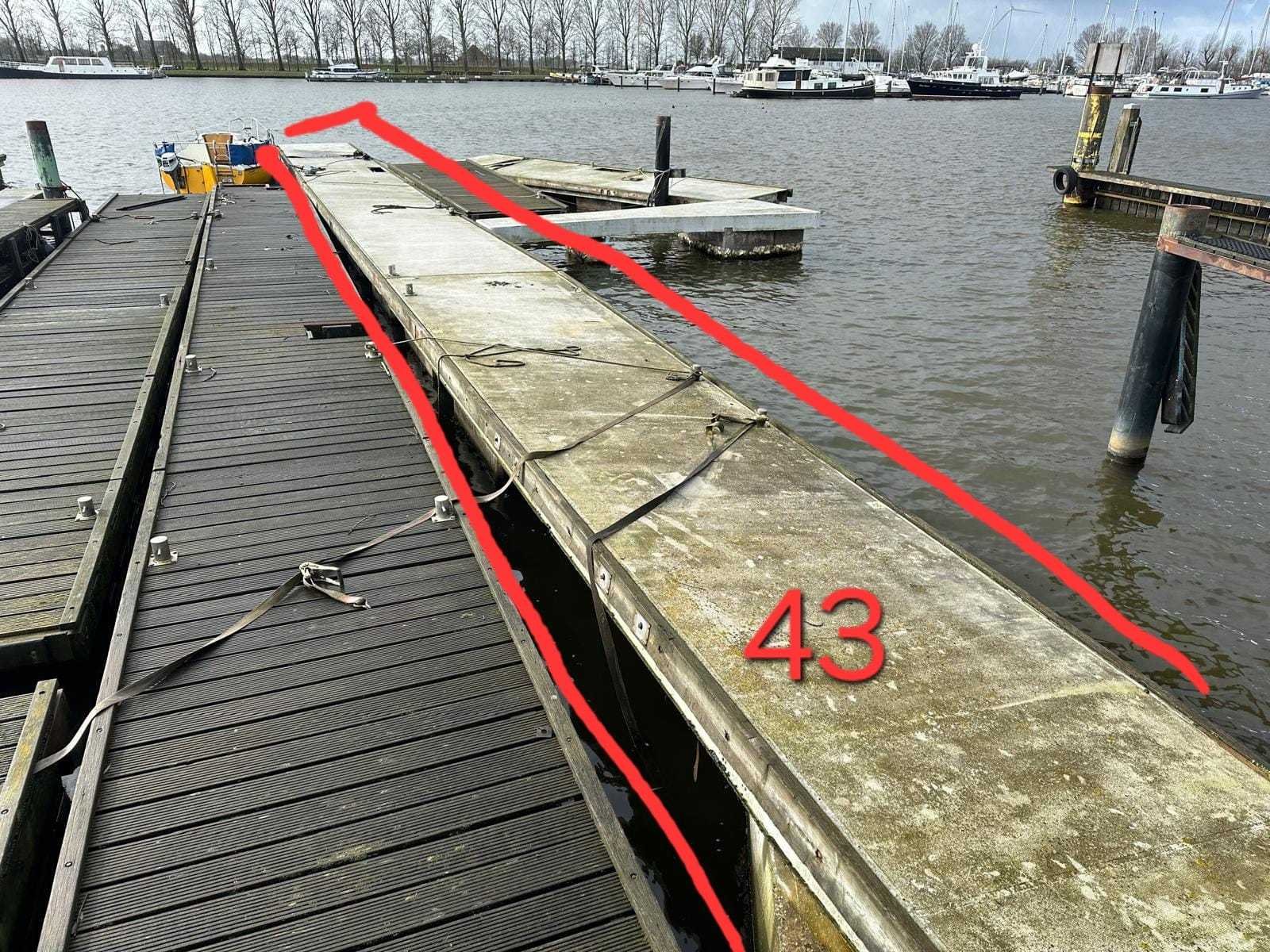 Materiaal piepschuim, omhulsel beton. 3x 10 meter lang x 2,15 breedt. Hoogte vanaf waterlijn +/- 60 cm. Laden is mogelijk, kosten € 175,- Laden en ophalen is alleen mogelijk op de ophaaldag!