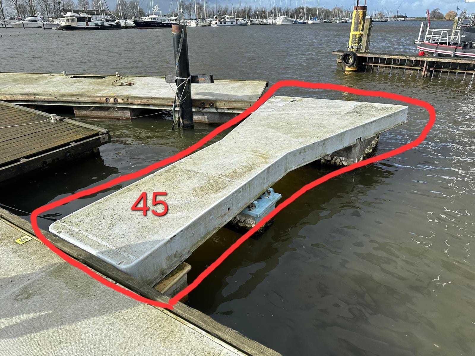5.3 Meter lang, 1 meter breedt, andere zijde 2.5 meter. Materiaal piepschuim, omhulsel beton. Hoogte vanaf waterlijn +/- 60 cm. Laden is mogelijk, kosten € 175,- Laden en ophalen is alleen mogelijk op de ophaaldag!